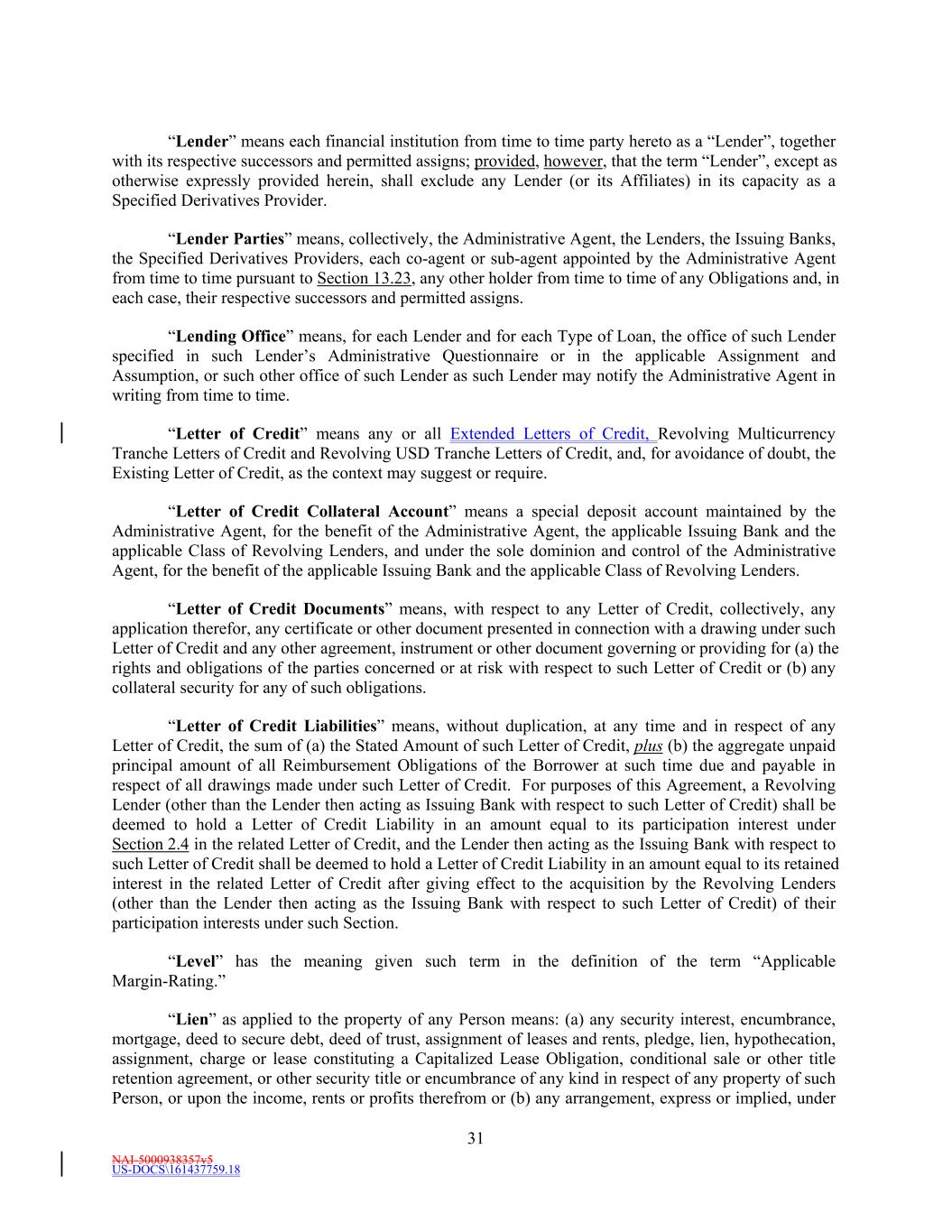 NAI-5000938357v5 US-DOCS\161437759.18 31 “Lender” means each financial institution from time to time party hereto as a “Lender”, together with its respective successors and permitted assigns; provided, however, that the term “Lender”, except as otherwise expressly provided herein, shall exclude any Lender (or its Affiliates) in its capacity as a Specified Derivatives Provider. “Lender Parties” means, collectively, the Administrative Agent, the Lenders, the Issuing Banks, the Specified Derivatives Providers, each co-agent or sub-agent appointed by the Administrative Agent from time to time pursuant to Section 13.23, any other holder from time to time of any Obligations and, in each case, their respective successors and permitted assigns. “Lending Office” means, for each Lender and for each Type of Loan, the office of such Lender specified in such Lender’s Administrative Questionnaire or in the applicable Assignment and Assumption, or such other office of such Lender as such Lender may notify the Administrative Agent in writing from time to time. “Letter of Credit” means any or all Extended Letters of Credit, Revolving Multicurrency Tranche Letters of Credit and Revolving USD Tranche Letters of Credit, and, for avoidance of doubt, the Existing Letter of Credit, as the context may suggest or require. “Letter of Credit Collateral Account” means a special deposit account maintained by the Administrative Agent, for the benefit of the Administrative Agent, the applicable Issuing Bank and the applicable Class of Revolving Lenders, and under the sole dominion and control of the Administrative Agent, for the benefit of the applicable Issuing Bank and the applicable Class of Revolving Lenders. “Letter of Credit Documents” means, with respect to any Letter of Credit, collectively, any application therefor, any certificate or other document presented in connection with a drawing under such Letter of Credit and any other agreement, instrument or other document governing or providing for (a) the rights and obligations of the parties concerned or at risk with respect to such Letter of Credit or (b) any collateral security for any of such obligations. “Letter of Credit Liabilities” means, without duplication, at any time and in respect of any Letter of Credit, the sum of (a) the Stated Amount of such Letter of Credit, plus (b) the aggregate unpaid principal amount of all Reimbursement Obligations of the Borrower at such time due and payable in respect of all drawings made under such Letter of Credit. For purposes of this Agreement, a Revolving Lender (other than the Lender then acting as Issuing Bank with respect to such Letter of Credit) shall be deemed to hold a Letter of Credit Liability in an amount equal to its participation interest under Section 2.4 in the related Letter of Credit, and the Lender then acting as the Issuing Bank with respect to such Letter of Credit shall be deemed to hold a Letter of Credit Liability in an amount equal to its retained interest in the related Letter of Credit after giving effect to the acquisition by the Revolving Lenders (other than the Lender then acting as the Issuing Bank with respect to such Letter of Credit) of their participation interests under such Section. “Level” has the meaning given such term in the definition of the term “Applicable Margin-Rating.” “Lien” as applied to the property of any Person means: (a) any security interest, encumbrance, mortgage, deed to secure debt, deed of trust, assignment of leases and rents, pledge, lien, hypothecation, assignment, charge or lease constituting a Capitalized Lease Obligation, conditional sale or other title retention agreement, or other security title or encumbrance of any kind in respect of any property of such Person, or upon the income, rents or profits therefrom or (b) any arrangement, express or implied, under