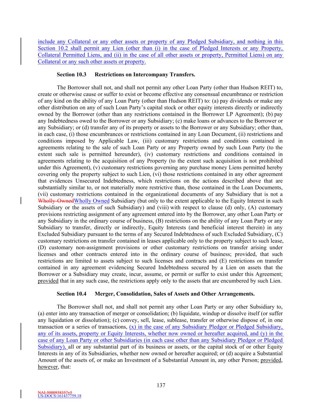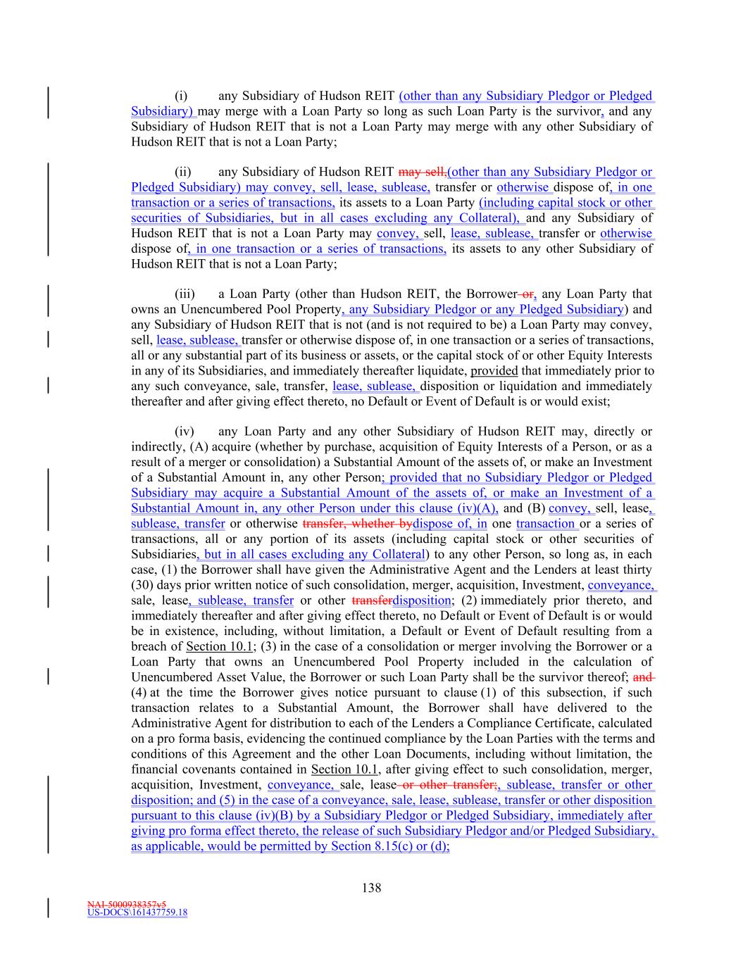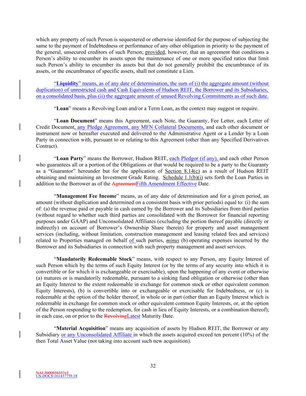 NAI-5000938357v5 US-DOCS\161437759.18 32 which any property of such Person is sequestered or otherwise identified for the purpose of subjecting the same to the payment of Indebtedness or performance of any other obligation in priority to the payment of the general, unsecured creditors of such Person; provided, however, that an agreement that conditions a Person’s ability to encumber its assets upon the maintenance of one or more specified ratios that limit such Person’s ability to encumber its assets but that do not generally prohibit the encumbrance of its assets, or the encumbrance of specific assets, shall not constitute a Lien. “Liquidity” means, as of any date of determination, the sum of (i) the aggregate amount (without duplication) of unrestricted cash and Cash Equivalents of Hudson REIT, the Borrower and its Subsidiaries, on a consolidated basis, plus (ii) the aggregate amount of unused Revolving Commitments as of such date. “Loan” means a Revolving Loan and/or a Term Loan, as the context may suggest or require. “Loan Document” means this Agreement, each Note, the Guaranty, Fee Letter, each Letter of Credit Document, any Pledge Agreement, any MFN Collateral Documents, and each other document or instrument now or hereafter executed and delivered to the Administrative Agent or a Lender by a Loan Party in connection with, pursuant to or relating to this Agreement (other than any Specified Derivatives Contract). “Loan Party” means the Borrower, Hudson REIT, each Pledgor (if any), and each other Person who guarantees all or a portion of the Obligations or that would be required to be a party to the Guaranty as a “Guarantor” hereunder but for the application of Section 8.14(c) as a result of Hudson REIT obtaining and maintaining an Investment Grade Rating. Schedule 1.1(b)(i) sets forth the Loan Parties in addition to the Borrower as of the AgreementFifth Amendment Effective Date. “Management Fee Income” means, as of any date of determination and for a given period, an amount (without duplication and determined on a consistent basis with prior periods) equal to: (i) the sum of: (a) the revenue paid or payable in cash earned by the Borrower and its Subsidiaries from third parties (without regard to whether such third parties are consolidated with the Borrower for financial reporting purposes under GAAP) and Unconsolidated Affiliates (excluding the portion thereof payable (directly or indirectly) on account of Borrower’s Ownership Share therein) for property and asset management services (including, without limitation, construction management and leasing related fees and services) related to Properties managed on behalf of such parties, minus (b) operating expenses incurred by the Borrower and its Subsidiaries in connection with such property management and asset services. “Mandatorily Redeemable Stock” means, with respect to any Person, any Equity Interest of such Person which by the terms of such Equity Interest (or by the terms of any security into which it is convertible or for which it is exchangeable or exercisable), upon the happening of any event or otherwise (a) matures or is mandatorily redeemable, pursuant to a sinking fund obligation or otherwise (other than an Equity Interest to the extent redeemable in exchange for common stock or other equivalent common Equity Interests), (b) is convertible into or exchangeable or exercisable for Indebtedness, or (c) is redeemable at the option of the holder thereof, in whole or in part (other than an Equity Interest which is redeemable in exchange for common stock or other equivalent common Equity Interests, or, at the option of the Person responding to the redemption, for cash in lieu of Equity Interests, or a combination thereof); in each case, on or prior to the RevolvingLatest Maturity Date. “Material Acquisition” means any acquisition of assets by Hudson REIT, the Borrower or any Subsidiary or any Unconsolidated Affiliate in which the assets acquired exceed ten percent (10%) of the then Total Asset Value (not taking into account such new acquisition).