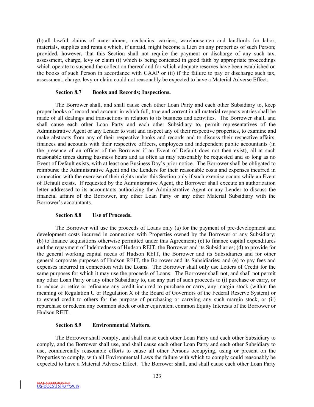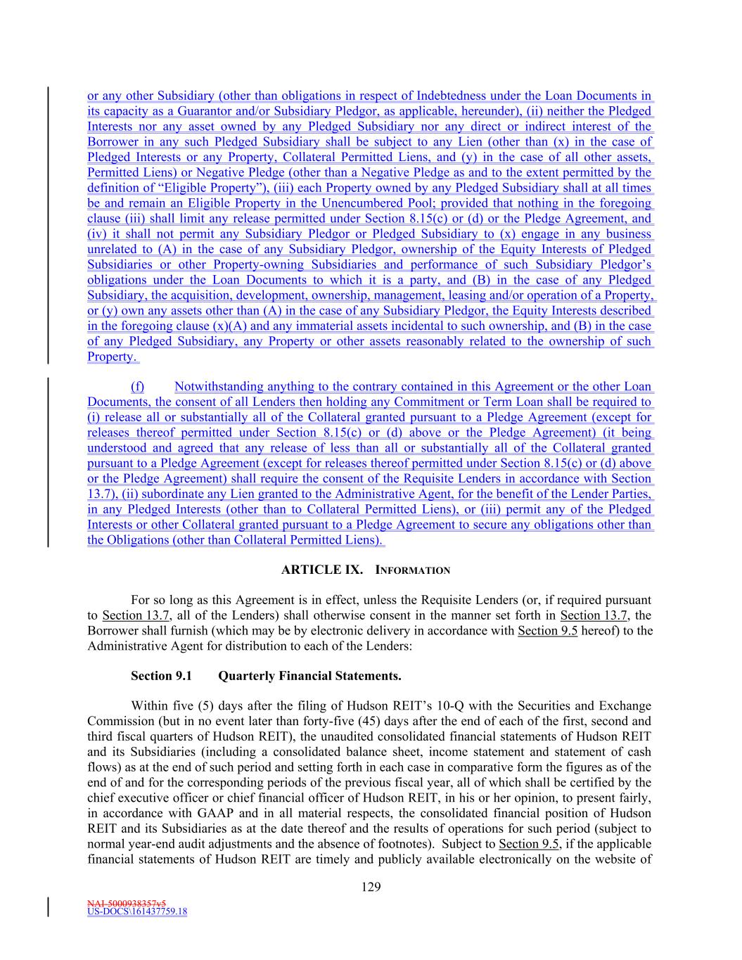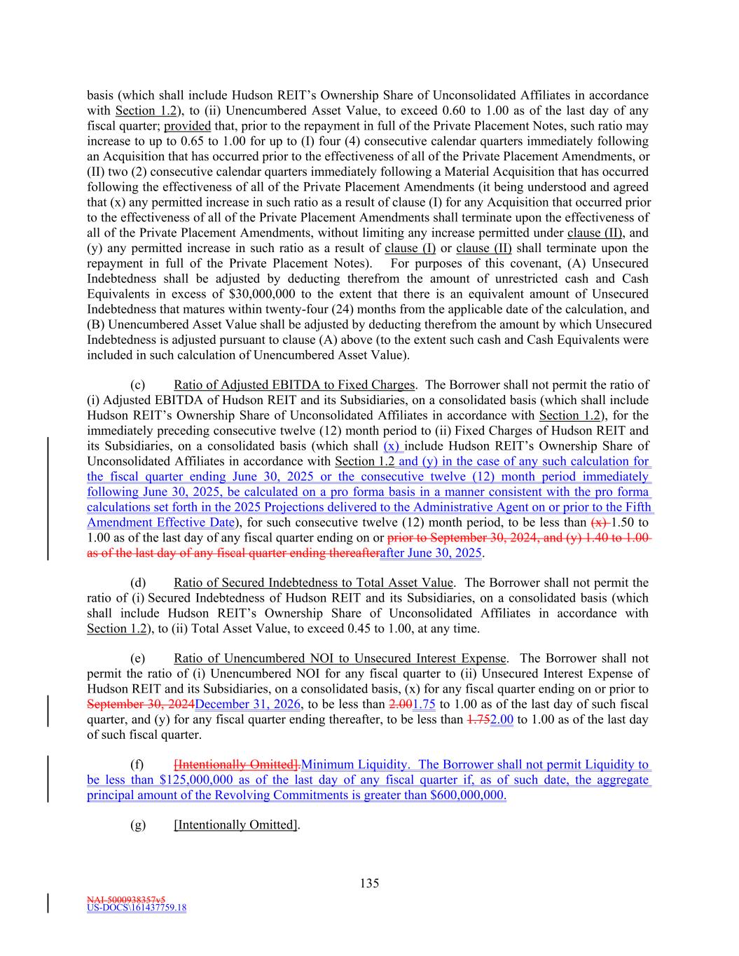 NAI-5000938357v5 US-DOCS\161437759.18 32 which any property of such Person is sequestered or otherwise identified for the purpose of subjecting the same to the payment of Indebtedness or performance of any other obligation in priority to the payment of the general, unsecured creditors of such Person; provided, however, that an agreement that conditions a Person’s ability to encumber its assets upon the maintenance of one or more specified ratios that limit such Person’s ability to encumber its assets but that do not generally prohibit the encumbrance of its assets, or the encumbrance of specific assets, shall not constitute a Lien. “Liquidity” means, as of any date of determination, the sum of (i) the aggregate amount (without duplication) of unrestricted cash and Cash Equivalents of Hudson REIT, the Borrower and its Subsidiaries, on a consolidated basis, plus (ii) the aggregate amount of unused Revolving Commitments as of such date. “Loan” means a Revolving Loan and/or a Term Loan, as the context may suggest or require. “Loan Document” means this Agreement, each Note, the Guaranty, Fee Letter, each Letter of Credit Document, any Pledge Agreement, any MFN Collateral Documents, and each other document or instrument now or hereafter executed and delivered to the Administrative Agent or a Lender by a Loan Party in connection with, pursuant to or relating to this Agreement (other than any Specified Derivatives Contract). “Loan Party” means the Borrower, Hudson REIT, each Pledgor (if any), and each other Person who guarantees all or a portion of the Obligations or that would be required to be a party to the Guaranty as a “Guarantor” hereunder but for the application of Section 8.14(c) as a result of Hudson REIT obtaining and maintaining an Investment Grade Rating. Schedule 1.1(b)(i) sets forth the Loan Parties in addition to the Borrower as of the AgreementFifth Amendment Effective Date. “Management Fee Income” means, as of any date of determination and for a given period, an amount (without duplication and determined on a consistent basis with prior periods) equal to: (i) the sum of: (a) the revenue paid or payable in cash earned by the Borrower and its Subsidiaries from third parties (without regard to whether such third parties are consolidated with the Borrower for financial reporting purposes under GAAP) and Unconsolidated Affiliates (excluding the portion thereof payable (directly or indirectly) on account of Borrower’s Ownership Share therein) for property and asset management services (including, without limitation, construction management and leasing related fees and services) related to Properties managed on behalf of such parties, minus (b) operating expenses incurred by the Borrower and its Subsidiaries in connection with such property management and asset services. “Mandatorily Redeemable Stock” means, with respect to any Person, any Equity Interest of such Person which by the terms of such Equity Interest (or by the terms of any security into which it is convertible or for which it is exchangeable or exercisable), upon the happening of any event or otherwise (a) matures or is mandatorily redeemable, pursuant to a sinking fund obligation or otherwise (other than an Equity Interest to the extent redeemable in exchange for common stock or other equivalent common Equity Interests), (b) is convertible into or exchangeable or exercisable for Indebtedness, or (c) is redeemable at the option of the holder thereof, in whole or in part (other than an Equity Interest which is redeemable in exchange for common stock or other equivalent common Equity Interests, or, at the option of the Person responding to the redemption, for cash in lieu of Equity Interests, or a combination thereof); in each case, on or prior to the RevolvingLatest Maturity Date. “Material Acquisition” means any acquisition of assets by Hudson REIT, the Borrower or any Subsidiary or any Unconsolidated Affiliate in which the assets acquired exceed ten percent (10%) of the then Total Asset Value (not taking into account such new acquisition).