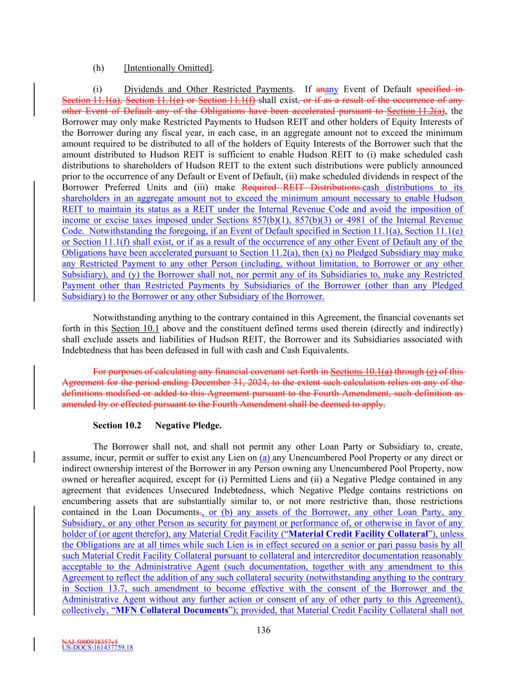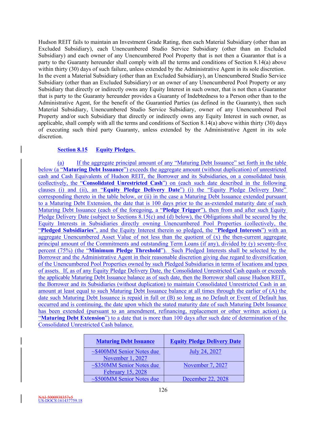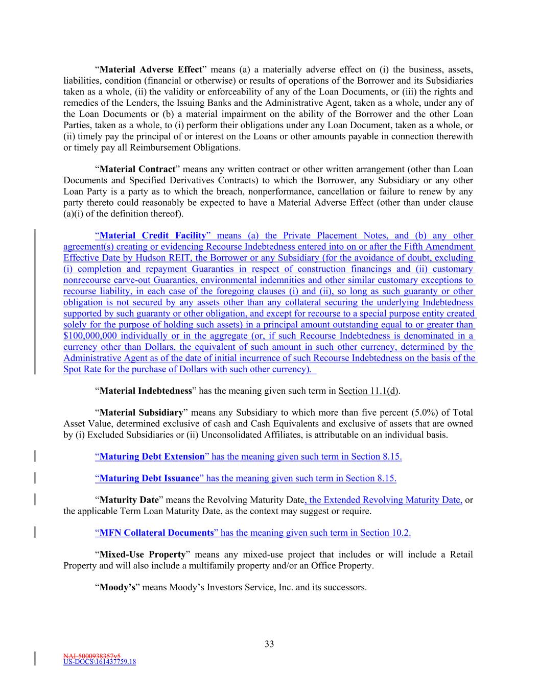 NAI-5000938357v5 US-DOCS\161437759.18 33 “Material Adverse Effect” means (a) a materially adverse effect on (i) the business, assets, liabilities, condition (financial or otherwise) or results of operations of the Borrower and its Subsidiaries taken as a whole, (ii) the validity or enforceability of any of the Loan Documents, or (iii) the rights and remedies of the Lenders, the Issuing Banks and the Administrative Agent, taken as a whole, under any of the Loan Documents or (b) a material impairment on the ability of the Borrower and the other Loan Parties, taken as a whole, to (i) perform their obligations under any Loan Document, taken as a whole, or (ii) timely pay the principal of or interest on the Loans or other amounts payable in connection therewith or timely pay all Reimbursement Obligations. “Material Contract” means any written contract or other written arrangement (other than Loan Documents and Specified Derivatives Contracts) to which the Borrower, any Subsidiary or any other Loan Party is a party as to which the breach, nonperformance, cancellation or failure to renew by any party thereto could reasonably be expected to have a Material Adverse Effect (other than under clause (a)(i) of the definition thereof). “Material Credit Facility” means (a) the Private Placement Notes, and (b) any other agreement(s) creating or evidencing Recourse Indebtedness entered into on or after the Fifth Amendment Effective Date by Hudson REIT, the Borrower or any Subsidiary (for the avoidance of doubt, excluding (i) completion and repayment Guaranties in respect of construction financings and (ii) customary nonrecourse carve-out Guaranties, environmental indemnities and other similar customary exceptions to recourse liability, in each case of the foregoing clauses (i) and (ii), so long as such guaranty or other obligation is not secured by any assets other than any collateral securing the underlying Indebtedness supported by such guaranty or other obligation, and except for recourse to a special purpose entity created solely for the purpose of holding such assets) in a principal amount outstanding equal to or greater than $100,000,000 individually or in the aggregate (or, if such Recourse Indebtedness is denominated in a currency other than Dollars, the equivalent of such amount in such other currency, determined by the Administrative Agent as of the date of initial incurrence of such Recourse Indebtedness on the basis of the Spot Rate for the purchase of Dollars with such other currency). “Material Indebtedness” has the meaning given such term in Section 11.1(d). “Material Subsidiary” means any Subsidiary to which more than five percent (5.0%) of Total Asset Value, determined exclusive of cash and Cash Equivalents and exclusive of assets that are owned by (i) Excluded Subsidiaries or (ii) Unconsolidated Affiliates, is attributable on an individual basis. “Maturing Debt Extension” has the meaning given such term in Section 8.15. “Maturing Debt Issuance” has the meaning given such term in Section 8.15. “Maturity Date” means the Revolving Maturity Date, the Extended Revolving Maturity Date, or the applicable Term Loan Maturity Date, as the context may suggest or require. “MFN Collateral Documents” has the meaning given such term in Section 10.2. “Mixed-Use Property” means any mixed-use project that includes or will include a Retail Property and will also include a multifamily property and/or an Office Property. “Moody’s” means Moody’s Investors Service, Inc. and its successors.