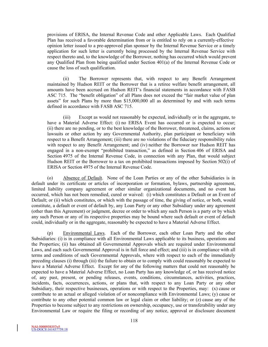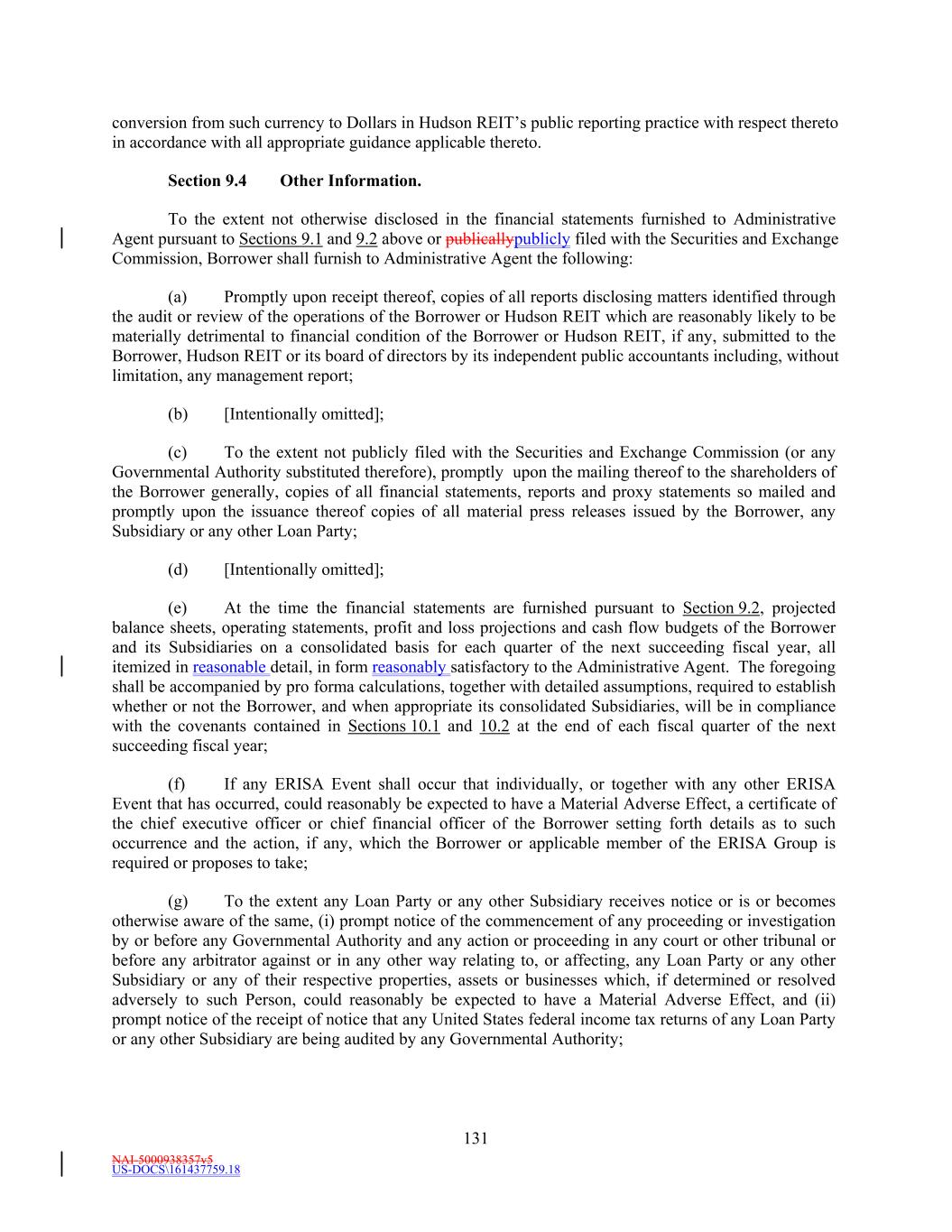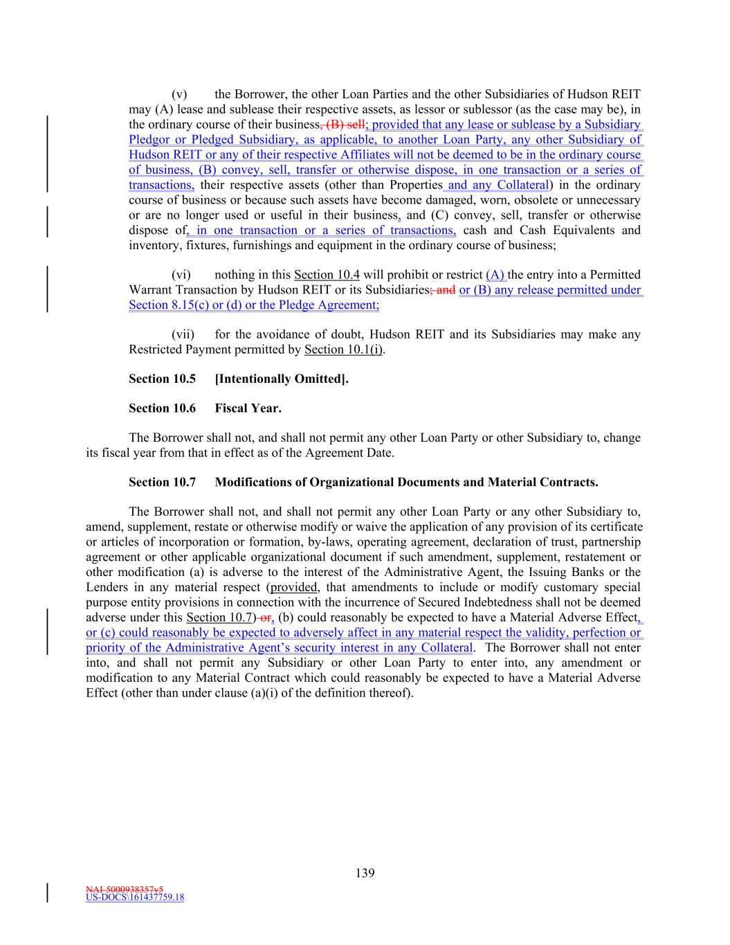 NAI-5000938357v5 US-DOCS\161437759.18 33 “Material Adverse Effect” means (a) a materially adverse effect on (i) the business, assets, liabilities, condition (financial or otherwise) or results of operations of the Borrower and its Subsidiaries taken as a whole, (ii) the validity or enforceability of any of the Loan Documents, or (iii) the rights and remedies of the Lenders, the Issuing Banks and the Administrative Agent, taken as a whole, under any of the Loan Documents or (b) a material impairment on the ability of the Borrower and the other Loan Parties, taken as a whole, to (i) perform their obligations under any Loan Document, taken as a whole, or (ii) timely pay the principal of or interest on the Loans or other amounts payable in connection therewith or timely pay all Reimbursement Obligations. “Material Contract” means any written contract or other written arrangement (other than Loan Documents and Specified Derivatives Contracts) to which the Borrower, any Subsidiary or any other Loan Party is a party as to which the breach, nonperformance, cancellation or failure to renew by any party thereto could reasonably be expected to have a Material Adverse Effect (other than under clause (a)(i) of the definition thereof). “Material Credit Facility” means (a) the Private Placement Notes, and (b) any other agreement(s) creating or evidencing Recourse Indebtedness entered into on or after the Fifth Amendment Effective Date by Hudson REIT, the Borrower or any Subsidiary (for the avoidance of doubt, excluding (i) completion and repayment Guaranties in respect of construction financings and (ii) customary nonrecourse carve-out Guaranties, environmental indemnities and other similar customary exceptions to recourse liability, in each case of the foregoing clauses (i) and (ii), so long as such guaranty or other obligation is not secured by any assets other than any collateral securing the underlying Indebtedness supported by such guaranty or other obligation, and except for recourse to a special purpose entity created solely for the purpose of holding such assets) in a principal amount outstanding equal to or greater than $100,000,000 individually or in the aggregate (or, if such Recourse Indebtedness is denominated in a currency other than Dollars, the equivalent of such amount in such other currency, determined by the Administrative Agent as of the date of initial incurrence of such Recourse Indebtedness on the basis of the Spot Rate for the purchase of Dollars with such other currency). “Material Indebtedness” has the meaning given such term in Section 11.1(d). “Material Subsidiary” means any Subsidiary to which more than five percent (5.0%) of Total Asset Value, determined exclusive of cash and Cash Equivalents and exclusive of assets that are owned by (i) Excluded Subsidiaries or (ii) Unconsolidated Affiliates, is attributable on an individual basis. “Maturing Debt Extension” has the meaning given such term in Section 8.15. “Maturing Debt Issuance” has the meaning given such term in Section 8.15. “Maturity Date” means the Revolving Maturity Date, the Extended Revolving Maturity Date, or the applicable Term Loan Maturity Date, as the context may suggest or require. “MFN Collateral Documents” has the meaning given such term in Section 10.2. “Mixed-Use Property” means any mixed-use project that includes or will include a Retail Property and will also include a multifamily property and/or an Office Property. “Moody’s” means Moody’s Investors Service, Inc. and its successors.