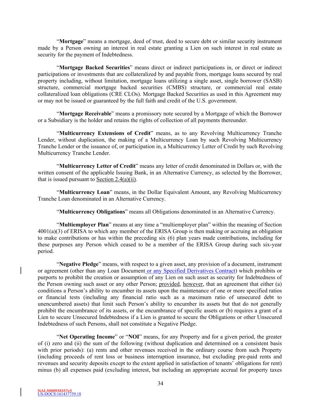 NAI-5000938357v5 US-DOCS\161437759.18 34 “Mortgage” means a mortgage, deed of trust, deed to secure debt or similar security instrument made by a Person owning an interest in real estate granting a Lien on such interest in real estate as security for the payment of Indebtedness. “Mortgage Backed Securities” means direct or indirect participations in, or direct or indirect participations or investments that are collateralized by and payable from, mortgage loans secured by real property including, without limitation, mortgage loans utilizing a single asset, single borrower (SASB) structure, commercial mortgage backed securities (CMBS) structure, or commercial real estate collateralized loan obligations (CRE CLOs). Mortgage Backed Securities as used in this Agreement may or may not be issued or guaranteed by the full faith and credit of the U.S. government. “Mortgage Receivable” means a promissory note secured by a Mortgage of which the Borrower or a Subsidiary is the holder and retains the rights of collection of all payments thereunder. “Multicurrency Extensions of Credit” means, as to any Revolving Multicurrency Tranche Lender, without duplication, the making of a Multicurrency Loan by such Revolving Multicurrency Tranche Lender or the issuance of, or participation in, a Multicurrency Letter of Credit by such Revolving Multicurrency Tranche Lender. “Multicurrency Letter of Credit” means any letter of credit denominated in Dollars or, with the written consent of the applicable Issuing Bank, in an Alternative Currency, as selected by the Borrower, that is issued pursuant to Section 2.4(a)(ii). “Multicurrency Loan” means, in the Dollar Equivalent Amount, any Revolving Multicurrency Tranche Loan denominated in an Alternative Currency. “Multicurrency Obligations” means all Obligations denominated in an Alternative Currency. “Multiemployer Plan” means at any time a “multiemployer plan” within the meaning of Section 4001(a)(3) of ERISA to which any member of the ERISA Group is then making or accruing an obligation to make contributions or has within the preceding six (6) plan years made contributions, including for these purposes any Person which ceased to be a member of the ERISA Group during such six-year period. “Negative Pledge” means, with respect to a given asset, any provision of a document, instrument or agreement (other than any Loan Document or any Specified Derivatives Contract) which prohibits or purports to prohibit the creation or assumption of any Lien on such asset as security for Indebtedness of the Person owning such asset or any other Person; provided, however, that an agreement that either (a) conditions a Person’s ability to encumber its assets upon the maintenance of one or more specified ratios or financial tests (including any financial ratio such as a maximum ratio of unsecured debt to unencumbered assets) that limit such Person’s ability to encumber its assets but that do not generally prohibit the encumbrance of its assets, or the encumbrance of specific assets or (b) requires a grant of a Lien to secure Unsecured Indebtedness if a Lien is granted to secure the Obligations or other Unsecured Indebtedness of such Persons, shall not constitute a Negative Pledge. “Net Operating Income” or “NOI” means, for any Property and for a given period, the greater of (i) zero and (ii) the sum of the following (without duplication and determined on a consistent basis with prior periods): (a) rents and other revenues received in the ordinary course from such Property (including proceeds of rent loss or business interruption insurance, but excluding pre-paid rents and revenues and security deposits except to the extent applied in satisfaction of tenants’ obligations for rent) minus (b) all expenses paid (excluding interest, but including an appropriate accrual for property taxes