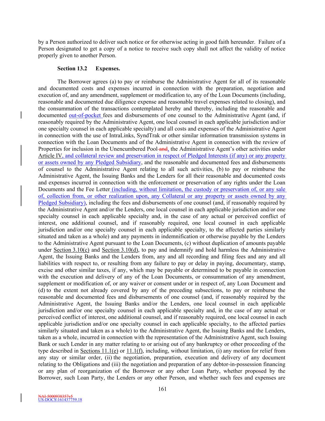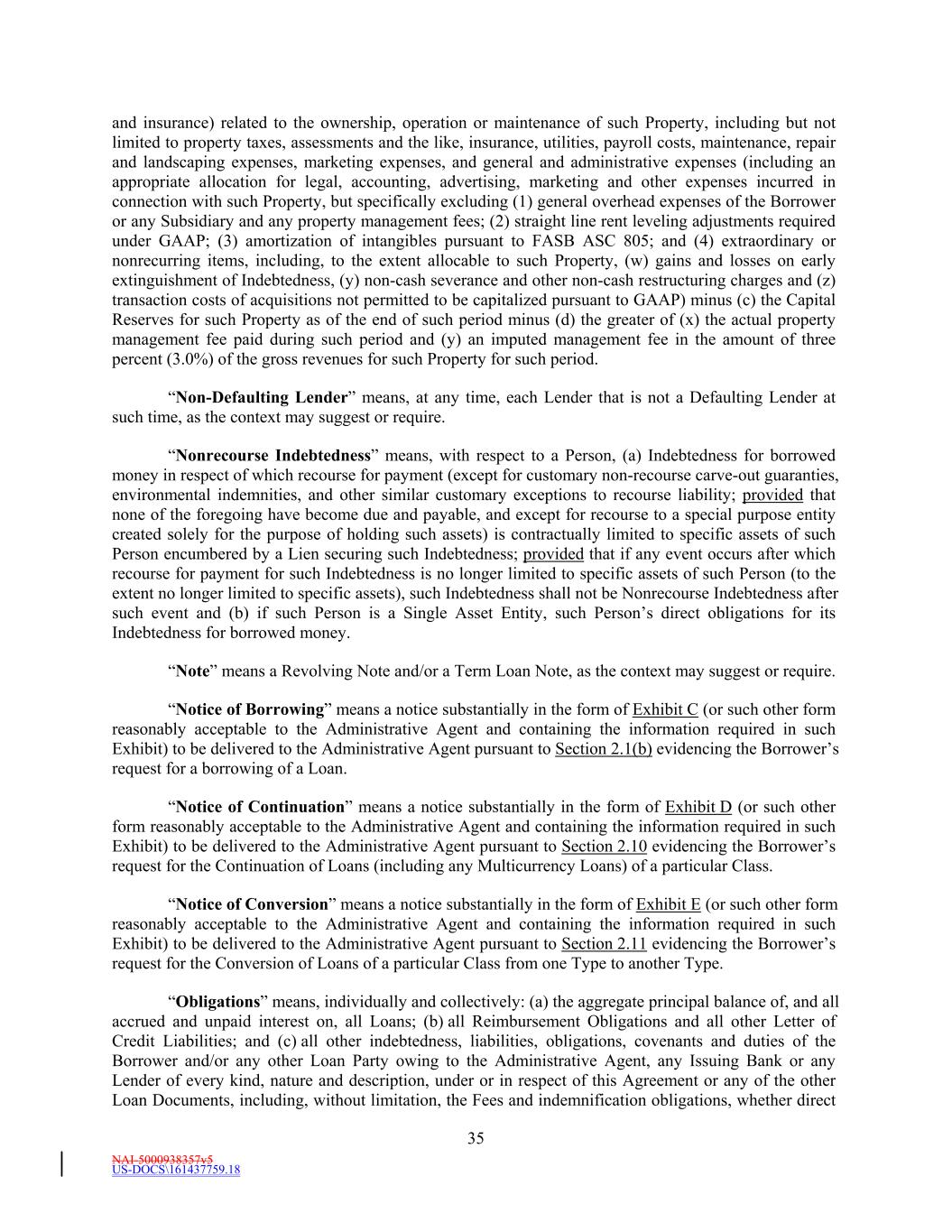 NAI-5000938357v5 US-DOCS\161437759.18 35 and insurance) related to the ownership, operation or maintenance of such Property, including but not limited to property taxes, assessments and the like, insurance, utilities, payroll costs, maintenance, repair and landscaping expenses, marketing expenses, and general and administrative expenses (including an appropriate allocation for legal, accounting, advertising, marketing and other expenses incurred in connection with such Property, but specifically excluding (1) general overhead expenses of the Borrower or any Subsidiary and any property management fees; (2) straight line rent leveling adjustments required under GAAP; (3) amortization of intangibles pursuant to FASB ASC 805; and (4) extraordinary or nonrecurring items, including, to the extent allocable to such Property, (w) gains and losses on early extinguishment of Indebtedness, (y) non-cash severance and other non-cash restructuring charges and (z) transaction costs of acquisitions not permitted to be capitalized pursuant to GAAP) minus (c) the Capital Reserves for such Property as of the end of such period minus (d) the greater of (x) the actual property management fee paid during such period and (y) an imputed management fee in the amount of three percent (3.0%) of the gross revenues for such Property for such period. “Non-Defaulting Lender” means, at any time, each Lender that is not a Defaulting Lender at such time, as the context may suggest or require. “Nonrecourse Indebtedness” means, with respect to a Person, (a) Indebtedness for borrowed money in respect of which recourse for payment (except for customary non-recourse carve-out guaranties, environmental indemnities, and other similar customary exceptions to recourse liability; provided that none of the foregoing have become due and payable, and except for recourse to a special purpose entity created solely for the purpose of holding such assets) is contractually limited to specific assets of such Person encumbered by a Lien securing such Indebtedness; provided that if any event occurs after which recourse for payment for such Indebtedness is no longer limited to specific assets of such Person (to the extent no longer limited to specific assets), such Indebtedness shall not be Nonrecourse Indebtedness after such event and (b) if such Person is a Single Asset Entity, such Person’s direct obligations for its Indebtedness for borrowed money. “Note” means a Revolving Note and/or a Term Loan Note, as the context may suggest or require. “Notice of Borrowing” means a notice substantially in the form of Exhibit C (or such other form reasonably acceptable to the Administrative Agent and containing the information required in such Exhibit) to be delivered to the Administrative Agent pursuant to Section 2.1(b) evidencing the Borrower’s request for a borrowing of a Loan. “Notice of Continuation” means a notice substantially in the form of Exhibit D (or such other form reasonably acceptable to the Administrative Agent and containing the information required in such Exhibit) to be delivered to the Administrative Agent pursuant to Section 2.10 evidencing the Borrower’s request for the Continuation of Loans (including any Multicurrency Loans) of a particular Class. “Notice of Conversion” means a notice substantially in the form of Exhibit E (or such other form reasonably acceptable to the Administrative Agent and containing the information required in such Exhibit) to be delivered to the Administrative Agent pursuant to Section 2.11 evidencing the Borrower’s request for the Conversion of Loans of a particular Class from one Type to another Type. “Obligations” means, individually and collectively: (a) the aggregate principal balance of, and all accrued and unpaid interest on, all Loans; (b) all Reimbursement Obligations and all other Letter of Credit Liabilities; and (c) all other indebtedness, liabilities, obligations, covenants and duties of the Borrower and/or any other Loan Party owing to the Administrative Agent, any Issuing Bank or any Lender of every kind, nature and description, under or in respect of this Agreement or any of the other Loan Documents, including, without limitation, the Fees and indemnification obligations, whether direct