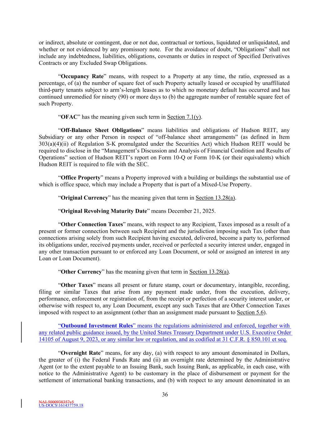 NAI-5000938357v5 US-DOCS\161437759.18 36 or indirect, absolute or contingent, due or not due, contractual or tortious, liquidated or unliquidated, and whether or not evidenced by any promissory note. For the avoidance of doubt, “Obligations” shall not include any indebtedness, liabilities, obligations, covenants or duties in respect of Specified Derivatives Contracts or any Excluded Swap Obligations. “Occupancy Rate” means, with respect to a Property at any time, the ratio, expressed as a percentage, of (a) the number of square feet of such Property actually leased or occupied by unaffiliated third-party tenants subject to arm’s-length leases as to which no monetary default has occurred and has continued unremedied for ninety (90) or more days to (b) the aggregate number of rentable square feet of such Property. “OFAC” has the meaning given such term in Section 7.1(y). “Off-Balance Sheet Obligations” means liabilities and obligations of Hudson REIT, any Subsidiary or any other Person in respect of “off-balance sheet arrangements” (as defined in Item 303(a)(4)(ii) of Regulation S-K promulgated under the Securities Act) which Hudson REIT would be required to disclose in the “Management’s Discussion and Analysis of Financial Condition and Results of Operations” section of Hudson REIT’s report on Form 10-Q or Form 10-K (or their equivalents) which Hudson REIT is required to file with the SEC. “Office Property” means a Property improved with a building or buildings the substantial use of which is office space, which may include a Property that is part of a Mixed-Use Property. “Original Currency” has the meaning given that term in Section 13.28(a). “Original Revolving Maturity Date” means December 21, 2025. “Other Connection Taxes” means, with respect to any Recipient, Taxes imposed as a result of a present or former connection between such Recipient and the jurisdiction imposing such Tax (other than connections arising solely from such Recipient having executed, delivered, become a party to, performed its obligations under, received payments under, received or perfected a security interest under, engaged in any other transaction pursuant to or enforced any Loan Document, or sold or assigned an interest in any Loan or Loan Document). “Other Currency” has the meaning given that term in Section 13.28(a). “Other Taxes” means all present or future stamp, court or documentary, intangible, recording, filing or similar Taxes that arise from any payment made under, from the execution, delivery, performance, enforcement or registration of, from the receipt or perfection of a security interest under, or otherwise with respect to, any Loan Document, except any such Taxes that are Other Connection Taxes imposed with respect to an assignment (other than an assignment made pursuant to Section 5.6). “Outbound Investment Rules” means the regulations administered and enforced, together with any related public guidance issued, by the United States Treasury Department under U.S. Executive Order 14105 of August 9, 2023, or any similar law or regulation, and as codified at 31 C.F.R. § 850.101 et seq. “Overnight Rate” means, for any day, (a) with respect to any amount denominated in Dollars, the greater of (i) the Federal Funds Rate and (ii) an overnight rate determined by the Administrative Agent (or to the extent payable to an Issuing Bank, such Issuing Bank, as applicable, in each case, with notice to the Administrative Agent) to be customary in the place of disbursement or payment for the settlement of international banking transactions, and (b) with respect to any amount denominated in an
