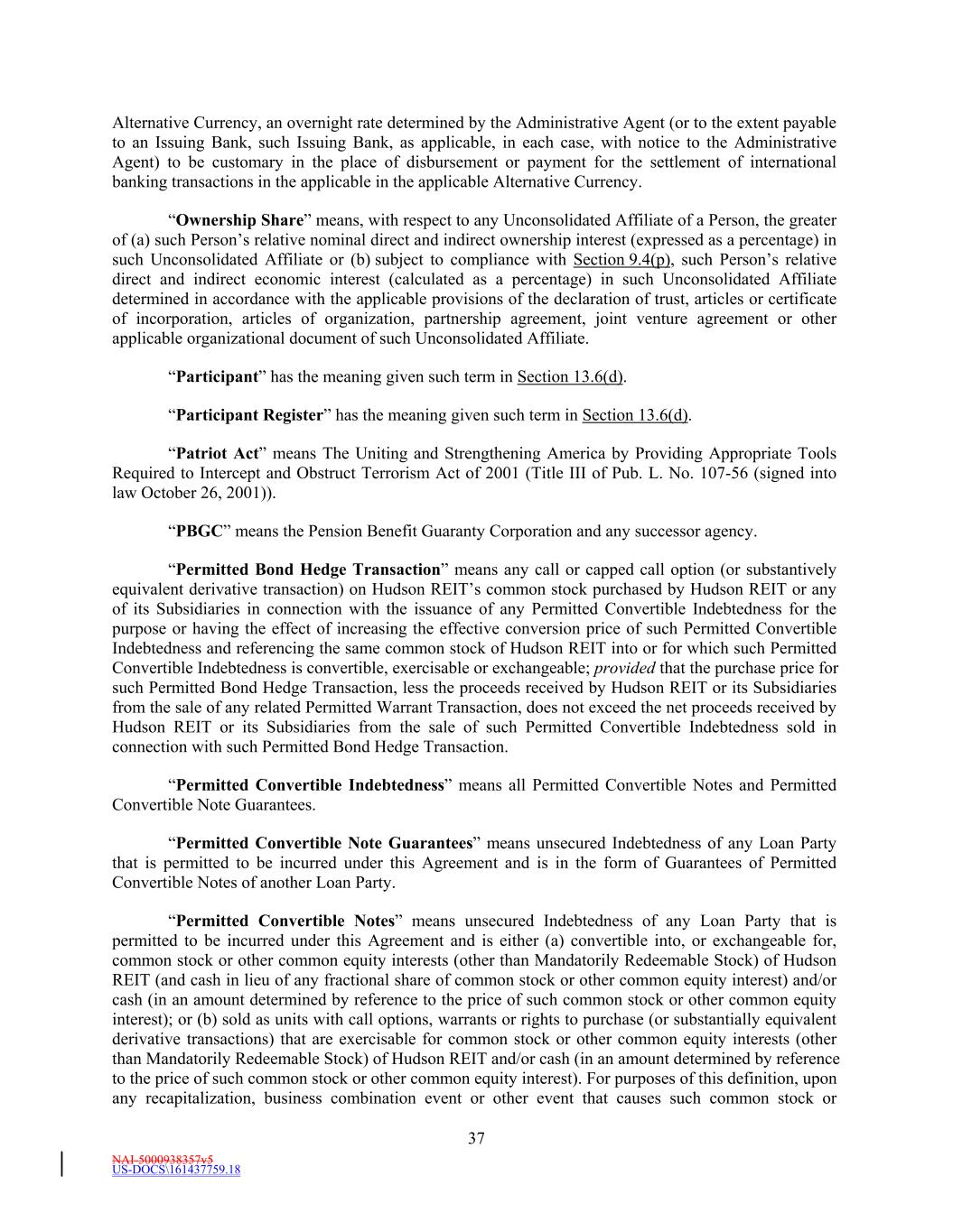 NAI-5000938357v5 US-DOCS\161437759.18 37 Alternative Currency, an overnight rate determined by the Administrative Agent (or to the extent payable to an Issuing Bank, such Issuing Bank, as applicable, in each case, with notice to the Administrative Agent) to be customary in the place of disbursement or payment for the settlement of international banking transactions in the applicable in the applicable Alternative Currency. “Ownership Share” means, with respect to any Unconsolidated Affiliate of a Person, the greater of (a) such Person’s relative nominal direct and indirect ownership interest (expressed as a percentage) in such Unconsolidated Affiliate or (b) subject to compliance with Section 9.4(p), such Person’s relative direct and indirect economic interest (calculated as a percentage) in such Unconsolidated Affiliate determined in accordance with the applicable provisions of the declaration of trust, articles or certificate of incorporation, articles of organization, partnership agreement, joint venture agreement or other applicable organizational document of such Unconsolidated Affiliate. “Participant” has the meaning given such term in Section 13.6(d). “Participant Register” has the meaning given such term in Section 13.6(d). “Patriot Act” means The Uniting and Strengthening America by Providing Appropriate Tools Required to Intercept and Obstruct Terrorism Act of 2001 (Title III of Pub. L. No. 107-56 (signed into law October 26, 2001)). “PBGC” means the Pension Benefit Guaranty Corporation and any successor agency. “Permitted Bond Hedge Transaction” means any call or capped call option (or substantively equivalent derivative transaction) on Hudson REIT’s common stock purchased by Hudson REIT or any of its Subsidiaries in connection with the issuance of any Permitted Convertible Indebtedness for the purpose or having the effect of increasing the effective conversion price of such Permitted Convertible Indebtedness and referencing the same common stock of Hudson REIT into or for which such Permitted Convertible Indebtedness is convertible, exercisable or exchangeable; provided that the purchase price for such Permitted Bond Hedge Transaction, less the proceeds received by Hudson REIT or its Subsidiaries from the sale of any related Permitted Warrant Transaction, does not exceed the net proceeds received by Hudson REIT or its Subsidiaries from the sale of such Permitted Convertible Indebtedness sold in connection with such Permitted Bond Hedge Transaction. “Permitted Convertible Indebtedness” means all Permitted Convertible Notes and Permitted Convertible Note Guarantees. “Permitted Convertible Note Guarantees” means unsecured Indebtedness of any Loan Party that is permitted to be incurred under this Agreement and is in the form of Guarantees of Permitted Convertible Notes of another Loan Party. “Permitted Convertible Notes” means unsecured Indebtedness of any Loan Party that is permitted to be incurred under this Agreement and is either (a) convertible into, or exchangeable for, common stock or other common equity interests (other than Mandatorily Redeemable Stock) of Hudson REIT (and cash in lieu of any fractional share of common stock or other common equity interest) and/or cash (in an amount determined by reference to the price of such common stock or other common equity interest); or (b) sold as units with call options, warrants or rights to purchase (or substantially equivalent derivative transactions) that are exercisable for common stock or other common equity interests (other than Mandatorily Redeemable Stock) of Hudson REIT and/or cash (in an amount determined by reference to the price of such common stock or other common equity interest). For purposes of this definition, upon any recapitalization, business combination event or other event that causes such common stock or