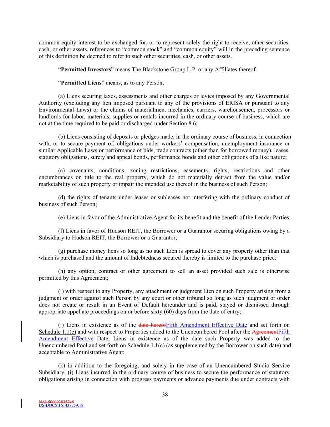 NAI-5000938357v5 US-DOCS\161437759.18 38 common equity interest to be exchanged for, or to represent solely the right to receive, other securities, cash, or other assets, references to “common stock” and “common equity” will in the preceding sentence of this definition be deemed to refer to such other securities, cash, or other assets. “Permitted Investors” means The Blackstone Group L.P. or any Affiliates thereof. “Permitted Liens” means, as to any Person, (a) Liens securing taxes, assessments and other charges or levies imposed by any Governmental Authority (excluding any lien imposed pursuant to any of the provisions of ERISA or pursuant to any Environmental Laws) or the claims of materialmen, mechanics, carriers, warehousemen, processors or landlords for labor, materials, supplies or rentals incurred in the ordinary course of business, which are not at the time required to be paid or discharged under Section 8.6; (b) Liens consisting of deposits or pledges made, in the ordinary course of business, in connection with, or to secure payment of, obligations under workers’ compensation, unemployment insurance or similar Applicable Laws or performance of bids, trade contracts (other than for borrowed money), leases, statutory obligations, surety and appeal bonds, performance bonds and other obligations of a like nature; (c) covenants, conditions, zoning restrictions, easements, rights, restrictions and other encumbrances on title to the real property, which do not materially detract from the value and/or marketability of such property or impair the intended use thereof in the business of such Person; (d) the rights of tenants under leases or subleases not interfering with the ordinary conduct of business of such Person; (e) Liens in favor of the Administrative Agent for its benefit and the benefit of the Lender Parties; (f) Liens in favor of Hudson REIT, the Borrower or a Guarantor securing obligations owing by a Subsidiary to Hudson REIT, the Borrower or a Guarantor; (g) purchase money liens so long as no such Lien is spread to cover any property other than that which is purchased and the amount of Indebtedness secured thereby is limited to the purchase price; (h) any option, contract or other agreement to sell an asset provided such sale is otherwise permitted by this Agreement; (i) with respect to any Property, any attachment or judgment Lien on such Property arising from a judgment or order against such Person by any court or other tribunal so long as such judgment or order does not create or result in an Event of Default hereunder and is paid, stayed or dismissed through appropriate appellate proceedings on or before sixty (60) days from the date of entry; (j) Liens in existence as of the date hereofFifth Amendment Effective Date and set forth on Schedule 1.1(c) and with respect to Properties added to the Unencumbered Pool after the AgreementFifth Amendment Effective Date, Liens in existence as of the date such Property was added to the Unencumbered Pool and set forth on Schedule 1.1(c) (as supplemented by the Borrower on such date) and acceptable to Administrative Agent; (k) in addition to the foregoing, and solely in the case of an Unencumbered Studio Service Subsidiary, (i) Liens incurred in the ordinary course of business to secure the performance of statutory obligations arising in connection with progress payments or advance payments due under contracts with