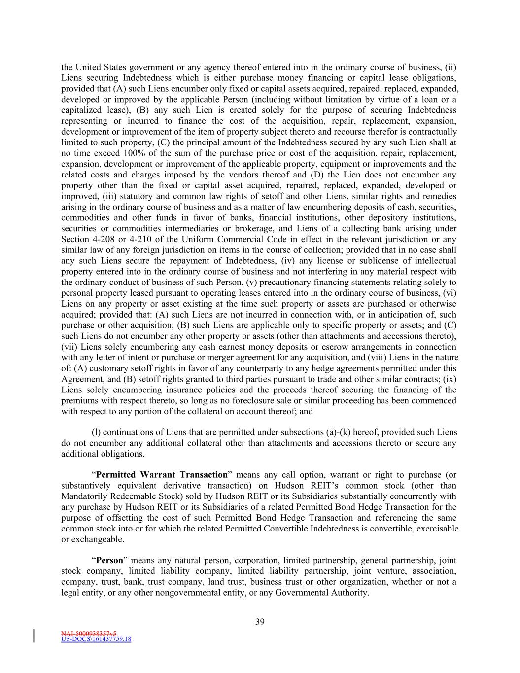 NAI-5000938357v5 US-DOCS\161437759.18 39 the United States government or any agency thereof entered into in the ordinary course of business, (ii) Liens securing Indebtedness which is either purchase money financing or capital lease obligations, provided that (A) such Liens encumber only fixed or capital assets acquired, repaired, replaced, expanded, developed or improved by the applicable Person (including without limitation by virtue of a loan or a capitalized lease), (B) any such Lien is created solely for the purpose of securing Indebtedness representing or incurred to finance the cost of the acquisition, repair, replacement, expansion, development or improvement of the item of property subject thereto and recourse therefor is contractually limited to such property, (C) the principal amount of the Indebtedness secured by any such Lien shall at no time exceed 100% of the sum of the purchase price or cost of the acquisition, repair, replacement, expansion, development or improvement of the applicable property, equipment or improvements and the related costs and charges imposed by the vendors thereof and (D) the Lien does not encumber any property other than the fixed or capital asset acquired, repaired, replaced, expanded, developed or improved, (iii) statutory and common law rights of setoff and other Liens, similar rights and remedies arising in the ordinary course of business and as a matter of law encumbering deposits of cash, securities, commodities and other funds in favor of banks, financial institutions, other depository institutions, securities or commodities intermediaries or brokerage, and Liens of a collecting bank arising under Section 4-208 or 4-210 of the Uniform Commercial Code in effect in the relevant jurisdiction or any similar law of any foreign jurisdiction on items in the course of collection; provided that in no case shall any such Liens secure the repayment of Indebtedness, (iv) any license or sublicense of intellectual property entered into in the ordinary course of business and not interfering in any material respect with the ordinary conduct of business of such Person, (v) precautionary financing statements relating solely to personal property leased pursuant to operating leases entered into in the ordinary course of business, (vi) Liens on any property or asset existing at the time such property or assets are purchased or otherwise acquired; provided that: (A) such Liens are not incurred in connection with, or in anticipation of, such purchase or other acquisition; (B) such Liens are applicable only to specific property or assets; and (C) such Liens do not encumber any other property or assets (other than attachments and accessions thereto), (vii) Liens solely encumbering any cash earnest money deposits or escrow arrangements in connection with any letter of intent or purchase or merger agreement for any acquisition, and (viii) Liens in the nature of: (A) customary setoff rights in favor of any counterparty to any hedge agreements permitted under this Agreement, and (B) setoff rights granted to third parties pursuant to trade and other similar contracts; (ix) Liens solely encumbering insurance policies and the proceeds thereof securing the financing of the premiums with respect thereto, so long as no foreclosure sale or similar proceeding has been commenced with respect to any portion of the collateral on account thereof; and (l) continuations of Liens that are permitted under subsections (a)-(k) hereof, provided such Liens do not encumber any additional collateral other than attachments and accessions thereto or secure any additional obligations. “Permitted Warrant Transaction” means any call option, warrant or right to purchase (or substantively equivalent derivative transaction) on Hudson REIT’s common stock (other than Mandatorily Redeemable Stock) sold by Hudson REIT or its Subsidiaries substantially concurrently with any purchase by Hudson REIT or its Subsidiaries of a related Permitted Bond Hedge Transaction for the purpose of offsetting the cost of such Permitted Bond Hedge Transaction and referencing the same common stock into or for which the related Permitted Convertible Indebtedness is convertible, exercisable or exchangeable. “Person” means any natural person, corporation, limited partnership, general partnership, joint stock company, limited liability company, limited liability partnership, joint venture, association, company, trust, bank, trust company, land trust, business trust or other organization, whether or not a legal entity, or any other nongovernmental entity, or any Governmental Authority.