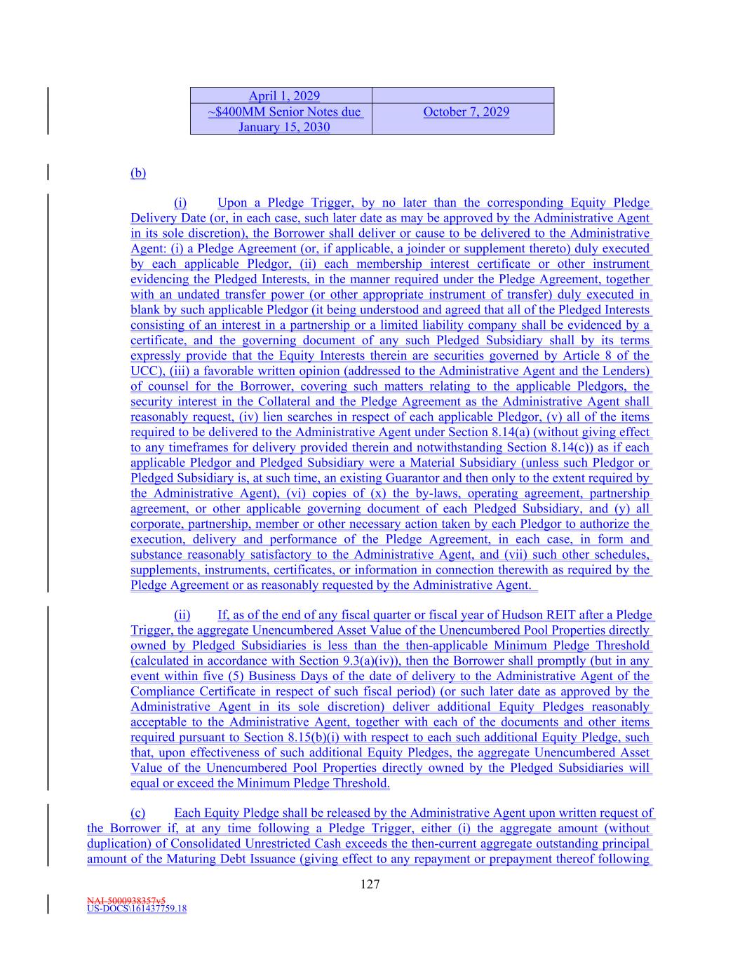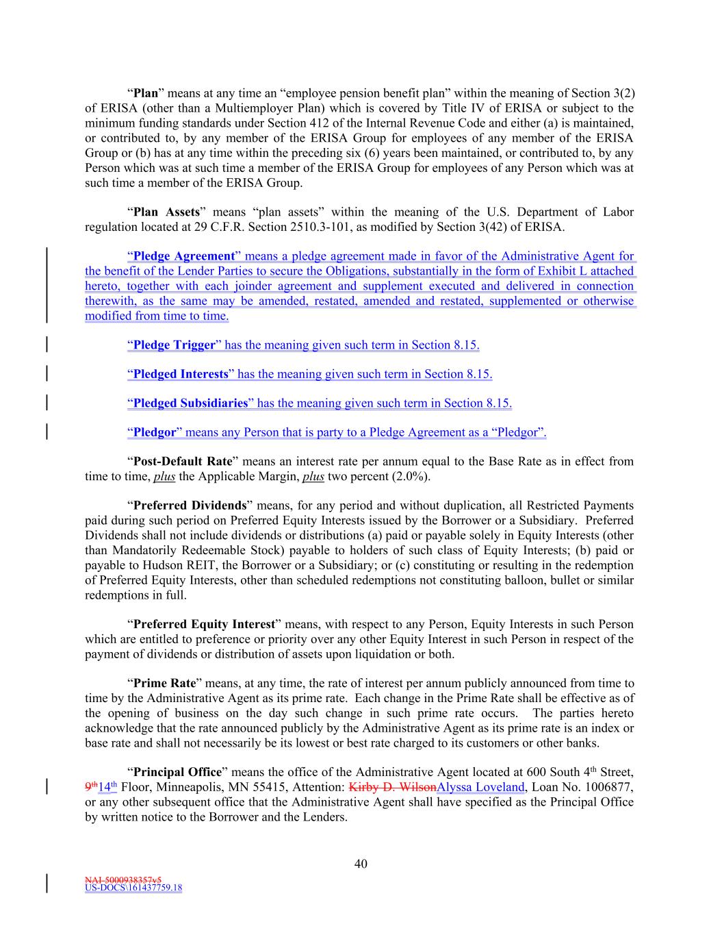 NAI-5000938357v5 US-DOCS\161437759.18 40 “Plan” means at any time an “employee pension benefit plan” within the meaning of Section 3(2) of ERISA (other than a Multiemployer Plan) which is covered by Title IV of ERISA or subject to the minimum funding standards under Section 412 of the Internal Revenue Code and either (a) is maintained, or contributed to, by any member of the ERISA Group for employees of any member of the ERISA Group or (b) has at any time within the preceding six (6) years been maintained, or contributed to, by any Person which was at such time a member of the ERISA Group for employees of any Person which was at such time a member of the ERISA Group. “Plan Assets” means “plan assets” within the meaning of the U.S. Department of Labor regulation located at 29 C.F.R. Section 2510.3-101, as modified by Section 3(42) of ERISA. “Pledge Agreement” means a pledge agreement made in favor of the Administrative Agent for the benefit of the Lender Parties to secure the Obligations, substantially in the form of Exhibit L attached hereto, together with each joinder agreement and supplement executed and delivered in connection therewith, as the same may be amended, restated, amended and restated, supplemented or otherwise modified from time to time. “Pledge Trigger” has the meaning given such term in Section 8.15. “Pledged Interests” has the meaning given such term in Section 8.15. “Pledged Subsidiaries” has the meaning given such term in Section 8.15. “Pledgor” means any Person that is party to a Pledge Agreement as a “Pledgor”. “Post-Default Rate” means an interest rate per annum equal to the Base Rate as in effect from time to time, plus the Applicable Margin, plus two percent (2.0%). “Preferred Dividends” means, for any period and without duplication, all Restricted Payments paid during such period on Preferred Equity Interests issued by the Borrower or a Subsidiary. Preferred Dividends shall not include dividends or distributions (a) paid or payable solely in Equity Interests (other than Mandatorily Redeemable Stock) payable to holders of such class of Equity Interests; (b) paid or payable to Hudson REIT, the Borrower or a Subsidiary; or (c) constituting or resulting in the redemption of Preferred Equity Interests, other than scheduled redemptions not constituting balloon, bullet or similar redemptions in full. “Preferred Equity Interest” means, with respect to any Person, Equity Interests in such Person which are entitled to preference or priority over any other Equity Interest in such Person in respect of the payment of dividends or distribution of assets upon liquidation or both. “Prime Rate” means, at any time, the rate of interest per annum publicly announced from time to time by the Administrative Agent as its prime rate. Each change in the Prime Rate shall be effective as of the opening of business on the day such change in such prime rate occurs. The parties hereto acknowledge that the rate announced publicly by the Administrative Agent as its prime rate is an index or base rate and shall not necessarily be its lowest or best rate charged to its customers or other banks. “Principal Office” means the office of the Administrative Agent located at 600 South 4th Street, 9th14th Floor, Minneapolis, MN 55415, Attention: Kirby D. WilsonAlyssa Loveland, Loan No. 1006877, or any other subsequent office that the Administrative Agent shall have specified as the Principal Office by written notice to the Borrower and the Lenders.