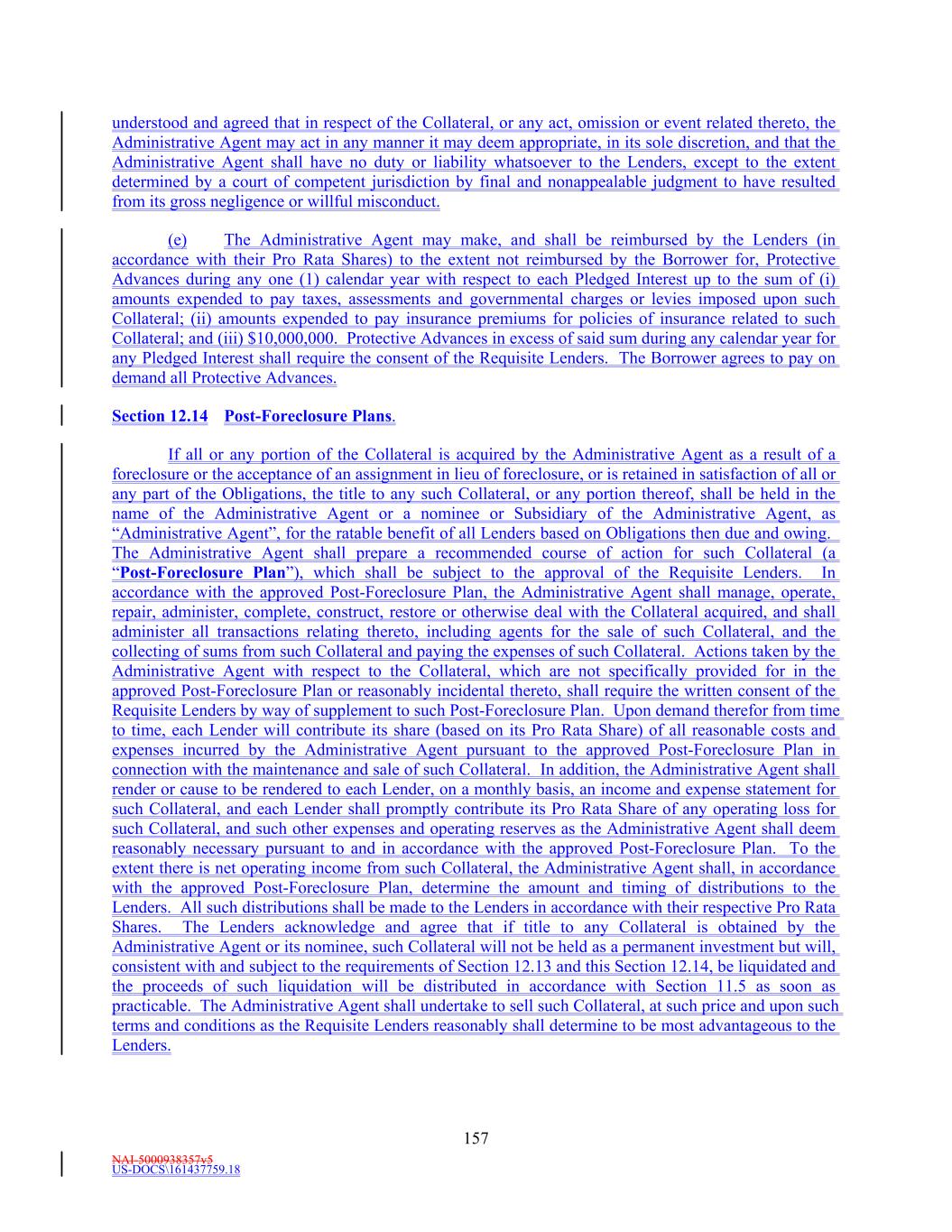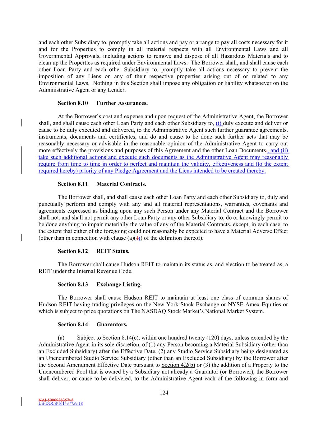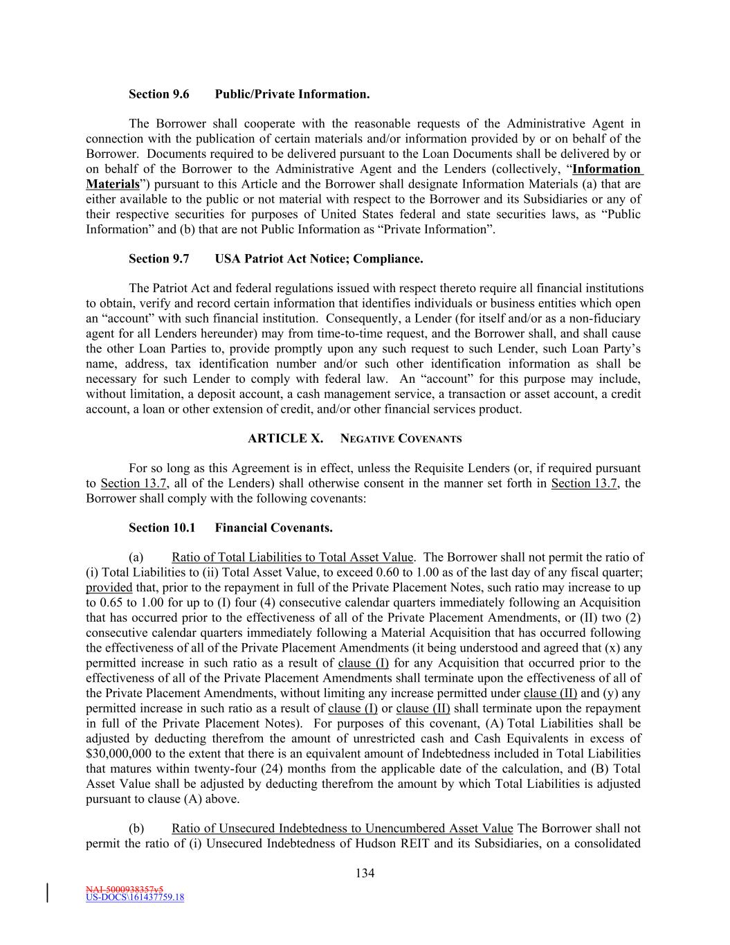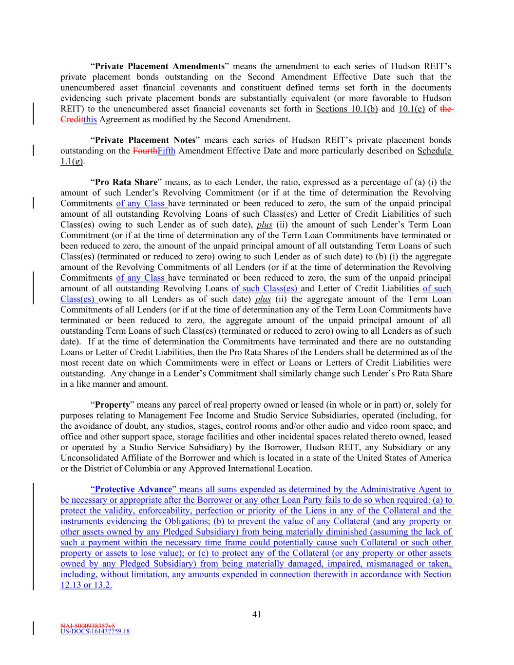 NAI-5000938357v5 US-DOCS\161437759.18 41 “Private Placement Amendments” means the amendment to each series of Hudson REIT’s private placement bonds outstanding on the Second Amendment Effective Date such that the unencumbered asset financial covenants and constituent defined terms set forth in the documents evidencing such private placement bonds are substantially equivalent (or more favorable to Hudson REIT) to the unencumbered asset financial covenants set forth in Sections 10.1(b) and 10.1(e) of the Creditthis Agreement as modified by the Second Amendment. “Private Placement Notes” means each series of Hudson REIT’s private placement bonds outstanding on the FourthFifth Amendment Effective Date and more particularly described on Schedule 1.1(g). “Pro Rata Share” means, as to each Lender, the ratio, expressed as a percentage of (a) (i) the amount of such Lender’s Revolving Commitment (or if at the time of determination the Revolving Commitments of any Class have terminated or been reduced to zero, the sum of the unpaid principal amount of all outstanding Revolving Loans of such Class(es) and Letter of Credit Liabilities of such Class(es) owing to such Lender as of such date), plus (ii) the amount of such Lender’s Term Loan Commitment (or if at the time of determination any of the Term Loan Commitments have terminated or been reduced to zero, the amount of the unpaid principal amount of all outstanding Term Loans of such Class(es) (terminated or reduced to zero) owing to such Lender as of such date) to (b) (i) the aggregate amount of the Revolving Commitments of all Lenders (or if at the time of determination the Revolving Commitments of any Class have terminated or been reduced to zero, the sum of the unpaid principal amount of all outstanding Revolving Loans of such Class(es) and Letter of Credit Liabilities of such Class(es) owing to all Lenders as of such date) plus (ii) the aggregate amount of the Term Loan Commitments of all Lenders (or if at the time of determination any of the Term Loan Commitments have terminated or been reduced to zero, the aggregate amount of the unpaid principal amount of all outstanding Term Loans of such Class(es) (terminated or reduced to zero) owing to all Lenders as of such date). If at the time of determination the Commitments have terminated and there are no outstanding Loans or Letter of Credit Liabilities, then the Pro Rata Shares of the Lenders shall be determined as of the most recent date on which Commitments were in effect or Loans or Letters of Credit Liabilities were outstanding. Any change in a Lender’s Commitment shall similarly change such Lender’s Pro Rata Share in a like manner and amount. “Property” means any parcel of real property owned or leased (in whole or in part) or, solely for purposes relating to Management Fee Income and Studio Service Subsidiaries, operated (including, for the avoidance of doubt, any studios, stages, control rooms and/or other audio and video room space, and office and other support space, storage facilities and other incidental spaces related thereto owned, leased or operated by a Studio Service Subsidiary) by the Borrower, Hudson REIT, any Subsidiary or any Unconsolidated Affiliate of the Borrower and which is located in a state of the United States of America or the District of Columbia or any Approved International Location. “Protective Advance” means all sums expended as determined by the Administrative Agent to be necessary or appropriate after the Borrower or any other Loan Party fails to do so when required: (a) to protect the validity, enforceability, perfection or priority of the Liens in any of the Collateral and the instruments evidencing the Obligations; (b) to prevent the value of any Collateral (and any property or other assets owned by any Pledged Subsidiary) from being materially diminished (assuming the lack of such a payment within the necessary time frame could potentially cause such Collateral or such other property or assets to lose value); or (c) to protect any of the Collateral (or any property or other assets owned by any Pledged Subsidiary) from being materially damaged, impaired, mismanaged or taken, including, without limitation, any amounts expended in connection therewith in accordance with Section 12.13 or 13.2.
