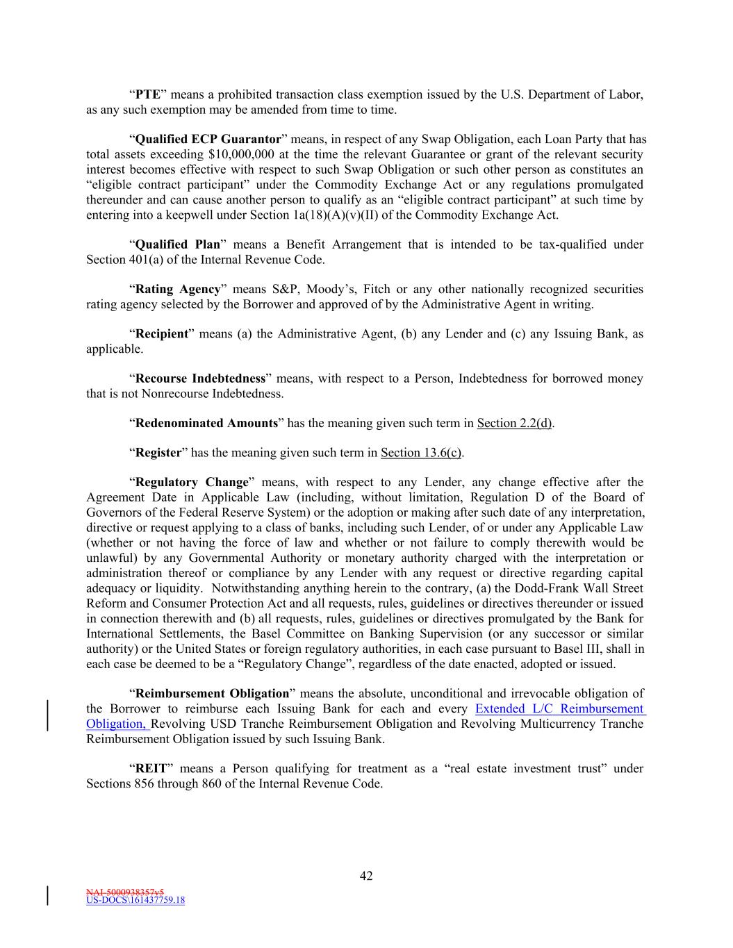 NAI-5000938357v5 US-DOCS\161437759.18 42 “PTE” means a prohibited transaction class exemption issued by the U.S. Department of Labor, as any such exemption may be amended from time to time. “Qualified ECP Guarantor” means, in respect of any Swap Obligation, each Loan Party that has total assets exceeding $10,000,000 at the time the relevant Guarantee or grant of the relevant security interest becomes effective with respect to such Swap Obligation or such other person as constitutes an “eligible contract participant” under the Commodity Exchange Act or any regulations promulgated thereunder and can cause another person to qualify as an “eligible contract participant” at such time by entering into a keepwell under Section 1a(18)(A)(v)(II) of the Commodity Exchange Act. “Qualified Plan” means a Benefit Arrangement that is intended to be tax-qualified under Section 401(a) of the Internal Revenue Code. “Rating Agency” means S&P, Moody’s, Fitch or any other nationally recognized securities rating agency selected by the Borrower and approved of by the Administrative Agent in writing. “Recipient” means (a) the Administrative Agent, (b) any Lender and (c) any Issuing Bank, as applicable. “Recourse Indebtedness” means, with respect to a Person, Indebtedness for borrowed money that is not Nonrecourse Indebtedness. “Redenominated Amounts” has the meaning given such term in Section 2.2(d). “Register” has the meaning given such term in Section 13.6(c). “Regulatory Change” means, with respect to any Lender, any change effective after the Agreement Date in Applicable Law (including, without limitation, Regulation D of the Board of Governors of the Federal Reserve System) or the adoption or making after such date of any interpretation, directive or request applying to a class of banks, including such Lender, of or under any Applicable Law (whether or not having the force of law and whether or not failure to comply therewith would be unlawful) by any Governmental Authority or monetary authority charged with the interpretation or administration thereof or compliance by any Lender with any request or directive regarding capital adequacy or liquidity. Notwithstanding anything herein to the contrary, (a) the Dodd-Frank Wall Street Reform and Consumer Protection Act and all requests, rules, guidelines or directives thereunder or issued in connection therewith and (b) all requests, rules, guidelines or directives promulgated by the Bank for International Settlements, the Basel Committee on Banking Supervision (or any successor or similar authority) or the United States or foreign regulatory authorities, in each case pursuant to Basel III, shall in each case be deemed to be a “Regulatory Change”, regardless of the date enacted, adopted or issued. “Reimbursement Obligation” means the absolute, unconditional and irrevocable obligation of the Borrower to reimburse each Issuing Bank for each and every Extended L/C Reimbursement Obligation, Revolving USD Tranche Reimbursement Obligation and Revolving Multicurrency Tranche Reimbursement Obligation issued by such Issuing Bank. “REIT” means a Person qualifying for treatment as a “real estate investment trust” under Sections 856 through 860 of the Internal Revenue Code.