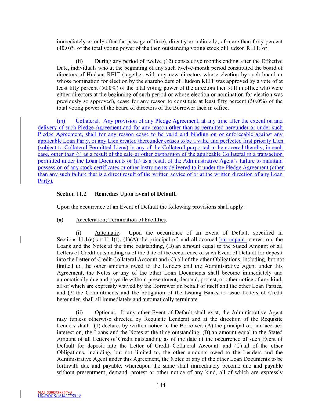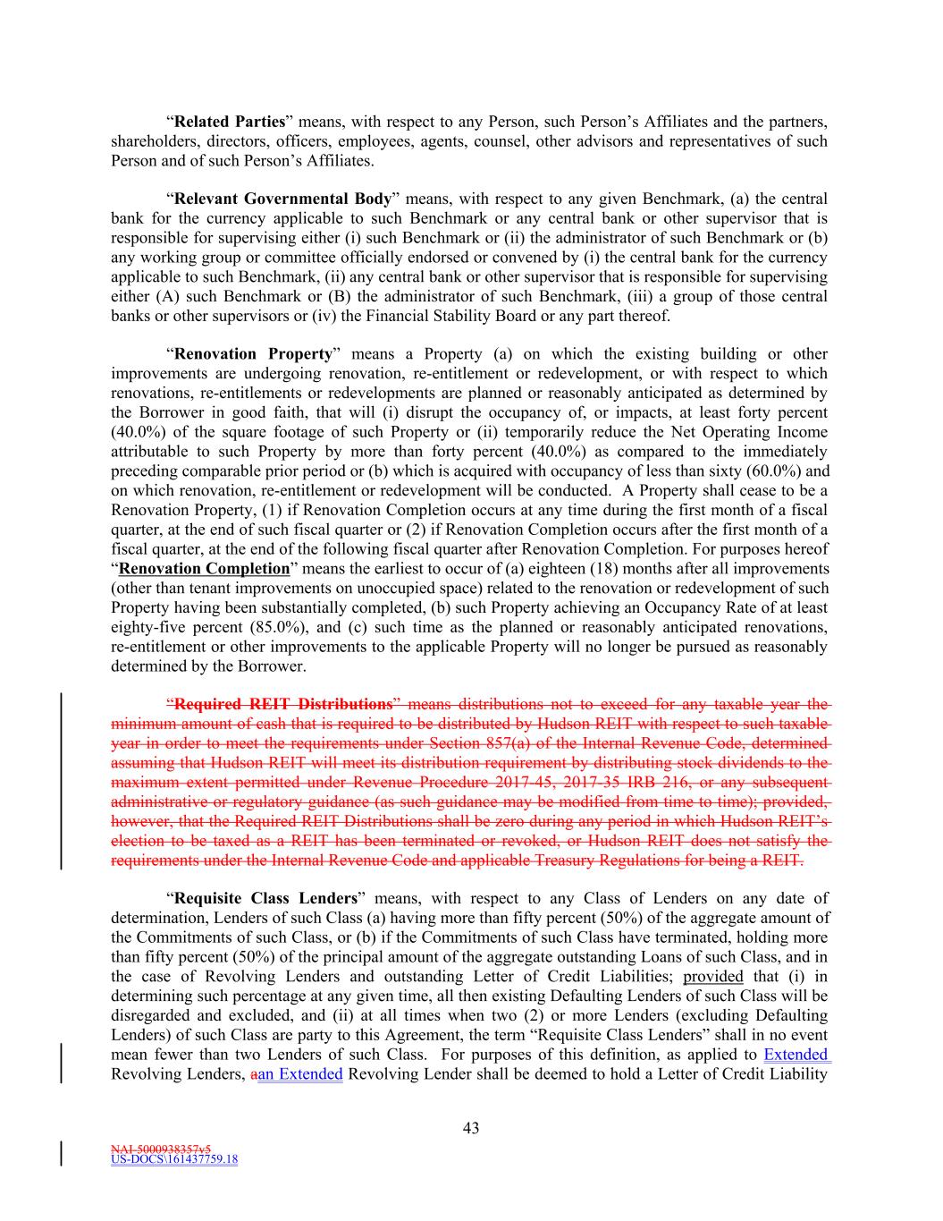 NAI-5000938357v5 US-DOCS\161437759.18 43 “Related Parties” means, with respect to any Person, such Person’s Affiliates and the partners, shareholders, directors, officers, employees, agents, counsel, other advisors and representatives of such Person and of such Person’s Affiliates. “Relevant Governmental Body” means, with respect to any given Benchmark, (a) the central bank for the currency applicable to such Benchmark or any central bank or other supervisor that is responsible for supervising either (i) such Benchmark or (ii) the administrator of such Benchmark or (b) any working group or committee officially endorsed or convened by (i) the central bank for the currency applicable to such Benchmark, (ii) any central bank or other supervisor that is responsible for supervising either (A) such Benchmark or (B) the administrator of such Benchmark, (iii) a group of those central banks or other supervisors or (iv) the Financial Stability Board or any part thereof. “Renovation Property” means a Property (a) on which the existing building or other improvements are undergoing renovation, re-entitlement or redevelopment, or with respect to which renovations, re-entitlements or redevelopments are planned or reasonably anticipated as determined by the Borrower in good faith, that will (i) disrupt the occupancy of, or impacts, at least forty percent (40.0%) of the square footage of such Property or (ii) temporarily reduce the Net Operating Income attributable to such Property by more than forty percent (40.0%) as compared to the immediately preceding comparable prior period or (b) which is acquired with occupancy of less than sixty (60.0%) and on which renovation, re-entitlement or redevelopment will be conducted. A Property shall cease to be a Renovation Property, (1) if Renovation Completion occurs at any time during the first month of a fiscal quarter, at the end of such fiscal quarter or (2) if Renovation Completion occurs after the first month of a fiscal quarter, at the end of the following fiscal quarter after Renovation Completion. For purposes hereof “Renovation Completion” means the earliest to occur of (a) eighteen (18) months after all improvements (other than tenant improvements on unoccupied space) related to the renovation or redevelopment of such Property having been substantially completed, (b) such Property achieving an Occupancy Rate of at least eighty-five percent (85.0%), and (c) such time as the planned or reasonably anticipated renovations, re-entitlement or other improvements to the applicable Property will no longer be pursued as reasonably determined by the Borrower. “Required REIT Distributions” means distributions not to exceed for any taxable year the minimum amount of cash that is required to be distributed by Hudson REIT with respect to such taxable year in order to meet the requirements under Section 857(a) of the Internal Revenue Code, determined assuming that Hudson REIT will meet its distribution requirement by distributing stock dividends to the maximum extent permitted under Revenue Procedure 2017-45, 2017-35 IRB 216, or any subsequent administrative or regulatory guidance (as such guidance may be modified from time to time); provided, however, that the Required REIT Distributions shall be zero during any period in which Hudson REIT’s election to be taxed as a REIT has been terminated or revoked, or Hudson REIT does not satisfy the requirements under the Internal Revenue Code and applicable Treasury Regulations for being a REIT. “Requisite Class Lenders” means, with respect to any Class of Lenders on any date of determination, Lenders of such Class (a) having more than fifty percent (50%) of the aggregate amount of the Commitments of such Class, or (b) if the Commitments of such Class have terminated, holding more than fifty percent (50%) of the principal amount of the aggregate outstanding Loans of such Class, and in the case of Revolving Lenders and outstanding Letter of Credit Liabilities; provided that (i) in determining such percentage at any given time, all then existing Defaulting Lenders of such Class will be disregarded and excluded, and (ii) at all times when two (2) or more Lenders (excluding Defaulting Lenders) of such Class are party to this Agreement, the term “Requisite Class Lenders” shall in no event mean fewer than two Lenders of such Class. For purposes of this definition, as applied to Extended Revolving Lenders, aan Extended Revolving Lender shall be deemed to hold a Letter of Credit Liability