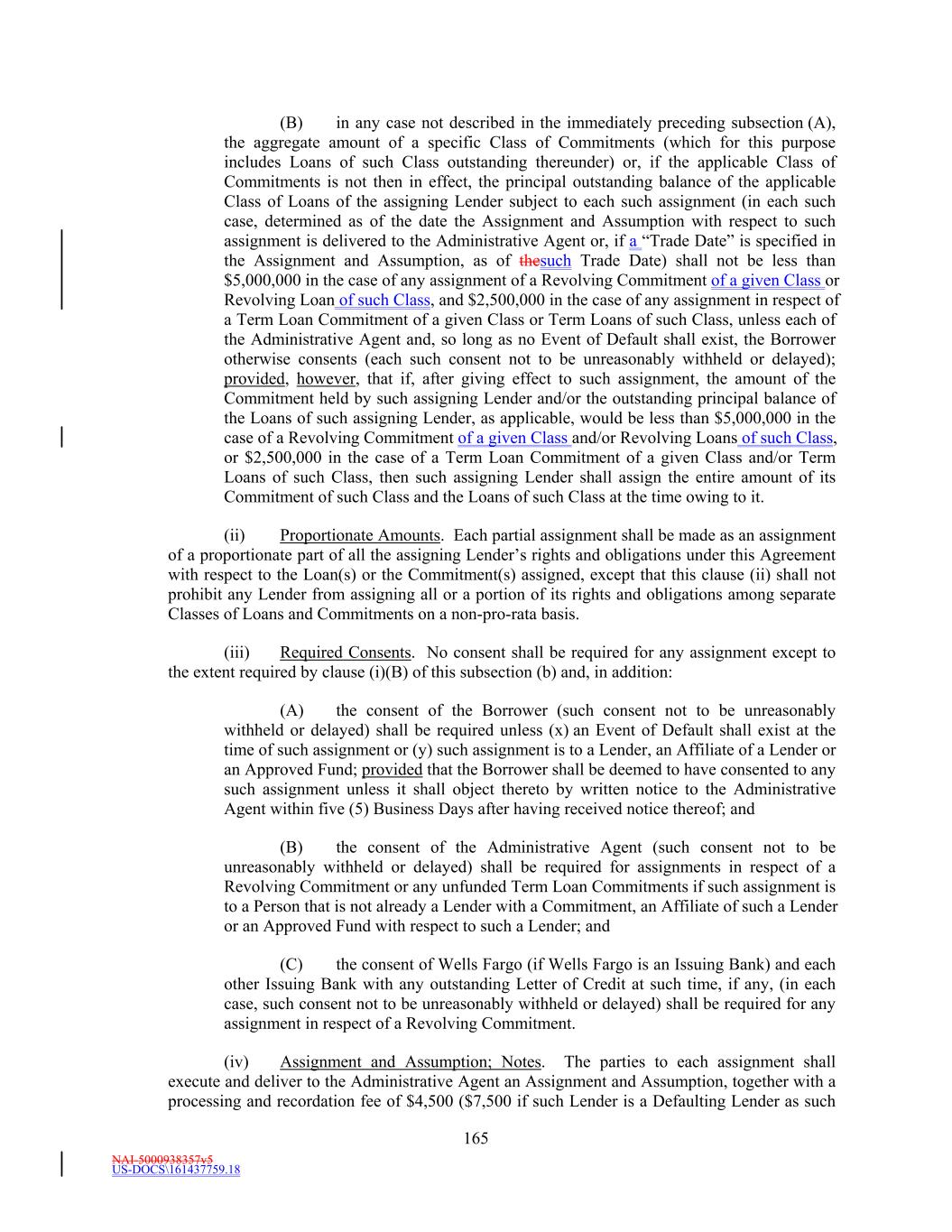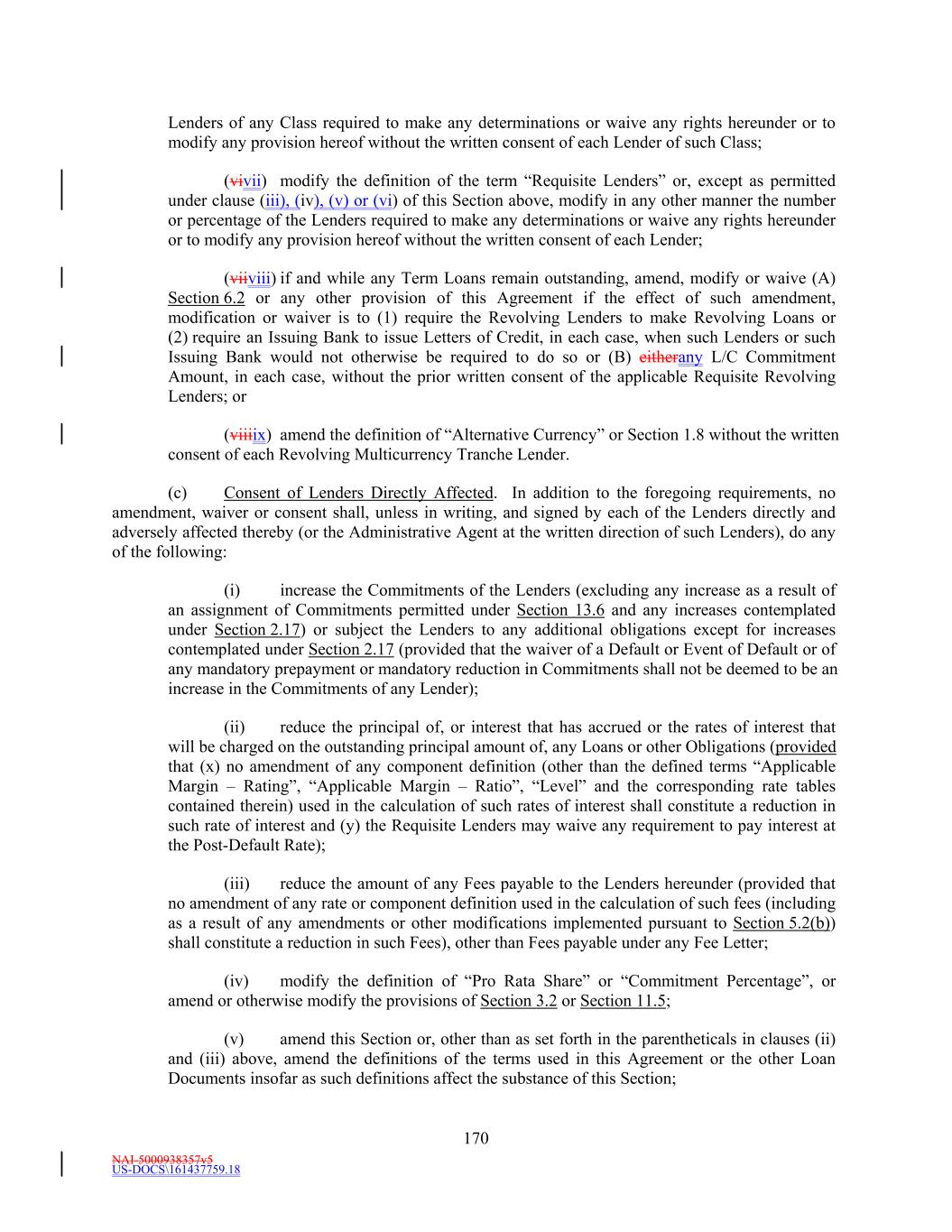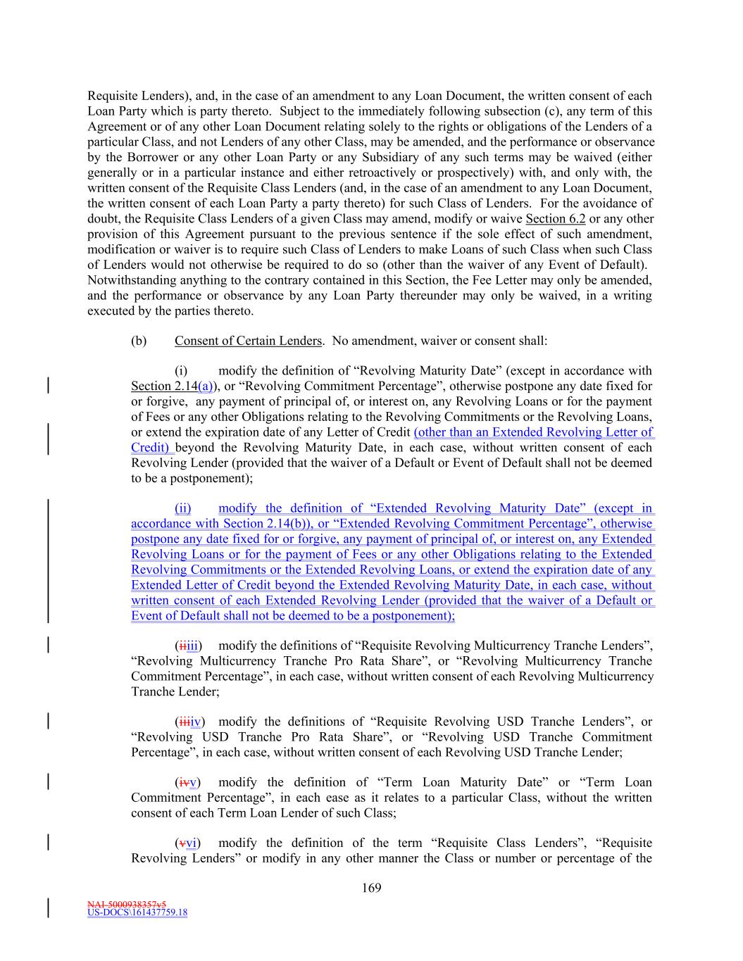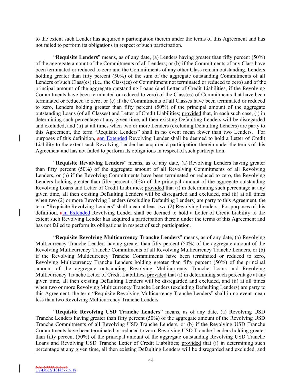 NAI-5000938357v5 US-DOCS\161437759.18 44 to the extent such Lender has acquired a participation therein under the terms of this Agreement and has not failed to perform its obligations in respect of such participation. “Requisite Lenders” means, as of any date, (a) Lenders having greater than fifty percent (50%) of the aggregate amount of the Commitments of all Lenders; or (b) if the Commitments of any Class have been terminated or reduced to zero and the Commitments of any other Class remain outstanding, Lenders holding greater than fifty percent (50%) of the sum of the aggregate outstanding Commitments of all Lenders of such Class(es) (i.e., the Class(es) of Commitment not terminated or reduced to zero) and of the principal amount of the aggregate outstanding Loans (and Letter of Credit Liabilities, if the Revolving Commitments have been terminated or reduced to zero) of the Class(es) of Commitments that have been terminated or reduced to zero; or (c) if the Commitments of all Classes have been terminated or reduced to zero, Lenders holding greater than fifty percent (50%) of the principal amount of the aggregate outstanding Loans (of all Classes) and Letter of Credit Liabilities; provided that, in each such case, (i) in determining such percentage at any given time, all then existing Defaulting Lenders will be disregarded and excluded, and (ii) at all times when two or more Lenders (excluding Defaulting Lenders) are party to this Agreement, the term “Requisite Lenders” shall in no event mean fewer than two Lenders. For purposes of this definition, aan Extended Revolving Lender shall be deemed to hold a Letter of Credit Liability to the extent such Revolving Lender has acquired a participation therein under the terms of this Agreement and has not failed to perform its obligations in respect of such participation. “Requisite Revolving Lenders” means, as of any date, (a) Revolving Lenders having greater than fifty percent (50%) of the aggregate amount of all Revolving Commitments of all Revolving Lenders, or (b) if the Revolving Commitments have been terminated or reduced to zero, the Revolving Lenders holding greater than fifty percent (50%) of the principal amount of the aggregate outstanding Revolving Loans and Letter of Credit Liabilities; provided that (i) in determining such percentage at any given time, all then existing Defaulting Lenders will be disregarded and excluded, and (ii) at all times when two (2) or more Revolving Lenders (excluding Defaulting Lenders) are party to this Agreement, the term “Requisite Revolving Lenders” shall mean at least two (2) Revolving Lenders. For purposes of this definition, aan Extended Revolving Lender shall be deemed to hold a Letter of Credit Liability to the extent such Revolving Lender has acquired a participation therein under the terms of this Agreement and has not failed to perform its obligations in respect of such participation. “Requisite Revolving Multicurrency Tranche Lenders” means, as of any date, (a) Revolving Multicurrency Tranche Lenders having greater than fifty percent (50%) of the aggregate amount of the Revolving Multicurrency Tranche Commitments of all Revolving Multicurrency Tranche Lenders, or (b) if the Revolving Multicurrency Tranche Commitments have been terminated or reduced to zero, Revolving Multicurrency Tranche Lenders holding greater than fifty percent (50%) of the principal amount of the aggregate outstanding Revolving Multicurrency Tranche Loans and Revolving Multicurrency Tranche Letter of Credit Liabilities; provided that (i) in determining such percentage at any given time, all then existing Defaulting Lenders will be disregarded and excluded, and (ii) at all times when two or more Revolving Multicurrency Tranche Lenders (excluding Defaulting Lenders) are party to this Agreement, the term “Requisite Revolving Multicurrency Tranche Lenders” shall in no event mean less than two Revolving Multicurrency Tranche Lenders. “Requisite Revolving USD Tranche Lenders” means, as of any date, (a) Revolving USD Tranche Lenders having greater than fifty percent (50%) of the aggregate amount of the Revolving USD Tranche Commitments of all Revolving USD Tranche Lenders, or (b) if the Revolving USD Tranche Commitments have been terminated or reduced to zero, Revolving USD Tranche Lenders holding greater than fifty percent (50%) of the principal amount of the aggregate outstanding Revolving USD Tranche Loans and Revolving USD Tranche Letter of Credit Liabilities; provided that (i) in determining such percentage at any given time, all then existing Defaulting Lenders will be disregarded and excluded, and