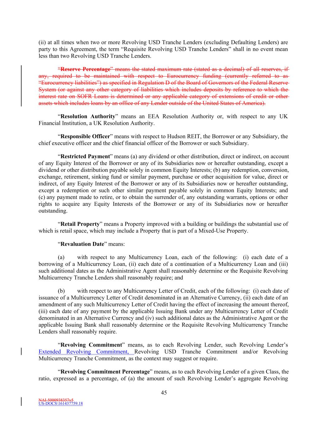 NAI-5000938357v5 US-DOCS\161437759.18 45 (ii) at all times when two or more Revolving USD Tranche Lenders (excluding Defaulting Lenders) are party to this Agreement, the term “Requisite Revolving USD Tranche Lenders” shall in no event mean less than two Revolving USD Tranche Lenders. “Reserve Percentage” means the stated maximum rate (stated as a decimal) of all reserves, if any, required to be maintained with respect to Eurocurrency funding (currently referred to as “Eurocurrency liabilities”) as specified in Regulation D of the Board of Governors of the Federal Reserve System (or against any other category of liabilities which includes deposits by reference to which the interest rate on SOFR Loans is determined or any applicable category of extensions of credit or other assets which includes loans by an office of any Lender outside of the United States of America). “Resolution Authority” means an EEA Resolution Authority or, with respect to any UK Financial Institution, a UK Resolution Authority. “Responsible Officer” means with respect to Hudson REIT, the Borrower or any Subsidiary, the chief executive officer and the chief financial officer of the Borrower or such Subsidiary. “Restricted Payment” means (a) any dividend or other distribution, direct or indirect, on account of any Equity Interest of the Borrower or any of its Subsidiaries now or hereafter outstanding, except a dividend or other distribution payable solely in common Equity Interests; (b) any redemption, conversion, exchange, retirement, sinking fund or similar payment, purchase or other acquisition for value, direct or indirect, of any Equity Interest of the Borrower or any of its Subsidiaries now or hereafter outstanding, except a redemption or such other similar payment payable solely in common Equity Interests; and (c) any payment made to retire, or to obtain the surrender of, any outstanding warrants, options or other rights to acquire any Equity Interests of the Borrower or any of its Subsidiaries now or hereafter outstanding. “Retail Property” means a Property improved with a building or buildings the substantial use of which is retail space, which may include a Property that is part of a Mixed-Use Property. “Revaluation Date” means: (a) with respect to any Multicurrency Loan, each of the following: (i) each date of a borrowing of a Multicurrency Loan, (ii) each date of a continuation of a Multicurrency Loan and (iii) such additional dates as the Administrative Agent shall reasonably determine or the Requisite Revolving Multicurrency Tranche Lenders shall reasonably require; and (b) with respect to any Multicurrency Letter of Credit, each of the following: (i) each date of issuance of a Multicurrency Letter of Credit denominated in an Alternative Currency, (ii) each date of an amendment of any such Multicurrency Letter of Credit having the effect of increasing the amount thereof, (iii) each date of any payment by the applicable Issuing Bank under any Multicurrency Letter of Credit denominated in an Alternative Currency and (iv) such additional dates as the Administrative Agent or the applicable Issuing Bank shall reasonably determine or the Requisite Revolving Multicurrency Tranche Lenders shall reasonably require. “Revolving Commitment” means, as to each Revolving Lender, such Revolving Lender’s Extended Revolving Commitment, Revolving USD Tranche Commitment and/or Revolving Multicurrency Tranche Commitment, as the context may suggest or require. “Revolving Commitment Percentage” means, as to each Revolving Lender of a given Class, the ratio, expressed as a percentage, of (a) the amount of such Revolving Lender’s aggregate Revolving