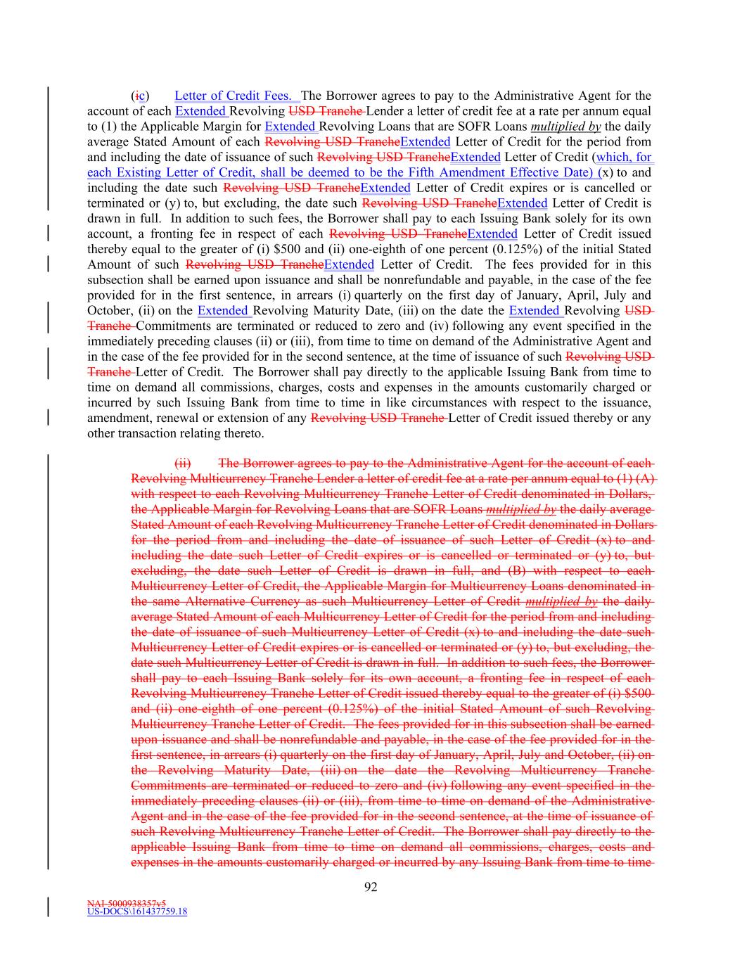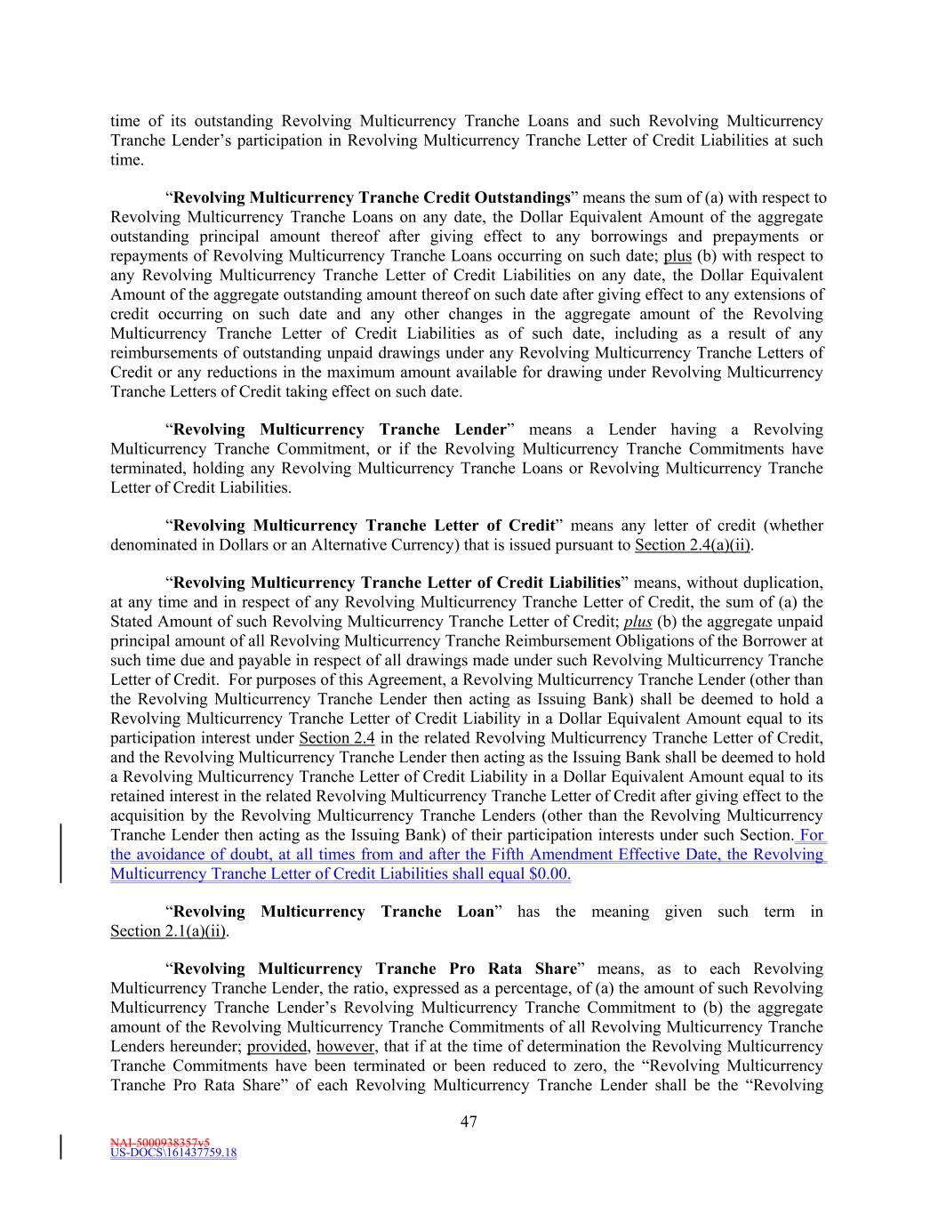 NAI-5000938357v5 US-DOCS\161437759.18 47 time of its outstanding Revolving Multicurrency Tranche Loans and such Revolving Multicurrency Tranche Lender’s participation in Revolving Multicurrency Tranche Letter of Credit Liabilities at such time. “Revolving Multicurrency Tranche Credit Outstandings” means the sum of (a) with respect to Revolving Multicurrency Tranche Loans on any date, the Dollar Equivalent Amount of the aggregate outstanding principal amount thereof after giving effect to any borrowings and prepayments or repayments of Revolving Multicurrency Tranche Loans occurring on such date; plus (b) with respect to any Revolving Multicurrency Tranche Letter of Credit Liabilities on any date, the Dollar Equivalent Amount of the aggregate outstanding amount thereof on such date after giving effect to any extensions of credit occurring on such date and any other changes in the aggregate amount of the Revolving Multicurrency Tranche Letter of Credit Liabilities as of such date, including as a result of any reimbursements of outstanding unpaid drawings under any Revolving Multicurrency Tranche Letters of Credit or any reductions in the maximum amount available for drawing under Revolving Multicurrency Tranche Letters of Credit taking effect on such date. “Revolving Multicurrency Tranche Lender” means a Lender having a Revolving Multicurrency Tranche Commitment, or if the Revolving Multicurrency Tranche Commitments have terminated, holding any Revolving Multicurrency Tranche Loans or Revolving Multicurrency Tranche Letter of Credit Liabilities. “Revolving Multicurrency Tranche Letter of Credit” means any letter of credit (whether denominated in Dollars or an Alternative Currency) that is issued pursuant to Section 2.4(a)(ii). “Revolving Multicurrency Tranche Letter of Credit Liabilities” means, without duplication, at any time and in respect of any Revolving Multicurrency Tranche Letter of Credit, the sum of (a) the Stated Amount of such Revolving Multicurrency Tranche Letter of Credit; plus (b) the aggregate unpaid principal amount of all Revolving Multicurrency Tranche Reimbursement Obligations of the Borrower at such time due and payable in respect of all drawings made under such Revolving Multicurrency Tranche Letter of Credit. For purposes of this Agreement, a Revolving Multicurrency Tranche Lender (other than the Revolving Multicurrency Tranche Lender then acting as Issuing Bank) shall be deemed to hold a Revolving Multicurrency Tranche Letter of Credit Liability in a Dollar Equivalent Amount equal to its participation interest under Section 2.4 in the related Revolving Multicurrency Tranche Letter of Credit, and the Revolving Multicurrency Tranche Lender then acting as the Issuing Bank shall be deemed to hold a Revolving Multicurrency Tranche Letter of Credit Liability in a Dollar Equivalent Amount equal to its retained interest in the related Revolving Multicurrency Tranche Letter of Credit after giving effect to the acquisition by the Revolving Multicurrency Tranche Lenders (other than the Revolving Multicurrency Tranche Lender then acting as the Issuing Bank) of their participation interests under such Section. For the avoidance of doubt, at all times from and after the Fifth Amendment Effective Date, the Revolving Multicurrency Tranche Letter of Credit Liabilities shall equal $0.00. “Revolving Multicurrency Tranche Loan” has the meaning given such term in Section 2.1(a)(ii). “Revolving Multicurrency Tranche Pro Rata Share” means, as to each Revolving Multicurrency Tranche Lender, the ratio, expressed as a percentage, of (a) the amount of such Revolving Multicurrency Tranche Lender’s Revolving Multicurrency Tranche Commitment to (b) the aggregate amount of the Revolving Multicurrency Tranche Commitments of all Revolving Multicurrency Tranche Lenders hereunder; provided, however, that if at the time of determination the Revolving Multicurrency Tranche Commitments have been terminated or been reduced to zero, the “Revolving Multicurrency Tranche Pro Rata Share” of each Revolving Multicurrency Tranche Lender shall be the “Revolving