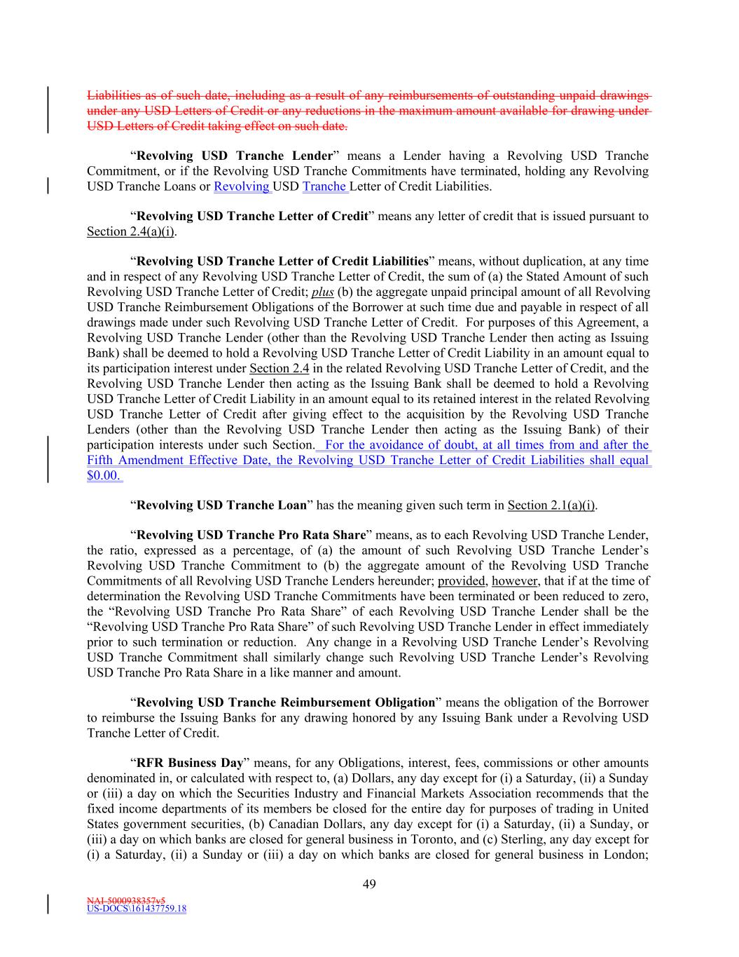 NAI-5000938357v5 US-DOCS\161437759.18 49 Liabilities as of such date, including as a result of any reimbursements of outstanding unpaid drawings under any USD Letters of Credit or any reductions in the maximum amount available for drawing under USD Letters of Credit taking effect on such date. “Revolving USD Tranche Lender” means a Lender having a Revolving USD Tranche Commitment, or if the Revolving USD Tranche Commitments have terminated, holding any Revolving USD Tranche Loans or Revolving USD Tranche Letter of Credit Liabilities. “Revolving USD Tranche Letter of Credit” means any letter of credit that is issued pursuant to Section 2.4(a)(i). “Revolving USD Tranche Letter of Credit Liabilities” means, without duplication, at any time and in respect of any Revolving USD Tranche Letter of Credit, the sum of (a) the Stated Amount of such Revolving USD Tranche Letter of Credit; plus (b) the aggregate unpaid principal amount of all Revolving USD Tranche Reimbursement Obligations of the Borrower at such time due and payable in respect of all drawings made under such Revolving USD Tranche Letter of Credit. For purposes of this Agreement, a Revolving USD Tranche Lender (other than the Revolving USD Tranche Lender then acting as Issuing Bank) shall be deemed to hold a Revolving USD Tranche Letter of Credit Liability in an amount equal to its participation interest under Section 2.4 in the related Revolving USD Tranche Letter of Credit, and the Revolving USD Tranche Lender then acting as the Issuing Bank shall be deemed to hold a Revolving USD Tranche Letter of Credit Liability in an amount equal to its retained interest in the related Revolving USD Tranche Letter of Credit after giving effect to the acquisition by the Revolving USD Tranche Lenders (other than the Revolving USD Tranche Lender then acting as the Issuing Bank) of their participation interests under such Section. For the avoidance of doubt, at all times from and after the Fifth Amendment Effective Date, the Revolving USD Tranche Letter of Credit Liabilities shall equal $0.00. “Revolving USD Tranche Loan” has the meaning given such term in Section 2.1(a)(i). “Revolving USD Tranche Pro Rata Share” means, as to each Revolving USD Tranche Lender, the ratio, expressed as a percentage, of (a) the amount of such Revolving USD Tranche Lender’s Revolving USD Tranche Commitment to (b) the aggregate amount of the Revolving USD Tranche Commitments of all Revolving USD Tranche Lenders hereunder; provided, however, that if at the time of determination the Revolving USD Tranche Commitments have been terminated or been reduced to zero, the “Revolving USD Tranche Pro Rata Share” of each Revolving USD Tranche Lender shall be the “Revolving USD Tranche Pro Rata Share” of such Revolving USD Tranche Lender in effect immediately prior to such termination or reduction. Any change in a Revolving USD Tranche Lender’s Revolving USD Tranche Commitment shall similarly change such Revolving USD Tranche Lender’s Revolving USD Tranche Pro Rata Share in a like manner and amount. “Revolving USD Tranche Reimbursement Obligation” means the obligation of the Borrower to reimburse the Issuing Banks for any drawing honored by any Issuing Bank under a Revolving USD Tranche Letter of Credit. “RFR Business Day” means, for any Obligations, interest, fees, commissions or other amounts denominated in, or calculated with respect to, (a) Dollars, any day except for (i) a Saturday, (ii) a Sunday or (iii) a day on which the Securities Industry and Financial Markets Association recommends that the fixed income departments of its members be closed for the entire day for purposes of trading in United States government securities, (b) Canadian Dollars, any day except for (i) a Saturday, (ii) a Sunday, or (iii) a day on which banks are closed for general business in Toronto, and (c) Sterling, any day except for (i) a Saturday, (ii) a Sunday or (iii) a day on which banks are closed for general business in London;