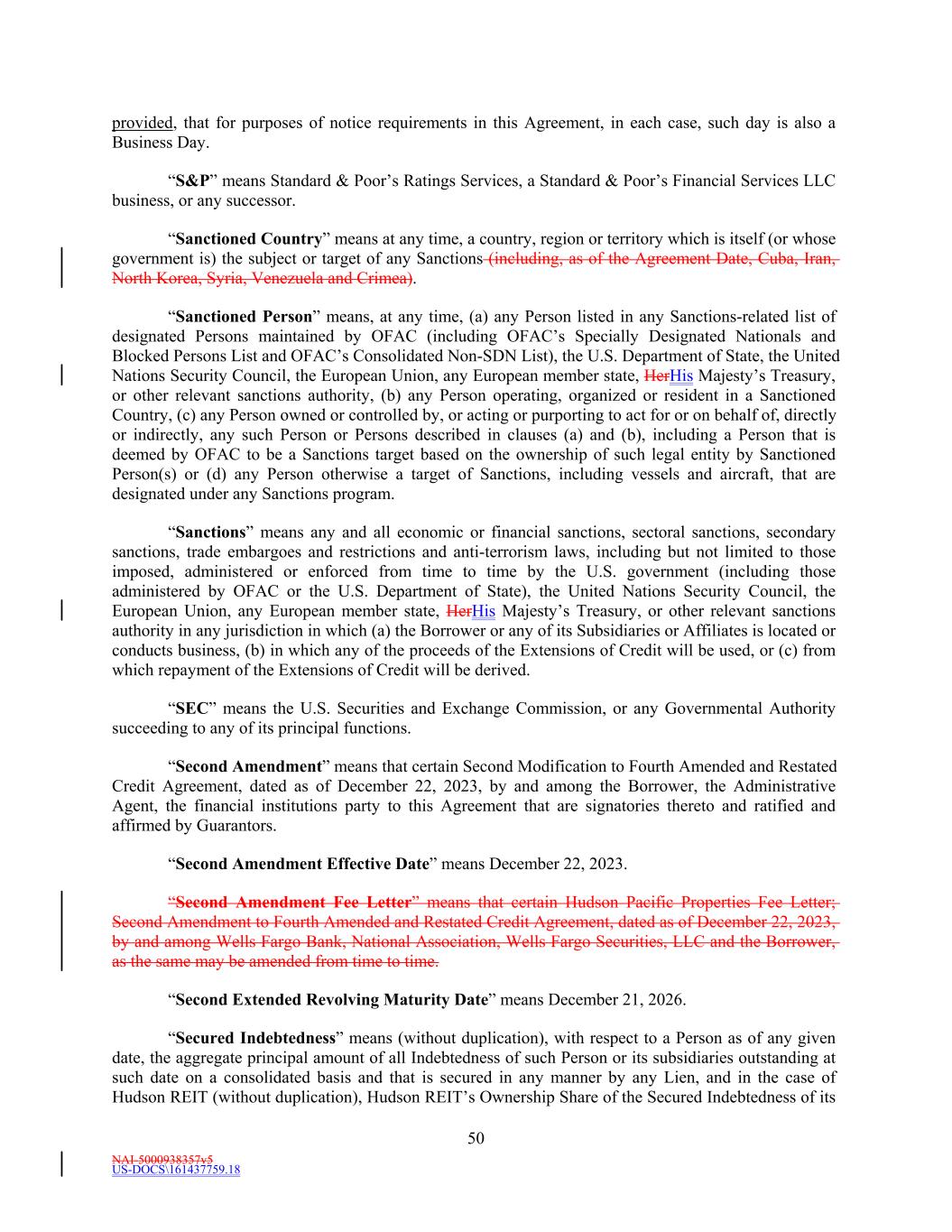 NAI-5000938357v5 US-DOCS\161437759.18 50 provided, that for purposes of notice requirements in this Agreement, in each case, such day is also a Business Day. “S&P” means Standard & Poor’s Ratings Services, a Standard & Poor’s Financial Services LLC business, or any successor. “Sanctioned Country” means at any time, a country, region or territory which is itself (or whose government is) the subject or target of any Sanctions (including, as of the Agreement Date, Cuba, Iran, North Korea, Syria, Venezuela and Crimea). “Sanctioned Person” means, at any time, (a) any Person listed in any Sanctions-related list of designated Persons maintained by OFAC (including OFAC’s Specially Designated Nationals and Blocked Persons List and OFAC’s Consolidated Non-SDN List), the U.S. Department of State, the United Nations Security Council, the European Union, any European member state, HerHis Majesty’s Treasury, or other relevant sanctions authority, (b) any Person operating, organized or resident in a Sanctioned Country, (c) any Person owned or controlled by, or acting or purporting to act for or on behalf of, directly or indirectly, any such Person or Persons described in clauses (a) and (b), including a Person that is deemed by OFAC to be a Sanctions target based on the ownership of such legal entity by Sanctioned Person(s) or (d) any Person otherwise a target of Sanctions, including vessels and aircraft, that are designated under any Sanctions program. “Sanctions” means any and all economic or financial sanctions, sectoral sanctions, secondary sanctions, trade embargoes and restrictions and anti-terrorism laws, including but not limited to those imposed, administered or enforced from time to time by the U.S. government (including those administered by OFAC or the U.S. Department of State), the United Nations Security Council, the European Union, any European member state, HerHis Majesty’s Treasury, or other relevant sanctions authority in any jurisdiction in which (a) the Borrower or any of its Subsidiaries or Affiliates is located or conducts business, (b) in which any of the proceeds of the Extensions of Credit will be used, or (c) from which repayment of the Extensions of Credit will be derived. “SEC” means the U.S. Securities and Exchange Commission, or any Governmental Authority succeeding to any of its principal functions. “Second Amendment” means that certain Second Modification to Fourth Amended and Restated Credit Agreement, dated as of December 22, 2023, by and among the Borrower, the Administrative Agent, the financial institutions party to this Agreement that are signatories thereto and ratified and affirmed by Guarantors. “Second Amendment Effective Date” means December 22, 2023. “Second Amendment Fee Letter” means that certain Hudson Pacific Properties Fee Letter; Second Amendment to Fourth Amended and Restated Credit Agreement, dated as of December 22, 2023, by and among Wells Fargo Bank, National Association, Wells Fargo Securities, LLC and the Borrower, as the same may be amended from time to time. “Second Extended Revolving Maturity Date” means December 21, 2026. “Secured Indebtedness” means (without duplication), with respect to a Person as of any given date, the aggregate principal amount of all Indebtedness of such Person or its subsidiaries outstanding at such date on a consolidated basis and that is secured in any manner by any Lien, and in the case of Hudson REIT (without duplication), Hudson REIT’s Ownership Share of the Secured Indebtedness of its