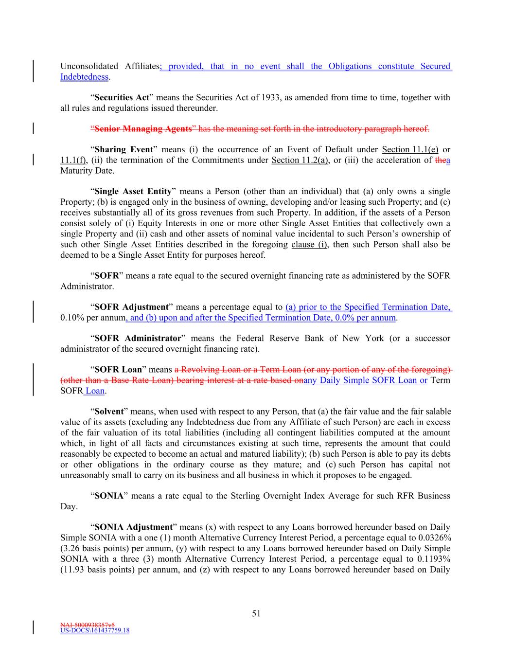 NAI-5000938357v5 US-DOCS\161437759.18 51 Unconsolidated Affiliates; provided, that in no event shall the Obligations constitute Secured Indebtedness. “Securities Act” means the Securities Act of 1933, as amended from time to time, together with all rules and regulations issued thereunder. “Senior Managing Agents” has the meaning set forth in the introductory paragraph hereof. “Sharing Event” means (i) the occurrence of an Event of Default under Section 11.1(e) or 11.1(f), (ii) the termination of the Commitments under Section 11.2(a), or (iii) the acceleration of thea Maturity Date. “Single Asset Entity” means a Person (other than an individual) that (a) only owns a single Property; (b) is engaged only in the business of owning, developing and/or leasing such Property; and (c) receives substantially all of its gross revenues from such Property. In addition, if the assets of a Person consist solely of (i) Equity Interests in one or more other Single Asset Entities that collectively own a single Property and (ii) cash and other assets of nominal value incidental to such Person’s ownership of such other Single Asset Entities described in the foregoing clause (i), then such Person shall also be deemed to be a Single Asset Entity for purposes hereof. “SOFR” means a rate equal to the secured overnight financing rate as administered by the SOFR Administrator. “SOFR Adjustment” means a percentage equal to (a) prior to the Specified Termination Date, 0.10% per annum, and (b) upon and after the Specified Termination Date, 0.0% per annum. “SOFR Administrator” means the Federal Reserve Bank of New York (or a successor administrator of the secured overnight financing rate). “SOFR Loan” means a Revolving Loan or a Term Loan (or any portion of any of the foregoing) (other than a Base Rate Loan) bearing interest at a rate based onany Daily Simple SOFR Loan or Term SOFR Loan. “Solvent” means, when used with respect to any Person, that (a) the fair value and the fair salable value of its assets (excluding any Indebtedness due from any Affiliate of such Person) are each in excess of the fair valuation of its total liabilities (including all contingent liabilities computed at the amount which, in light of all facts and circumstances existing at such time, represents the amount that could reasonably be expected to become an actual and matured liability); (b) such Person is able to pay its debts or other obligations in the ordinary course as they mature; and (c) such Person has capital not unreasonably small to carry on its business and all business in which it proposes to be engaged. “SONIA” means a rate equal to the Sterling Overnight Index Average for such RFR Business Day. “SONIA Adjustment” means (x) with respect to any Loans borrowed hereunder based on Daily Simple SONIA with a one (1) month Alternative Currency Interest Period, a percentage equal to 0.0326% (3.26 basis points) per annum, (y) with respect to any Loans borrowed hereunder based on Daily Simple SONIA with a three (3) month Alternative Currency Interest Period, a percentage equal to 0.1193% (11.93 basis points) per annum, and (z) with respect to any Loans borrowed hereunder based on Daily