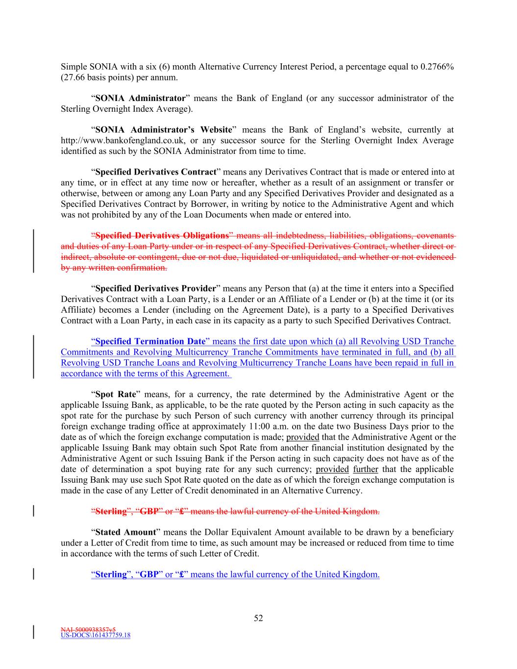 NAI-5000938357v5 US-DOCS\161437759.18 52 Simple SONIA with a six (6) month Alternative Currency Interest Period, a percentage equal to 0.2766% (27.66 basis points) per annum. “SONIA Administrator” means the Bank of England (or any successor administrator of the Sterling Overnight Index Average). “SONIA Administrator’s Website” means the Bank of England’s website, currently at http://www.bankofengland.co.uk, or any successor source for the Sterling Overnight Index Average identified as such by the SONIA Administrator from time to time. “Specified Derivatives Contract” means any Derivatives Contract that is made or entered into at any time, or in effect at any time now or hereafter, whether as a result of an assignment or transfer or otherwise, between or among any Loan Party and any Specified Derivatives Provider and designated as a Specified Derivatives Contract by Borrower, in writing by notice to the Administrative Agent and which was not prohibited by any of the Loan Documents when made or entered into. “Specified Derivatives Obligations” means all indebtedness, liabilities, obligations, covenants and duties of any Loan Party under or in respect of any Specified Derivatives Contract, whether direct or indirect, absolute or contingent, due or not due, liquidated or unliquidated, and whether or not evidenced by any written confirmation. “Specified Derivatives Provider” means any Person that (a) at the time it enters into a Specified Derivatives Contract with a Loan Party, is a Lender or an Affiliate of a Lender or (b) at the time it (or its Affiliate) becomes a Lender (including on the Agreement Date), is a party to a Specified Derivatives Contract with a Loan Party, in each case in its capacity as a party to such Specified Derivatives Contract. “Specified Termination Date” means the first date upon which (a) all Revolving USD Tranche Commitments and Revolving Multicurrency Tranche Commitments have terminated in full, and (b) all Revolving USD Tranche Loans and Revolving Multicurrency Tranche Loans have been repaid in full in accordance with the terms of this Agreement. “Spot Rate” means, for a currency, the rate determined by the Administrative Agent or the applicable Issuing Bank, as applicable, to be the rate quoted by the Person acting in such capacity as the spot rate for the purchase by such Person of such currency with another currency through its principal foreign exchange trading office at approximately 11:00 a.m. on the date two Business Days prior to the date as of which the foreign exchange computation is made; provided that the Administrative Agent or the applicable Issuing Bank may obtain such Spot Rate from another financial institution designated by the Administrative Agent or such Issuing Bank if the Person acting in such capacity does not have as of the date of determination a spot buying rate for any such currency; provided further that the applicable Issuing Bank may use such Spot Rate quoted on the date as of which the foreign exchange computation is made in the case of any Letter of Credit denominated in an Alternative Currency. “Sterling”, “GBP” or “£” means the lawful currency of the United Kingdom. “Stated Amount” means the Dollar Equivalent Amount available to be drawn by a beneficiary under a Letter of Credit from time to time, as such amount may be increased or reduced from time to time in accordance with the terms of such Letter of Credit. “Sterling”, “GBP” or “£” means the lawful currency of the United Kingdom.