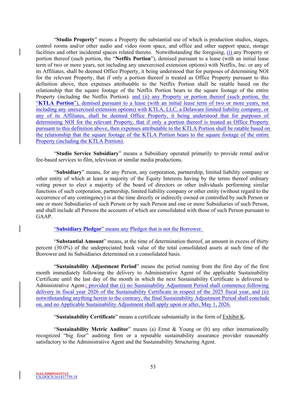 NAI-5000938357v5 US-DOCS\161437759.18 53 “Studio Property” means a Property the substantial use of which is production studios, stages, control rooms and/or other audio and video room space, and office and other support space, storage facilities and other incidental spaces related thereto. Notwithstanding the foregoing, (i) any Property or portion thereof (such portion, the “Netflix Portion”), demised pursuant to a lease (with an initial lease term of two or more years, not including any unexercised extension options) with Netflix, Inc. or any of its Affiliates, shall be deemed Office Property, it being understood that for purposes of determining NOI for the relevant Property, that if only a portion thereof is treated as Office Property pursuant to this definition above, then expenses attributable to the Netflix Portion shall be ratable based on the relationship that the square footage of the Netflix Portion bears to the square footage of the entire Property (including the Netflix Portion). and (ii) any Property or portion thereof (such portion, the “KTLA Portion”), demised pursuant to a lease (with an initial lease term of two or more years, not including any unexercised extension options) with KTLA, LLC, a Delaware limited liability company, or any of its Affiliates, shall be deemed Office Property, it being understood that for purposes of determining NOI for the relevant Property, that if only a portion thereof is treated as Office Property pursuant to this definition above, then expenses attributable to the KTLA Portion shall be ratable based on the relationship that the square footage of the KTLA Portion bears to the square footage of the entire Property (including the KTLA Portion). “Studio Service Subsidiary” means a Subsidiary operated primarily to provide rental and/or fee-based services to film, television or similar media productions. “Subsidiary” means, for any Person, any corporation, partnership, limited liability company or other entity of which at least a majority of the Equity Interests having by the terms thereof ordinary voting power to elect a majority of the board of directors or other individuals performing similar functions of such corporation, partnership, limited liability company or other entity (without regard to the occurrence of any contingency) is at the time directly or indirectly owned or controlled by such Person or one or more Subsidiaries of such Person or by such Person and one or more Subsidiaries of such Person, and shall include all Persons the accounts of which are consolidated with those of such Person pursuant to GAAP. “Subsidiary Pledgor” means any Pledgor that is not the Borrower. “Substantial Amount” means, at the time of determination thereof, an amount in excess of thirty percent (30.0%) of the undepreciated book value of the total consolidated assets at such time of the Borrower and its Subsidiaries determined on a consolidated basis. “Sustainability Adjustment Period” means the period running from the first day of the first month immediately following the delivery to Administrative Agent of the applicable Sustainability Certificate until the last day of the month in which the next Sustainability Certificate is delivered to Administrative Agent.; provided that (i) no Sustainability Adjustment Period shall commence following delivery in fiscal year 2026 of the Sustainability Certificate in respect of the 2025 fiscal year, and (ii) notwithstanding anything herein to the contrary, the final Sustainability Adjustment Period shall conclude on, and no Applicable Sustainability Adjustment shall apply upon or after, May 1, 2026. “Sustainability Certificate” means a certificate substantially in the form of Exhibit K. “Sustainability Metric Auditor” means (a) Ernst & Young or (b) any other internationally recognized “big four” auditing firm or a reputable sustainability assurance provider reasonably satisfactory to the Administrative Agent and the Sustainability Structuring Agent.