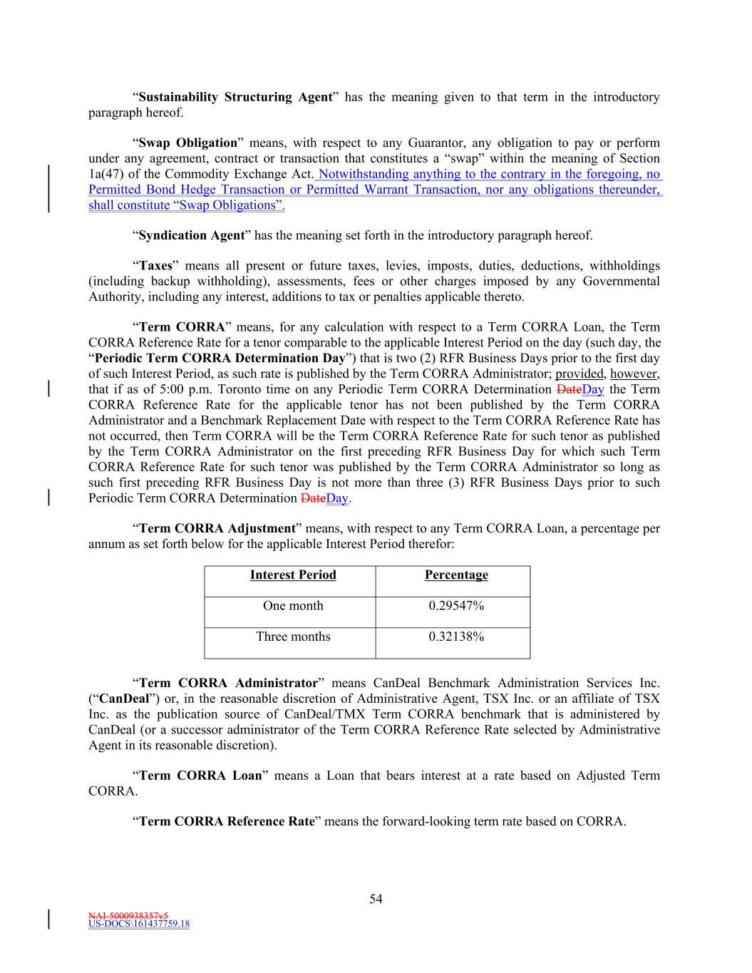NAI-5000938357v5 54 US-DOCS\161437759.18 Three months Percentage 0.32138% “Sustainability Structuring Agent” has the meaning given to that term in the introductory paragraph hereof. “Swap Obligation” means, with respect to any Guarantor, any obligation to pay or perform under any agreement, contract or transaction that constitutes a “swap” within the meaning of Section 1a(47) of the Commodity Exchange Act. Notwithstanding anything to the contrary in the foregoing, no Permitted Bond Hedge Transaction or Permitted Warrant Transaction, nor any obligations thereunder, shall constitute “Swap Obligations”. “Syndication Agent” has the meaning set forth in the introductory paragraph hereof. “Taxes” means all present or future taxes, levies, imposts, duties, deductions, withholdings (including backup withholding), assessments, fees or other charges imposed by any Governmental Authority, including any interest, additions to tax or penalties applicable thereto. “Term CORRA” means, for any calculation with respect to a Term CORRA Loan, the Term CORRA Reference Rate for a tenor comparable to the applicable Interest Period on the day (such day, the “Periodic Term CORRA Determination Day”) that is two (2) RFR Business Days prior to the first day of such Interest Period, as such rate is published by the Term CORRA Administrator; provided, however, that if as of 5:00 p.m. Toronto time on any Periodic Term CORRA Determination DateDay the Term CORRA Reference Rate for the applicable tenor has not been published by the Term CORRA Administrator and a Benchmark Replacement Date with respect to the Term CORRA Reference Rate has not occurred, then Term CORRA will be the Term CORRA Reference Rate for such tenor as published by the Term CORRA Administrator on the first preceding RFR Business Day for which such Term CORRA Reference Rate for such tenor was published by the Term CORRA Administrator so long as such first preceding RFR Business Day is not more than three (3) RFR Business Days prior to such Periodic Term CORRA Determination DateDay. “Term CORRA Adjustment” means, with respect to any Term CORRA Loan, a percentage per annum as set forth below for the applicable Interest Period therefor: “Term CORRA Administrator” means CanDeal Benchmark Administration Services Inc. (“CanDeal”) or, in the reasonable discretion of Administrative Agent, TSX Inc. or an affiliate of TSX Inc. as the publication source of CanDeal/TMX Term CORRA benchmark that is administered by CanDeal (or a successor administrator of the Term CORRA Reference Rate selected by Administrative Agent in its reasonable discretion). “Term CORRA Loan” means a Loan that bears interest at a rate based on Adjusted Term CORRA. “Term CORRA Reference Rate” means the forward-looking term rate based on CORRA. One month 0.29547% Interest Period