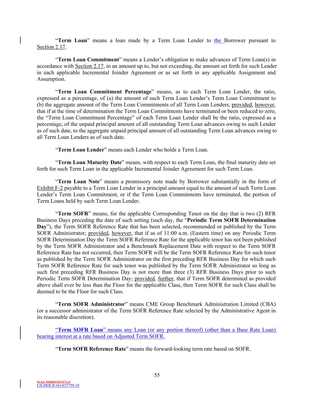 NAI-5000938357v5 US-DOCS\161437759.18 55 “Term Loan” means a loan made by a Term Loan Lender to the Borrower pursuant to Section 2.17. “Term Loan Commitment” means a Lender’s obligation to make advances of Term Loan(s) in accordance with Section 2.17, in an amount up to, but not exceeding, the amount set forth for such Lender in each applicable Incremental Joinder Agreement or as set forth in any applicable Assignment and Assumption. “Term Loan Commitment Percentage” means, as to each Term Loan Lender, the ratio, expressed as a percentage, of (a) the amount of such Term Loan Lender’s Term Loan Commitment to (b) the aggregate amount of the Term Loan Commitments of all Term Loan Lenders; provided, however, that if at the time of determination the Term Loan Commitments have terminated or been reduced to zero, the “Term Loan Commitment Percentage” of each Term Loan Lender shall be the ratio, expressed as a percentage, of the unpaid principal amount of all outstanding Term Loan advances owing to such Lender as of such date, to the aggregate unpaid principal amount of all outstanding Term Loan advances owing to all Term Loan Lenders as of such date. “Term Loan Lender” means each Lender who holds a Term Loan. “Term Loan Maturity Date” means, with respect to each Term Loan, the final maturity date set forth for such Term Loan in the applicable Incremental Joinder Agreement for such Term Loan. “Term Loan Note” means a promissory note made by Borrower substantially in the form of Exhibit F-2 payable to a Term Loan Lender in a principal amount equal to the amount of such Term Loan Lender’s Term Loan Commitment, or if the Term Loan Commitments have terminated, the portion of Term Loans held by such Term Loan Lender. “Term SOFR” means, for the applicable Corresponding Tenor on the day that is two (2) RFR Business Days preceding the date of such setting (such day, the “Periodic Term SOFR Determination Day”), the Term SOFR Reference Rate that has been selected, recommended or published by the Term SOFR Administrator; provided, however, that if as of 11:00 a.m. (Eastern time) on any Periodic Term SOFR Determination Day the Term SOFR Reference Rate for the applicable tenor has not been published by the Term SOFR Administrator and a Benchmark Replacement Date with respect to the Term SOFR Reference Rate has not occurred, then Term SOFR will be the Term SOFR Reference Rate for such tenor as published by the Term SOFR Administrator on the first preceding RFR Business Day for which such Term SOFR Reference Rate for such tenor was published by the Term SOFR Administrator so long as such first preceding RFR Business Day is not more than three (3) RFR Business Days prior to such Periodic Term SOFR Determination Day; provided, further, that if Term SOFR determined as provided above shall ever be less than the Floor for the applicable Class, then Term SOFR for such Class shall be deemed to be the Floor for such Class. “Term SOFR Administrator” means CME Group Benchmark Administration Limited (CBA) (or a successor administrator of the Term SOFR Reference Rate selected by the Administrative Agent in its reasonable discretion). “Term SOFR Loan” means any Loan (or any portion thereof) (other than a Base Rate Loan) bearing interest at a rate based on Adjusted Term SOFR. “Term SOFR Reference Rate” means the forward-looking term rate based on SOFR.