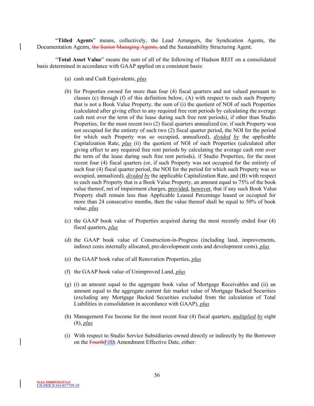 NAI-5000938357v5 US-DOCS\161437759.18 56 “Titled Agents” means, collectively, the Lead Arrangers, the Syndication Agents, the Documentation Agents, the Senior Managing Agents, and the Sustainability Structuring Agent. “Total Asset Value” means the sum of all of the following of Hudson REIT on a consolidated basis determined in accordance with GAAP applied on a consistent basis: (a) cash and Cash Equivalents, plus (b) for Properties owned for more than four (4) fiscal quarters and not valued pursuant to clauses (c) through (f) of this definition below, (A) with respect to each such Property that is not a Book Value Property, the sum of (i) the quotient of NOI of such Properties (calculated after giving effect to any required free rent periods by calculating the average cash rent over the term of the lease during such free rent periods), if other than Studio Properties, for the most recent two (2) fiscal quarters annualized (or, if such Property was not occupied for the entirety of such two (2) fiscal quarter period, the NOI for the period for which such Property was so occupied, annualized), divided by the applicable Capitalization Rate, plus (ii) the quotient of NOI of such Properties (calculated after giving effect to any required free rent periods by calculating the average cash rent over the term of the lease during such free rent periods), if Studio Properties, for the most recent four (4) fiscal quarters (or, if such Property was not occupied for the entirety of such four (4) fiscal quarter period, the NOI for the period for which such Property was so occupied, annualized), divided by the applicable Capitalization Rate, and (B) with respect to each such Property that is a Book Value Property, an amount equal to 75% of the book value thereof, net of impairment charges, provided, however, that if any such Book Value Property shall remain less than Applicable Leased Percentage leased or occupied for more than 24 consecutive months, then the value thereof shall be equal to 50% of book value, plus (c) the GAAP book value of Properties acquired during the most recently ended four (4) fiscal quarters, plus (d) the GAAP book value of Construction-in-Progress (including land, improvements, indirect costs internally allocated, pre-development costs and development costs), plus (e) the GAAP book value of all Renovation Properties, plus (f) the GAAP book value of Unimproved Land, plus (g) (i) an amount equal to the aggregate book value of Mortgage Receivables and (ii) an amount equal to the aggregate current fair market value of Mortgage Backed Securities (excluding any Mortgage Backed Securities excluded from the calculation of Total Liabilities in consolidation in accordance with GAAP), plus (h) Management Fee Income for the most recent four (4) fiscal quarters, multiplied by eight (8), plus (i) With respect to Studio Service Subsidiaries owned directly or indirectly by the Borrower on the FourthFifth Amendment Effective Date, either: