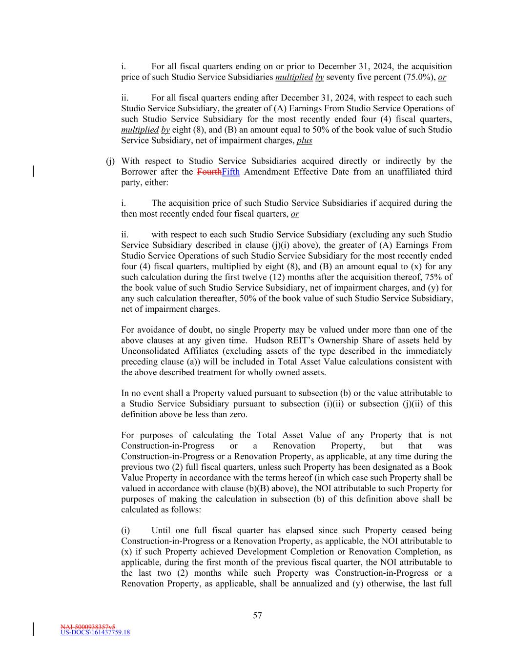 NAI-5000938357v5 US-DOCS\161437759.18 57 i. For all fiscal quarters ending on or prior to December 31, 2024, the acquisition price of such Studio Service Subsidiaries multiplied by seventy five percent (75.0%), or ii. For all fiscal quarters ending after December 31, 2024, with respect to each such Studio Service Subsidiary, the greater of (A) Earnings From Studio Service Operations of such Studio Service Subsidiary for the most recently ended four (4) fiscal quarters, multiplied by eight (8), and (B) an amount equal to 50% of the book value of such Studio Service Subsidiary, net of impairment charges, plus (j) With respect to Studio Service Subsidiaries acquired directly or indirectly by the Borrower after the FourthFifth Amendment Effective Date from an unaffiliated third party, either: i. The acquisition price of such Studio Service Subsidiaries if acquired during the then most recently ended four fiscal quarters, or ii. with respect to each such Studio Service Subsidiary (excluding any such Studio Service Subsidiary described in clause (j)(i) above), the greater of (A) Earnings From Studio Service Operations of such Studio Service Subsidiary for the most recently ended four (4) fiscal quarters, multiplied by eight (8), and (B) an amount equal to (x) for any such calculation during the first twelve (12) months after the acquisition thereof, 75% of the book value of such Studio Service Subsidiary, net of impairment charges, and (y) for any such calculation thereafter, 50% of the book value of such Studio Service Subsidiary, net of impairment charges. For avoidance of doubt, no single Property may be valued under more than one of the above clauses at any given time. Hudson REIT’s Ownership Share of assets held by Unconsolidated Affiliates (excluding assets of the type described in the immediately preceding clause (a)) will be included in Total Asset Value calculations consistent with the above described treatment for wholly owned assets. In no event shall a Property valued pursuant to subsection (b) or the value attributable to a Studio Service Subsidiary pursuant to subsection (i)(ii) or subsection (j)(ii) of this definition above be less than zero. For purposes of calculating the Total Asset Value of any Property that is not Construction-in-Progress or a Renovation Property, but that was Construction-in-Progress or a Renovation Property, as applicable, at any time during the previous two (2) full fiscal quarters, unless such Property has been designated as a Book Value Property in accordance with the terms hereof (in which case such Property shall be valued in accordance with clause (b)(B) above), the NOI attributable to such Property for purposes of making the calculation in subsection (b) of this definition above shall be calculated as follows: (i) Until one full fiscal quarter has elapsed since such Property ceased being Construction-in-Progress or a Renovation Property, as applicable, the NOI attributable to (x) if such Property achieved Development Completion or Renovation Completion, as applicable, during the first month of the previous fiscal quarter, the NOI attributable to the last two (2) months while such Property was Construction-in-Progress or a Renovation Property, as applicable, shall be annualized and (y) otherwise, the last full