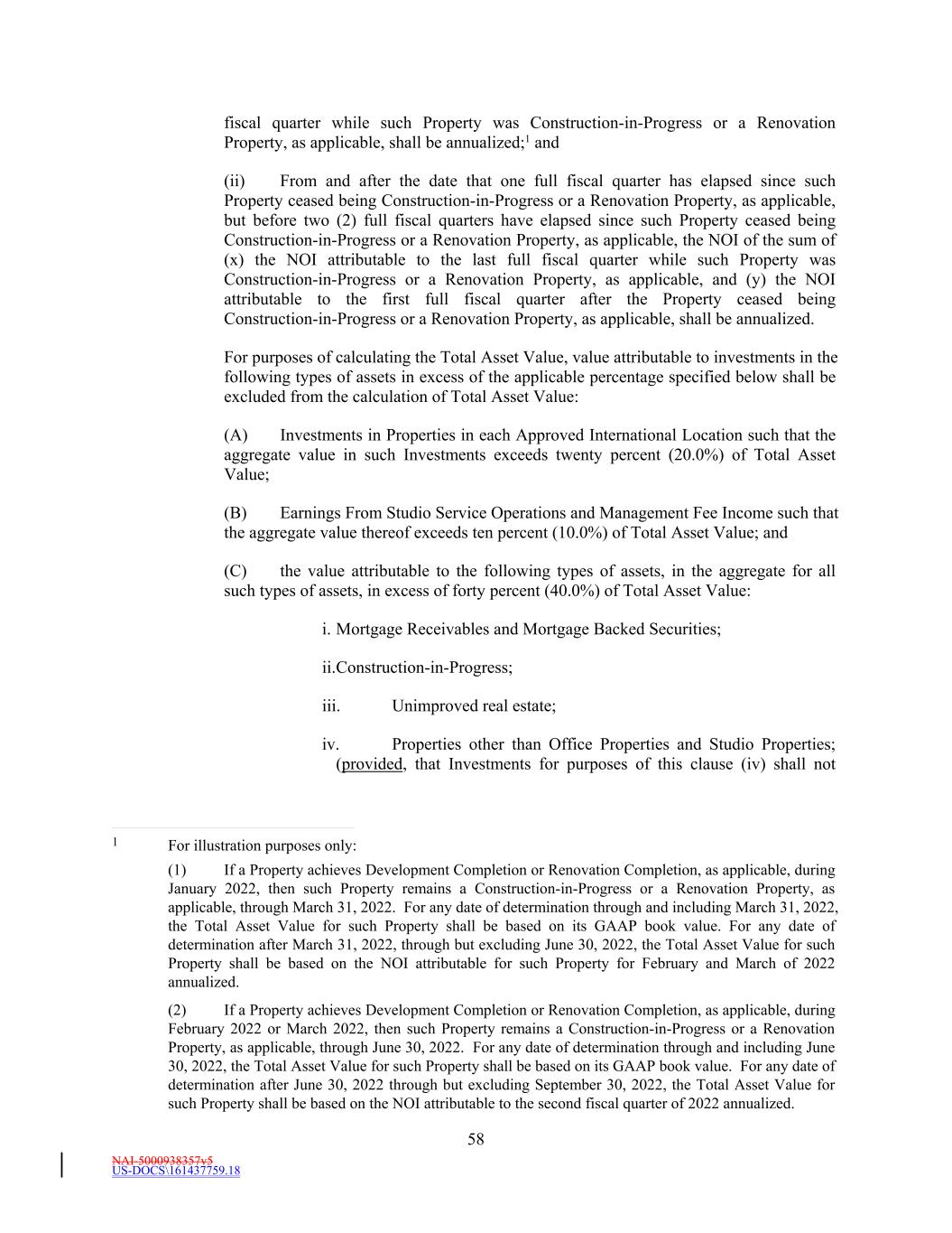 NAI-5000938357v5 US-DOCS\161437759.18 58 fiscal quarter while such Property was Construction-in-Progress or a Renovation Property, as applicable, shall be annualized;1 and (ii) From and after the date that one full fiscal quarter has elapsed since such Property ceased being Construction-in-Progress or a Renovation Property, as applicable, but before two (2) full fiscal quarters have elapsed since such Property ceased being Construction-in-Progress or a Renovation Property, as applicable, the NOI of the sum of (x) the NOI attributable to the last full fiscal quarter while such Property was Construction-in-Progress or a Renovation Property, as applicable, and (y) the NOI attributable to the first full fiscal quarter after the Property ceased being Construction-in-Progress or a Renovation Property, as applicable, shall be annualized. For purposes of calculating the Total Asset Value, value attributable to investments in the following types of assets in excess of the applicable percentage specified below shall be excluded from the calculation of Total Asset Value: (A) Investments in Properties in each Approved International Location such that the aggregate value in such Investments exceeds twenty percent (20.0%) of Total Asset Value; (B) Earnings From Studio Service Operations and Management Fee Income such that the aggregate value thereof exceeds ten percent (10.0%) of Total Asset Value; and (C) the value attributable to the following types of assets, in the aggregate for all such types of assets, in excess of forty percent (40.0%) of Total Asset Value: i. Mortgage Receivables and Mortgage Backed Securities; ii.Construction-in-Progress; iii. Unimproved real estate; iv. Properties other than Office Properties and Studio Properties; (provided, that Investments for purposes of this clause (iv) shall not 1 For illustration purposes only: (1) If a Property achieves Development Completion or Renovation Completion, as applicable, during January 2022, then such Property remains a Construction-in-Progress or a Renovation Property, as applicable, through March 31, 2022. For any date of determination through and including March 31, 2022, the Total Asset Value for such Property shall be based on its GAAP book value. For any date of determination after March 31, 2022, through but excluding June 30, 2022, the Total Asset Value for such Property shall be based on the NOI attributable for such Property for February and March of 2022 annualized. (2) If a Property achieves Development Completion or Renovation Completion, as applicable, during February 2022 or March 2022, then such Property remains a Construction-in-Progress or a Renovation Property, as applicable, through June 30, 2022. For any date of determination through and including June 30, 2022, the Total Asset Value for such Property shall be based on its GAAP book value. For any date of determination after June 30, 2022 through but excluding September 30, 2022, the Total Asset Value for such Property shall be based on the NOI attributable to the second fiscal quarter of 2022 annualized.