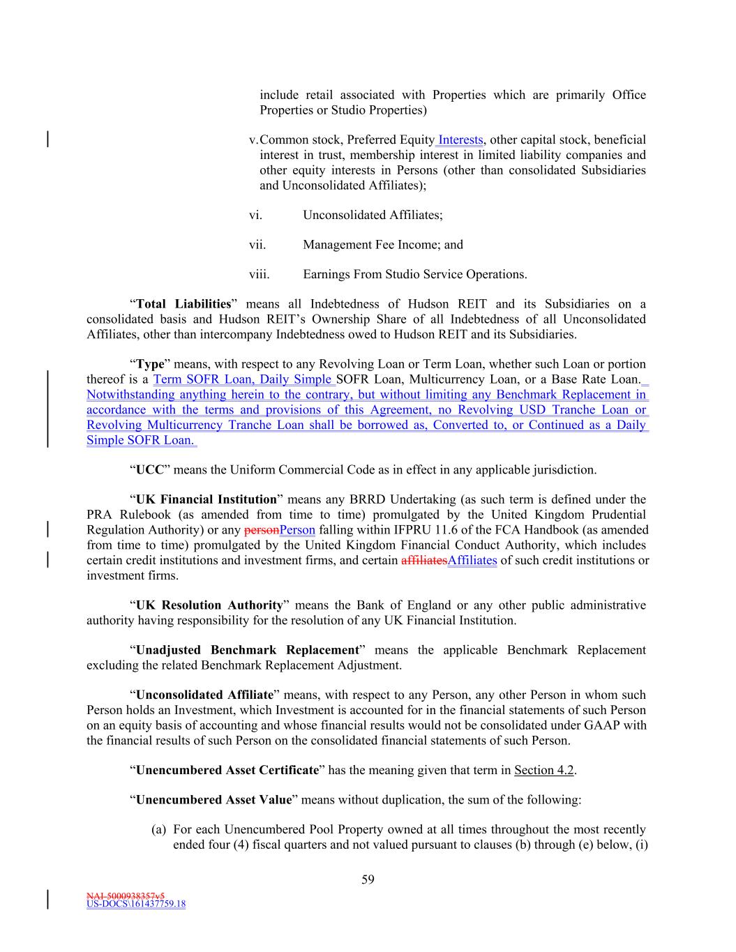 NAI-5000938357v5 US-DOCS\161437759.18 59 include retail associated with Properties which are primarily Office Properties or Studio Properties) v.Common stock, Preferred Equity Interests, other capital stock, beneficial interest in trust, membership interest in limited liability companies and other equity interests in Persons (other than consolidated Subsidiaries and Unconsolidated Affiliates); vi. Unconsolidated Affiliates; vii. Management Fee Income; and viii. Earnings From Studio Service Operations. “Total Liabilities” means all Indebtedness of Hudson REIT and its Subsidiaries on a consolidated basis and Hudson REIT’s Ownership Share of all Indebtedness of all Unconsolidated Affiliates, other than intercompany Indebtedness owed to Hudson REIT and its Subsidiaries. “Type” means, with respect to any Revolving Loan or Term Loan, whether such Loan or portion thereof is a Term SOFR Loan, Daily Simple SOFR Loan, Multicurrency Loan, or a Base Rate Loan. Notwithstanding anything herein to the contrary, but without limiting any Benchmark Replacement in accordance with the terms and provisions of this Agreement, no Revolving USD Tranche Loan or Revolving Multicurrency Tranche Loan shall be borrowed as, Converted to, or Continued as a Daily Simple SOFR Loan. “UCC” means the Uniform Commercial Code as in effect in any applicable jurisdiction. “UK Financial Institution” means any BRRD Undertaking (as such term is defined under the PRA Rulebook (as amended from time to time) promulgated by the United Kingdom Prudential Regulation Authority) or any personPerson falling within IFPRU 11.6 of the FCA Handbook (as amended from time to time) promulgated by the United Kingdom Financial Conduct Authority, which includes certain credit institutions and investment firms, and certain affiliatesAffiliates of such credit institutions or investment firms. “UK Resolution Authority” means the Bank of England or any other public administrative authority having responsibility for the resolution of any UK Financial Institution. “Unadjusted Benchmark Replacement” means the applicable Benchmark Replacement excluding the related Benchmark Replacement Adjustment. “Unconsolidated Affiliate” means, with respect to any Person, any other Person in whom such Person holds an Investment, which Investment is accounted for in the financial statements of such Person on an equity basis of accounting and whose financial results would not be consolidated under GAAP with the financial results of such Person on the consolidated financial statements of such Person. “Unencumbered Asset Certificate” has the meaning given that term in Section 4.2. “Unencumbered Asset Value” means without duplication, the sum of the following: (a) For each Unencumbered Pool Property owned at all times throughout the most recently ended four (4) fiscal quarters and not valued pursuant to clauses (b) through (e) below, (i)