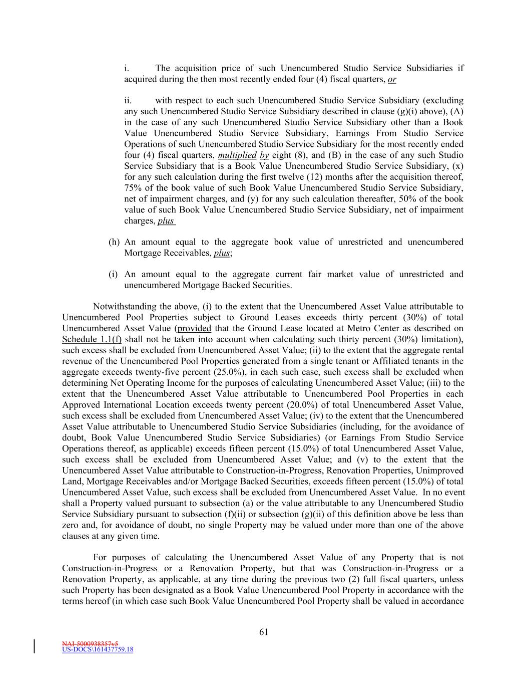 NAI-5000938357v5 US-DOCS\161437759.18 61 i. The acquisition price of such Unencumbered Studio Service Subsidiaries if acquired during the then most recently ended four (4) fiscal quarters, or ii. with respect to each such Unencumbered Studio Service Subsidiary (excluding any such Unencumbered Studio Service Subsidiary described in clause (g)(i) above), (A) in the case of any such Unencumbered Studio Service Subsidiary other than a Book Value Unencumbered Studio Service Subsidiary, Earnings From Studio Service Operations of such Unencumbered Studio Service Subsidiary for the most recently ended four (4) fiscal quarters, multiplied by eight (8), and (B) in the case of any such Studio Service Subsidiary that is a Book Value Unencumbered Studio Service Subsidiary, (x) for any such calculation during the first twelve (12) months after the acquisition thereof, 75% of the book value of such Book Value Unencumbered Studio Service Subsidiary, net of impairment charges, and (y) for any such calculation thereafter, 50% of the book value of such Book Value Unencumbered Studio Service Subsidiary, net of impairment charges, plus (h) An amount equal to the aggregate book value of unrestricted and unencumbered Mortgage Receivables, plus; (i) An amount equal to the aggregate current fair market value of unrestricted and unencumbered Mortgage Backed Securities. Notwithstanding the above, (i) to the extent that the Unencumbered Asset Value attributable to Unencumbered Pool Properties subject to Ground Leases exceeds thirty percent (30%) of total Unencumbered Asset Value (provided that the Ground Lease located at Metro Center as described on Schedule 1.1(f) shall not be taken into account when calculating such thirty percent (30%) limitation), such excess shall be excluded from Unencumbered Asset Value; (ii) to the extent that the aggregate rental revenue of the Unencumbered Pool Properties generated from a single tenant or Affiliated tenants in the aggregate exceeds twenty-five percent (25.0%), in each such case, such excess shall be excluded when determining Net Operating Income for the purposes of calculating Unencumbered Asset Value; (iii) to the extent that the Unencumbered Asset Value attributable to Unencumbered Pool Properties in each Approved International Location exceeds twenty percent (20.0%) of total Unencumbered Asset Value, such excess shall be excluded from Unencumbered Asset Value; (iv) to the extent that the Unencumbered Asset Value attributable to Unencumbered Studio Service Subsidiaries (including, for the avoidance of doubt, Book Value Unencumbered Studio Service Subsidiaries) (or Earnings From Studio Service Operations thereof, as applicable) exceeds fifteen percent (15.0%) of total Unencumbered Asset Value, such excess shall be excluded from Unencumbered Asset Value; and (v) to the extent that the Unencumbered Asset Value attributable to Construction-in-Progress, Renovation Properties, Unimproved Land, Mortgage Receivables and/or Mortgage Backed Securities, exceeds fifteen percent (15.0%) of total Unencumbered Asset Value, such excess shall be excluded from Unencumbered Asset Value. In no event shall a Property valued pursuant to subsection (a) or the value attributable to any Unencumbered Studio Service Subsidiary pursuant to subsection (f)(ii) or subsection (g)(ii) of this definition above be less than zero and, for avoidance of doubt, no single Property may be valued under more than one of the above clauses at any given time. For purposes of calculating the Unencumbered Asset Value of any Property that is not Construction-in-Progress or a Renovation Property, but that was Construction-in-Progress or a Renovation Property, as applicable, at any time during the previous two (2) full fiscal quarters, unless such Property has been designated as a Book Value Unencumbered Pool Property in accordance with the terms hereof (in which case such Book Value Unencumbered Pool Property shall be valued in accordance