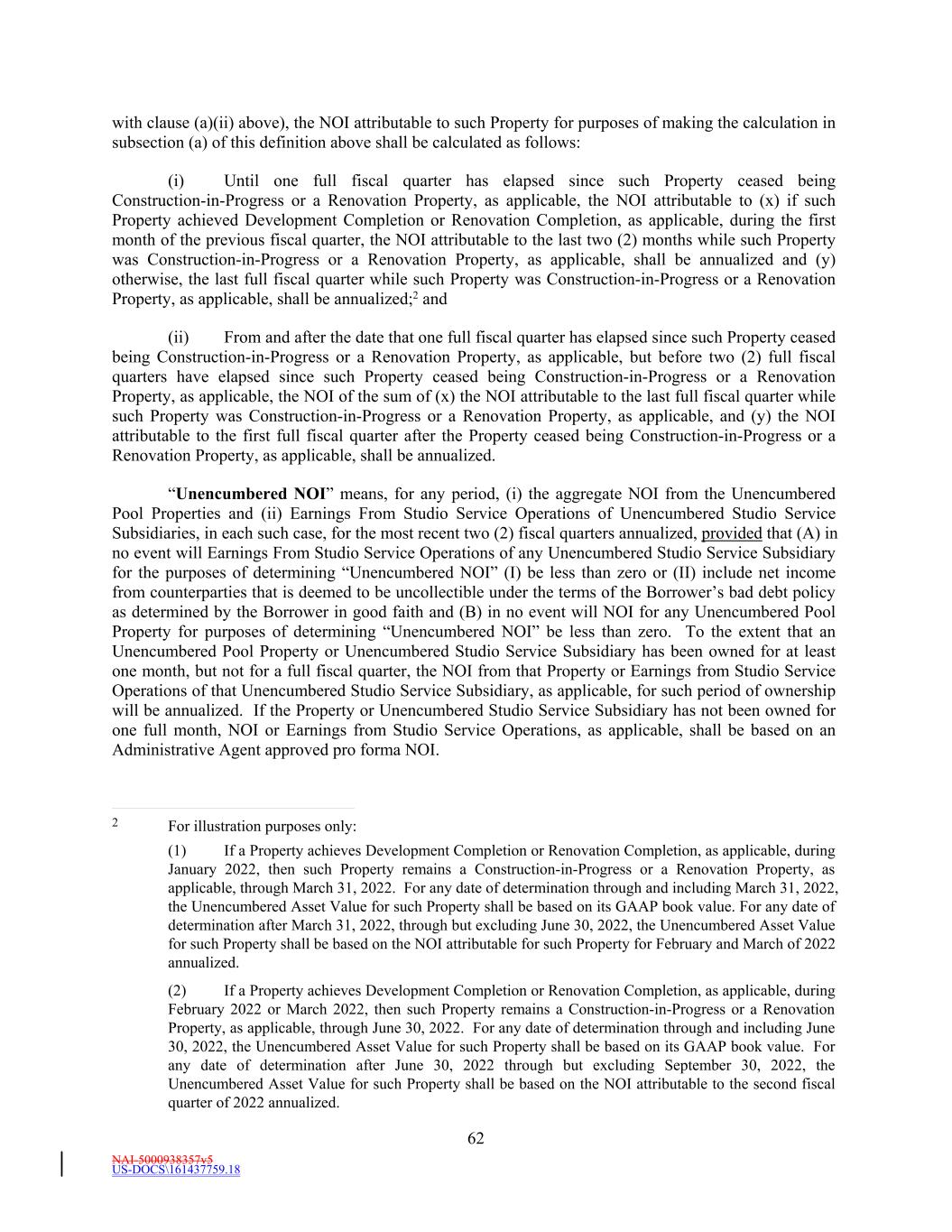 NAI-5000938357v5 US-DOCS\161437759.18 62 with clause (a)(ii) above), the NOI attributable to such Property for purposes of making the calculation in subsection (a) of this definition above shall be calculated as follows: (i) Until one full fiscal quarter has elapsed since such Property ceased being Construction-in-Progress or a Renovation Property, as applicable, the NOI attributable to (x) if such Property achieved Development Completion or Renovation Completion, as applicable, during the first month of the previous fiscal quarter, the NOI attributable to the last two (2) months while such Property was Construction-in-Progress or a Renovation Property, as applicable, shall be annualized and (y) otherwise, the last full fiscal quarter while such Property was Construction-in-Progress or a Renovation Property, as applicable, shall be annualized;2 and (ii) From and after the date that one full fiscal quarter has elapsed since such Property ceased being Construction-in-Progress or a Renovation Property, as applicable, but before two (2) full fiscal quarters have elapsed since such Property ceased being Construction-in-Progress or a Renovation Property, as applicable, the NOI of the sum of (x) the NOI attributable to the last full fiscal quarter while such Property was Construction-in-Progress or a Renovation Property, as applicable, and (y) the NOI attributable to the first full fiscal quarter after the Property ceased being Construction-in-Progress or a Renovation Property, as applicable, shall be annualized. “Unencumbered NOI” means, for any period, (i) the aggregate NOI from the Unencumbered Pool Properties and (ii) Earnings From Studio Service Operations of Unencumbered Studio Service Subsidiaries, in each such case, for the most recent two (2) fiscal quarters annualized, provided that (A) in no event will Earnings From Studio Service Operations of any Unencumbered Studio Service Subsidiary for the purposes of determining “Unencumbered NOI” (I) be less than zero or (II) include net income from counterparties that is deemed to be uncollectible under the terms of the Borrower’s bad debt policy as determined by the Borrower in good faith and (B) in no event will NOI for any Unencumbered Pool Property for purposes of determining “Unencumbered NOI” be less than zero. To the extent that an Unencumbered Pool Property or Unencumbered Studio Service Subsidiary has been owned for at least one month, but not for a full fiscal quarter, the NOI from that Property or Earnings from Studio Service Operations of that Unencumbered Studio Service Subsidiary, as applicable, for such period of ownership will be annualized. If the Property or Unencumbered Studio Service Subsidiary has not been owned for one full month, NOI or Earnings from Studio Service Operations, as applicable, shall be based on an Administrative Agent approved pro forma NOI. 2 For illustration purposes only: (1) If a Property achieves Development Completion or Renovation Completion, as applicable, during January 2022, then such Property remains a Construction-in-Progress or a Renovation Property, as applicable, through March 31, 2022. For any date of determination through and including March 31, 2022, the Unencumbered Asset Value for such Property shall be based on its GAAP book value. For any date of determination after March 31, 2022, through but excluding June 30, 2022, the Unencumbered Asset Value for such Property shall be based on the NOI attributable for such Property for February and March of 2022 annualized. (2) If a Property achieves Development Completion or Renovation Completion, as applicable, during February 2022 or March 2022, then such Property remains a Construction-in-Progress or a Renovation Property, as applicable, through June 30, 2022. For any date of determination through and including June 30, 2022, the Unencumbered Asset Value for such Property shall be based on its GAAP book value. For any date of determination after June 30, 2022 through but excluding September 30, 2022, the Unencumbered Asset Value for such Property shall be based on the NOI attributable to the second fiscal quarter of 2022 annualized.