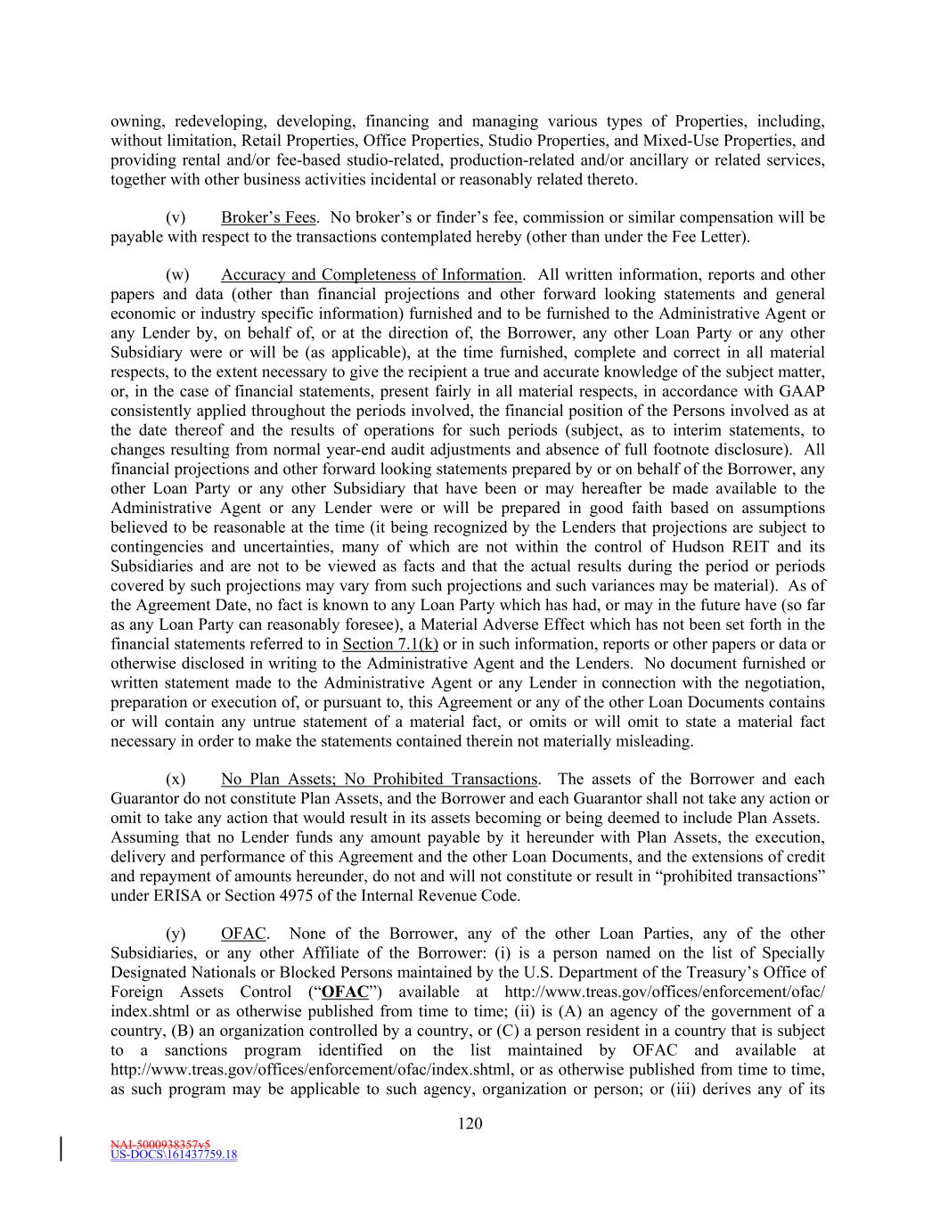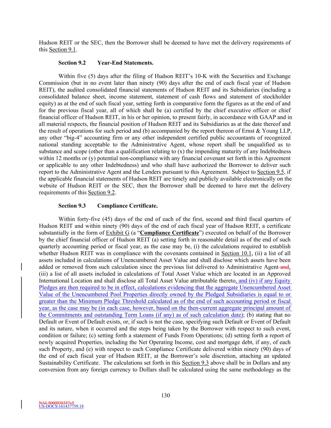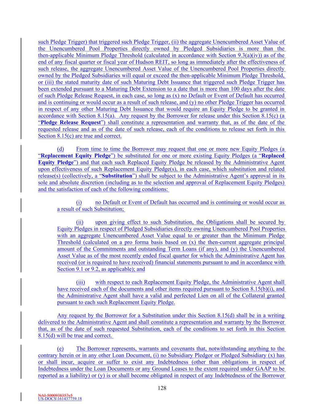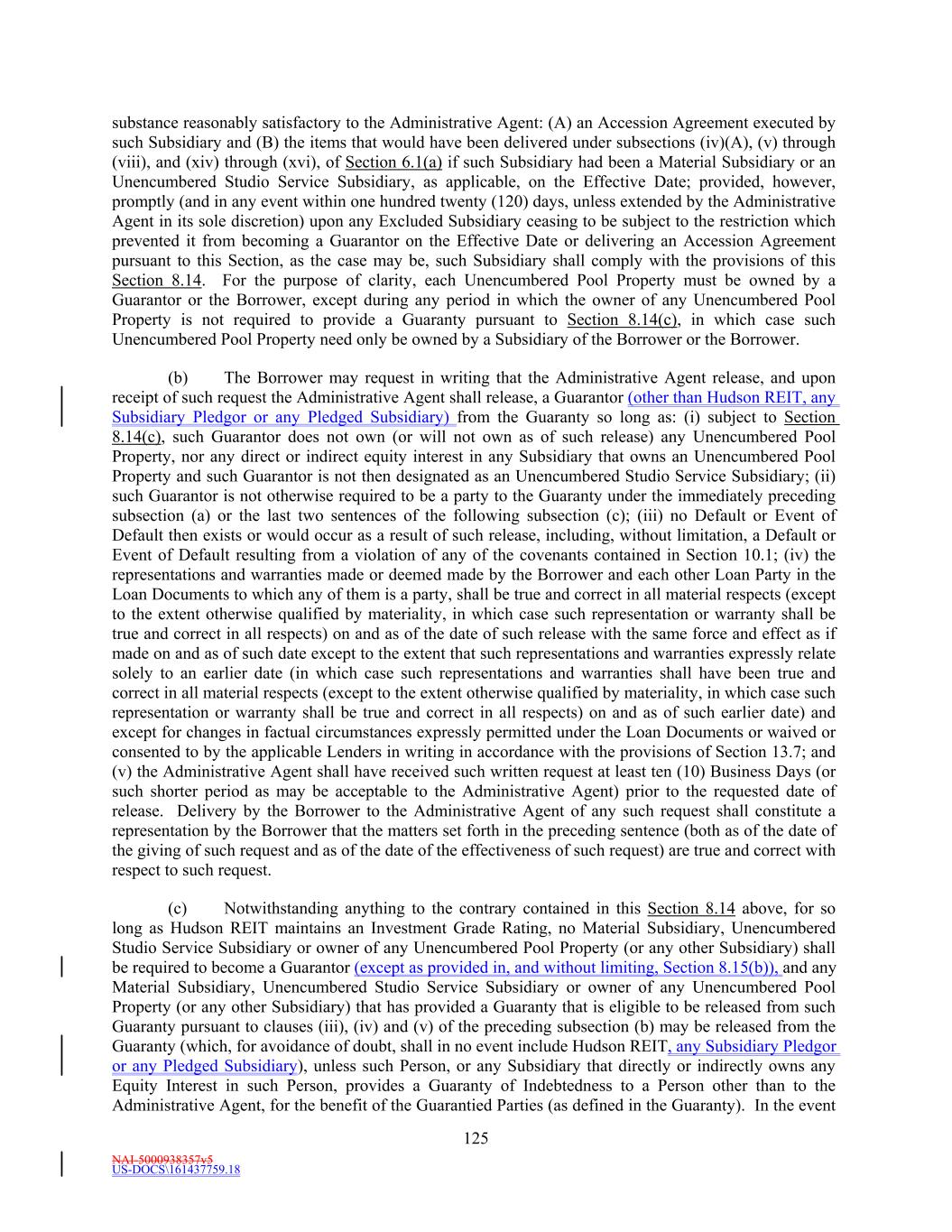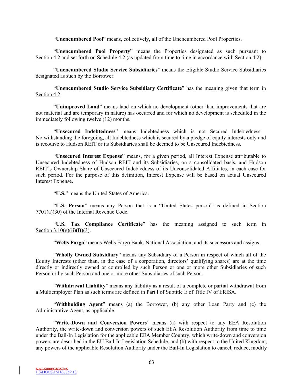 NAI-5000938357v5 US-DOCS\161437759.18 63 “Unencumbered Pool” means, collectively, all of the Unencumbered Pool Properties. “Unencumbered Pool Property” means the Properties designated as such pursuant to Section 4.2 and set forth on Schedule 4.2 (as updated from time to time in accordance with Section 4.2). “Unencumbered Studio Service Subsidiaries” means the Eligible Studio Service Subsidiaries designated as such by the Borrower. “Unencumbered Studio Service Subsidiary Certificate” has the meaning given that term in Section 4.2. “Unimproved Land” means land on which no development (other than improvements that are not material and are temporary in nature) has occurred and for which no development is scheduled in the immediately following twelve (12) months. “Unsecured Indebtedness” means Indebtedness which is not Secured Indebtedness. Notwithstanding the foregoing, all Indebtedness which is secured by a pledge of equity interests only and is recourse to Hudson REIT or its Subsidiaries shall be deemed to be Unsecured Indebtedness. “Unsecured Interest Expense” means, for a given period, all Interest Expense attributable to Unsecured Indebtedness of Hudson REIT and its Subsidiaries, on a consolidated basis, and Hudson REIT’s Ownership Share of Unsecured Indebtedness of its Unconsolidated Affiliates, in each case for such period. For the purpose of this definition, Interest Expense will be based on actual Unsecured Interest Expense. “U.S.” means the United States of America. “U.S. Person” means any Person that is a “United States person” as defined in Section 7701(a)(30) of the Internal Revenue Code. “U.S. Tax Compliance Certificate” has the meaning assigned to such term in Section 3.10(g)(ii)(B)(3). “Wells Fargo” means Wells Fargo Bank, National Association, and its successors and assigns. “Wholly Owned Subsidiary” means any Subsidiary of a Person in respect of which all of the Equity Interests (other than, in the case of a corporation, directors’ qualifying shares) are at the time directly or indirectly owned or controlled by such Person or one or more other Subsidiaries of such Person or by such Person and one or more other Subsidiaries of such Person. “Withdrawal Liability” means any liability as a result of a complete or partial withdrawal from a Multiemployer Plan as such terms are defined in Part I of Subtitle E of Title IV of ERISA. “Withholding Agent” means (a) the Borrower, (b) any other Loan Party and (c) the Administrative Agent, as applicable. “Write-Down and Conversion Powers” means (a) with respect to any EEA Resolution Authority, the write-down and conversion powers of such EEA Resolution Authority from time to time under the Bail-In Legislation for the applicable EEA Member Country, which write-down and conversion powers are described in the EU Bail-In Legislation Schedule, and (b) with respect to the United Kingdom, any powers of the applicable Resolution Authority under the Bail-In Legislation to cancel, reduce, modify