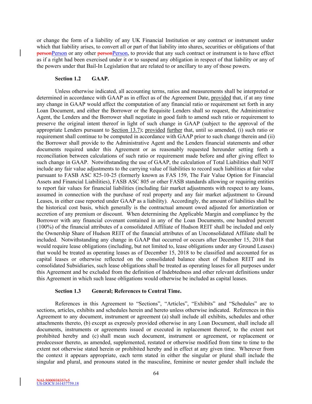 NAI-5000938357v5 US-DOCS\161437759.18 64 or change the form of a liability of any UK Financial Institution or any contract or instrument under which that liability arises, to convert all or part of that liability into shares, securities or obligations of that personPerson or any other personPerson, to provide that any such contract or instrument is to have effect as if a right had been exercised under it or to suspend any obligation in respect of that liability or any of the powers under that Bail-In Legislation that are related to or ancillary to any of those powers. Section 1.2 GAAP. Unless otherwise indicated, all accounting terms, ratios and measurements shall be interpreted or determined in accordance with GAAP as in effect as of the Agreement Date, provided that, if at any time any change in GAAP would affect the computation of any financial ratio or requirement set forth in any Loan Document, and either the Borrower or the Requisite Lenders shall so request, the Administrative Agent, the Lenders and the Borrower shall negotiate in good faith to amend such ratio or requirement to preserve the original intent thereof in light of such change in GAAP (subject to the approval of the appropriate Lenders pursuant to Section 13.7); provided further that, until so amended, (i) such ratio or requirement shall continue to be computed in accordance with GAAP prior to such change therein and (ii) the Borrower shall provide to the Administrative Agent and the Lenders financial statements and other documents required under this Agreement or as reasonably requested hereunder setting forth a reconciliation between calculations of such ratio or requirement made before and after giving effect to such change in GAAP. Notwithstanding the use of GAAP, the calculation of Total Liabilities shall NOT include any fair value adjustments to the carrying value of liabilities to record such liabilities at fair value pursuant to FASB ASC 825-10-25 (formerly known as FAS 159, The Fair Value Option for Financial Assets and Financial Liabilities), FASB ASC 805 or other FASB standards allowing or requiring entities to report fair values for financial liabilities (including fair market adjustments with respect to any loans, assumed in connection with the purchase of real property and any fair market adjustment to Ground Leases, in either case reported under GAAP as a liability). Accordingly, the amount of liabilities shall be the historical cost basis, which generally is the contractual amount owed adjusted for amortization or accretion of any premium or discount. When determining the Applicable Margin and compliance by the Borrower with any financial covenant contained in any of the Loan Documents, one hundred percent (100%) of the financial attributes of a consolidated Affiliate of Hudson REIT shall be included and only the Ownership Share of Hudson REIT of the financial attributes of an Unconsolidated Affiliate shall be included. Notwithstanding any change in GAAP that occurred or occurs after December 15, 2018 that would require lease obligations (including, but not limited to, lease obligations under any Ground Leases) that would be treated as operating leases as of December 15, 2018 to be classified and accounted for as capital leases or otherwise reflected on the consolidated balance sheet of Hudson REIT and its consolidated Subsidiaries, such lease obligations shall be treated as operating leases for all purposes under this Agreement and be excluded from the definition of Indebtedness and other relevant definitions under this Agreement in which such lease obligations would otherwise be included as capital leases. Section 1.3 General; References to Central Time. References in this Agreement to “Sections”, “Articles”, “Exhibits” and “Schedules” are to sections, articles, exhibits and schedules herein and hereto unless otherwise indicated. References in this Agreement to any document, instrument or agreement (a) shall include all exhibits, schedules and other attachments thereto, (b) except as expressly provided otherwise in any Loan Document, shall include all documents, instruments or agreements issued or executed in replacement thereof, to the extent not prohibited hereby and (c) shall mean such document, instrument or agreement, or replacement or predecessor thereto, as amended, supplemented, restated or otherwise modified from time to time to the extent not otherwise stated herein or prohibited hereby and in effect at any given time. Wherever from the context it appears appropriate, each term stated in either the singular or plural shall include the singular and plural, and pronouns stated in the masculine, feminine or neuter gender shall include the
