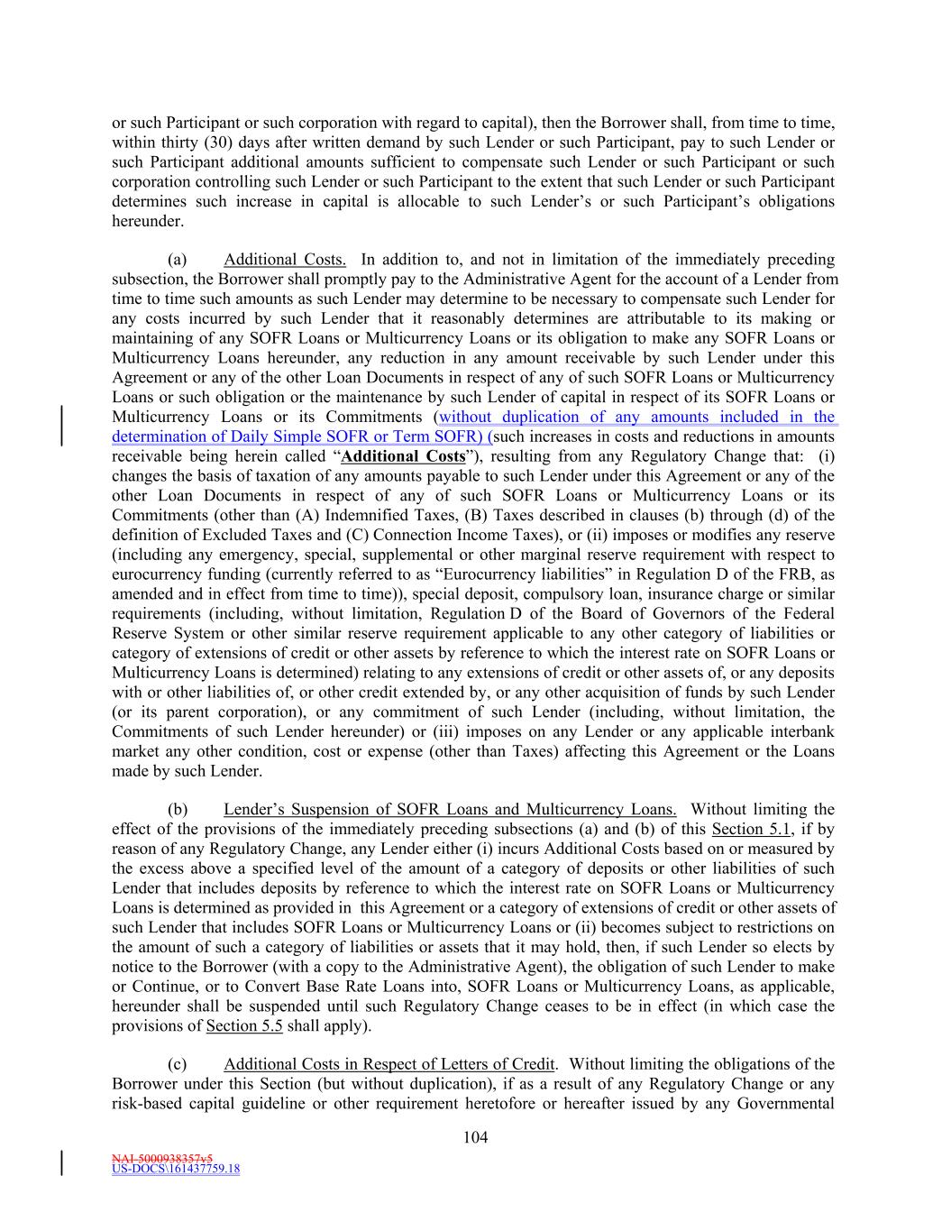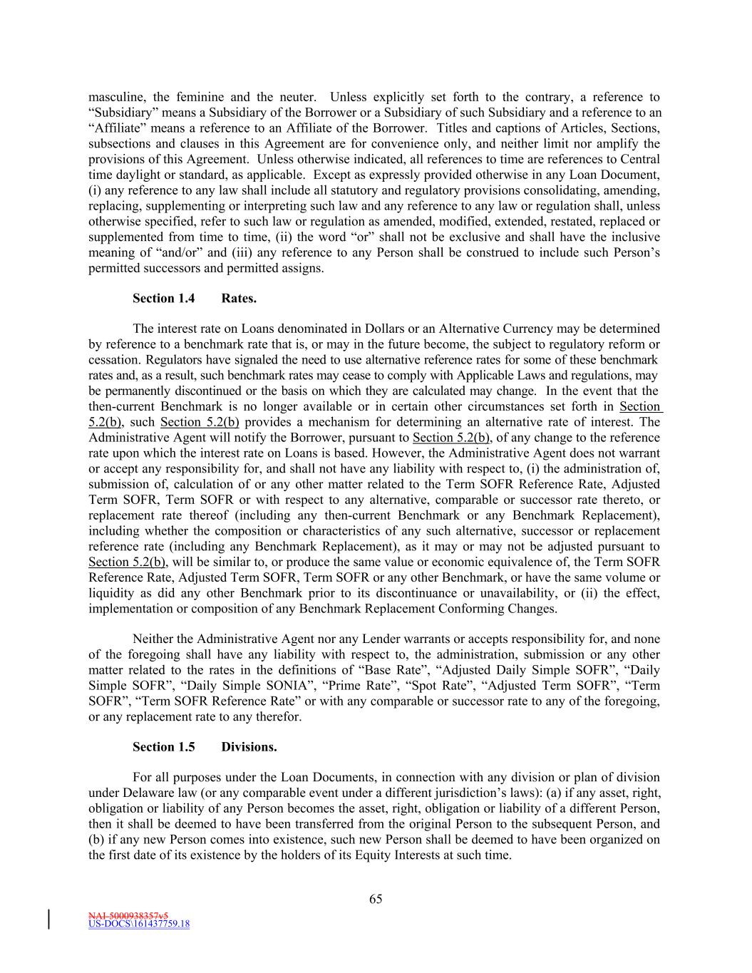 NAI-5000938357v5 US-DOCS\161437759.18 65 masculine, the feminine and the neuter. Unless explicitly set forth to the contrary, a reference to “Subsidiary” means a Subsidiary of the Borrower or a Subsidiary of such Subsidiary and a reference to an “Affiliate” means a reference to an Affiliate of the Borrower. Titles and captions of Articles, Sections, subsections and clauses in this Agreement are for convenience only, and neither limit nor amplify the provisions of this Agreement. Unless otherwise indicated, all references to time are references to Central time daylight or standard, as applicable. Except as expressly provided otherwise in any Loan Document, (i) any reference to any law shall include all statutory and regulatory provisions consolidating, amending, replacing, supplementing or interpreting such law and any reference to any law or regulation shall, unless otherwise specified, refer to such law or regulation as amended, modified, extended, restated, replaced or supplemented from time to time, (ii) the word “or” shall not be exclusive and shall have the inclusive meaning of “and/or” and (iii) any reference to any Person shall be construed to include such Person’s permitted successors and permitted assigns. Section 1.4 Rates. The interest rate on Loans denominated in Dollars or an Alternative Currency may be determined by reference to a benchmark rate that is, or may in the future become, the subject to regulatory reform or cessation. Regulators have signaled the need to use alternative reference rates for some of these benchmark rates and, as a result, such benchmark rates may cease to comply with Applicable Laws and regulations, may be permanently discontinued or the basis on which they are calculated may change. In the event that the then-current Benchmark is no longer available or in certain other circumstances set forth in Section 5.2(b), such Section 5.2(b) provides a mechanism for determining an alternative rate of interest. The Administrative Agent will notify the Borrower, pursuant to Section 5.2(b), of any change to the reference rate upon which the interest rate on Loans is based. However, the Administrative Agent does not warrant or accept any responsibility for, and shall not have any liability with respect to, (i) the administration of, submission of, calculation of or any other matter related to the Term SOFR Reference Rate, Adjusted Term SOFR, Term SOFR or with respect to any alternative, comparable or successor rate thereto, or replacement rate thereof (including any then-current Benchmark or any Benchmark Replacement), including whether the composition or characteristics of any such alternative, successor or replacement reference rate (including any Benchmark Replacement), as it may or may not be adjusted pursuant to Section 5.2(b), will be similar to, or produce the same value or economic equivalence of, the Term SOFR Reference Rate, Adjusted Term SOFR, Term SOFR or any other Benchmark, or have the same volume or liquidity as did any other Benchmark prior to its discontinuance or unavailability, or (ii) the effect, implementation or composition of any Benchmark Replacement Conforming Changes. Neither the Administrative Agent nor any Lender warrants or accepts responsibility for, and none of the foregoing shall have any liability with respect to, the administration, submission or any other matter related to the rates in the definitions of “Base Rate”, “Adjusted Daily Simple SOFR”, “Daily Simple SOFR”, “Daily Simple SONIA”, “Prime Rate”, “Spot Rate”, “Adjusted Term SOFR”, “Term SOFR”, “Term SOFR Reference Rate” or with any comparable or successor rate to any of the foregoing, or any replacement rate to any therefor. Section 1.5 Divisions. For all purposes under the Loan Documents, in connection with any division or plan of division under Delaware law (or any comparable event under a different jurisdiction’s laws): (a) if any asset, right, obligation or liability of any Person becomes the asset, right, obligation or liability of a different Person, then it shall be deemed to have been transferred from the original Person to the subsequent Person, and (b) if any new Person comes into existence, such new Person shall be deemed to have been organized on the first date of its existence by the holders of its Equity Interests at such time.