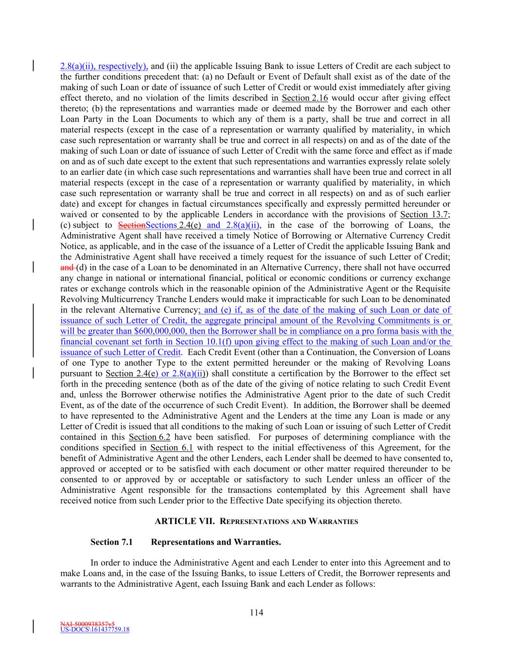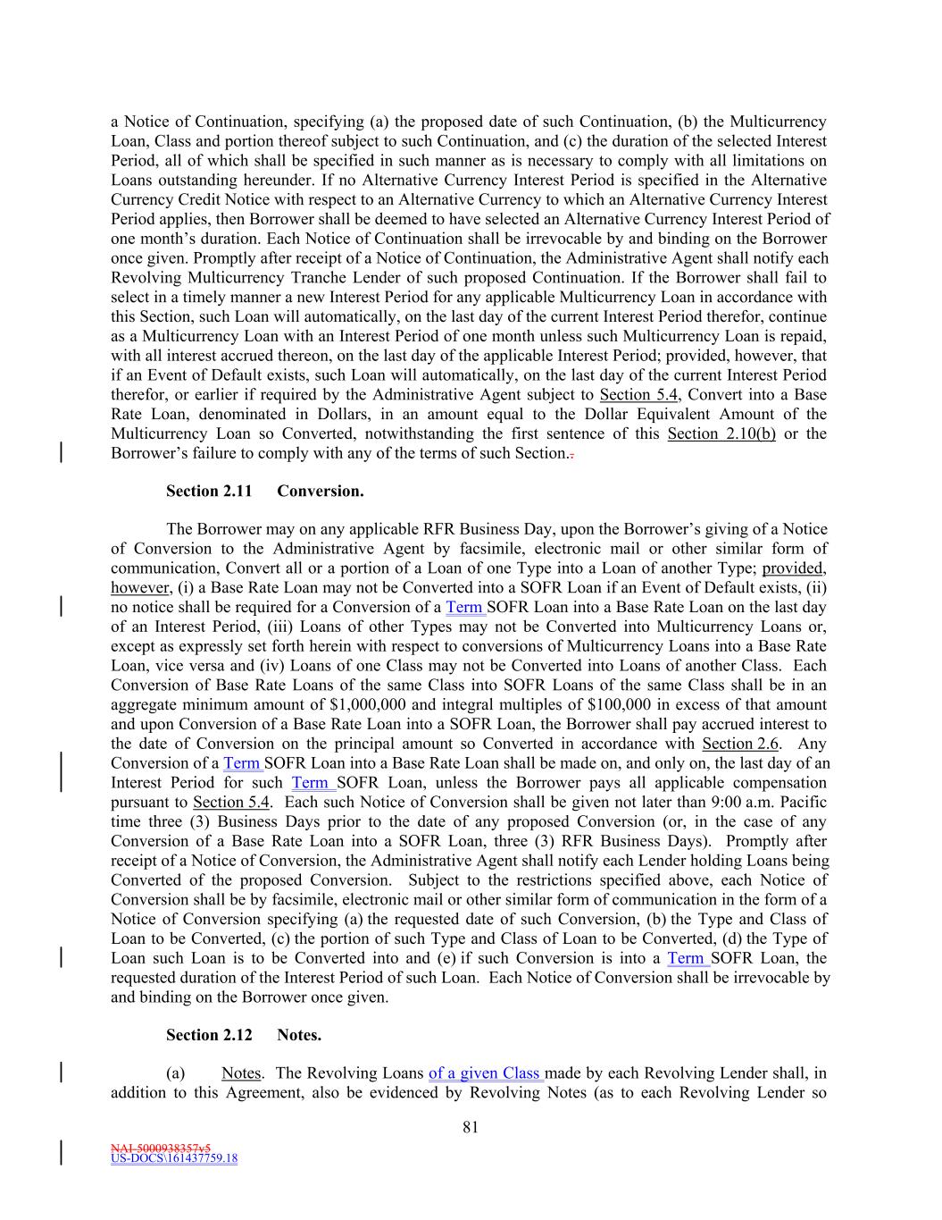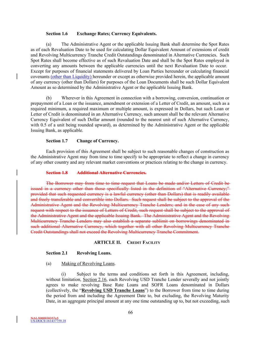 NAI-5000938357v5 US-DOCS\161437759.18 66 Section 1.6 Exchange Rates; Currency Equivalents. (a) The Administrative Agent or the applicable Issuing Bank shall determine the Spot Rates as of each Revaluation Date to be used for calculating Dollar Equivalent Amount of extensions of credit and Revolving Multicurrency Tranche Credit Outstandings denominated in Alternative Currencies. Such Spot Rates shall become effective as of such Revaluation Date and shall be the Spot Rates employed in converting any amounts between the applicable currencies until the next Revaluation Date to occur. Except for purposes of financial statements delivered by Loan Parties hereunder or calculating financial covenants (other than Liquidity) hereunder or except as otherwise provided herein, the applicable amount of any currency (other than Dollars) for purposes of the Loan Documents shall be such Dollar Equivalent Amount as so determined by the Administrative Agent or the applicable Issuing Bank. (b) Wherever in this Agreement in connection with a borrowing, conversion, continuation or prepayment of a Loan or the issuance, amendment or extension of a Letter of Credit, an amount, such as a required minimum, a required maximum or multiple amount, is expressed in Dollars, but such Loan or Letter of Credit is denominated in an Alternative Currency, such amount shall be the relevant Alternative Currency Equivalent of such Dollar amount (rounded to the nearest unit of such Alternative Currency, with 0.5 of a unit being rounded upward), as determined by the Administrative Agent or the applicable Issuing Bank, as applicable. Section 1.7 Change of Currency. Each provision of this Agreement shall be subject to such reasonable changes of construction as the Administrative Agent may from time to time specify to be appropriate to reflect a change in currency of any other country and any relevant market conventions or practices relating to the change in currency. Section 1.8 Additional Alternative Currencies. The Borrower may from time to time request that Loans be made and/or Letters of Credit be issued in a currency other than those specifically listed in the definition of “Alternative Currency;” provided that such requested currency is a lawful currency (other than Dollars) that is readily available and freely transferable and convertible into Dollars. Such request shall be subject to the approval of the Administrative Agent and the Revolving Multicurrency Tranche Lenders; and in the case of any such request with respect to the issuance of Letters of Credit, such request shall be subject to the approval of the Administrative Agent and the applicable Issuing Bank. The Administrative Agent and the Revolving Multicurrency Tranche Lenders may also establish a separate sublimit on borrowings denominated in such additional Alternative Currency, which together with all other Revolving Multicurrency Tranche Credit Outstandings shall not exceed the Revolving Multicurrency Tranche Commitment. ARTICLE II. CREDIT FACILITY Section 2.1 Revolving Loans. (a) Making of Revolving Loans. (i) Subject to the terms and conditions set forth in this Agreement, including, without limitation, Section 2.16, each Revolving USD Tranche Lender severally and not jointly agrees to make revolving Base Rate Loans and SOFR Loans denominated in Dollars (collectively, the “Revolving USD Tranche Loans”) to the Borrower from time to time during the period from and including the Agreement Date to, but excluding, the Revolving Maturity Date, in an aggregate principal amount at any one time outstanding up to, but not exceeding, such