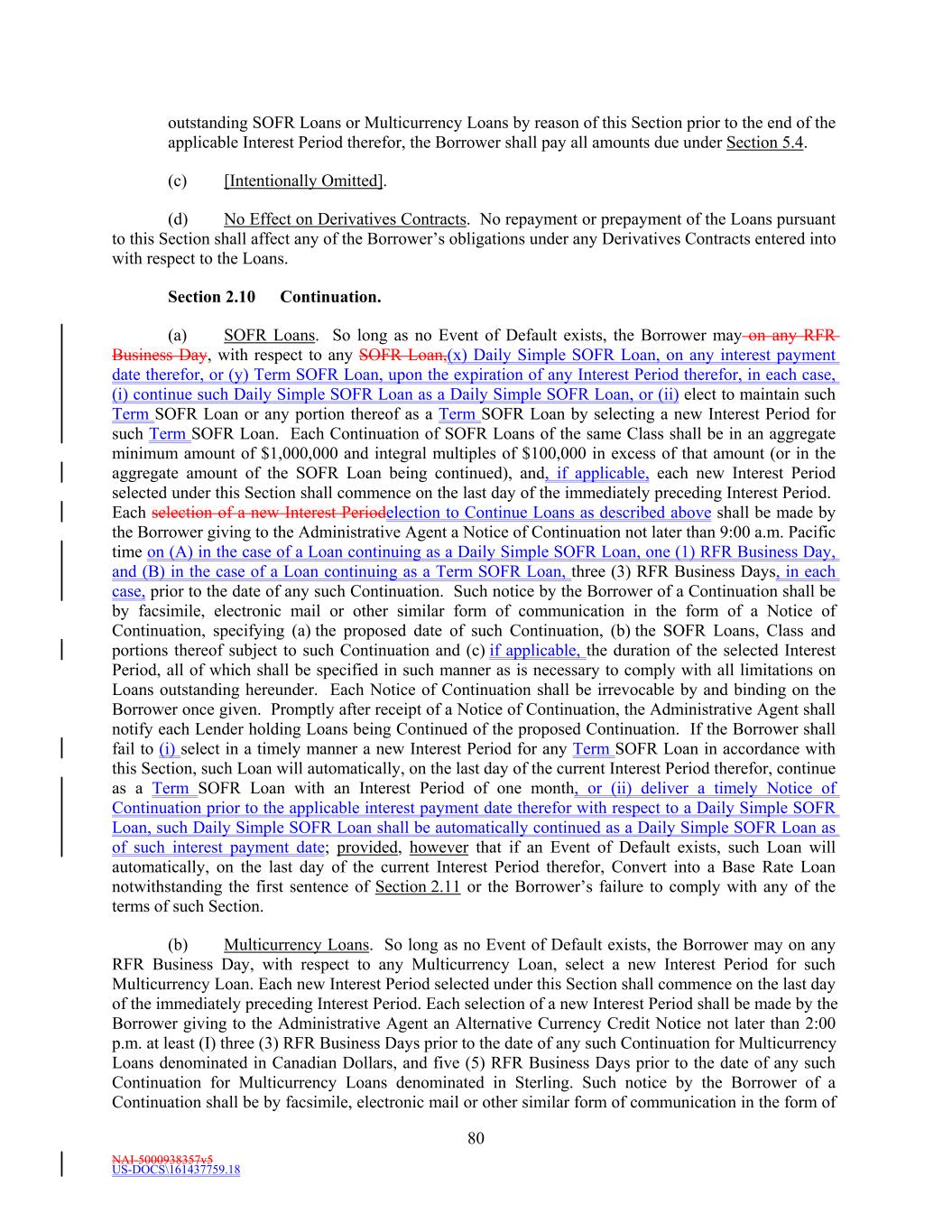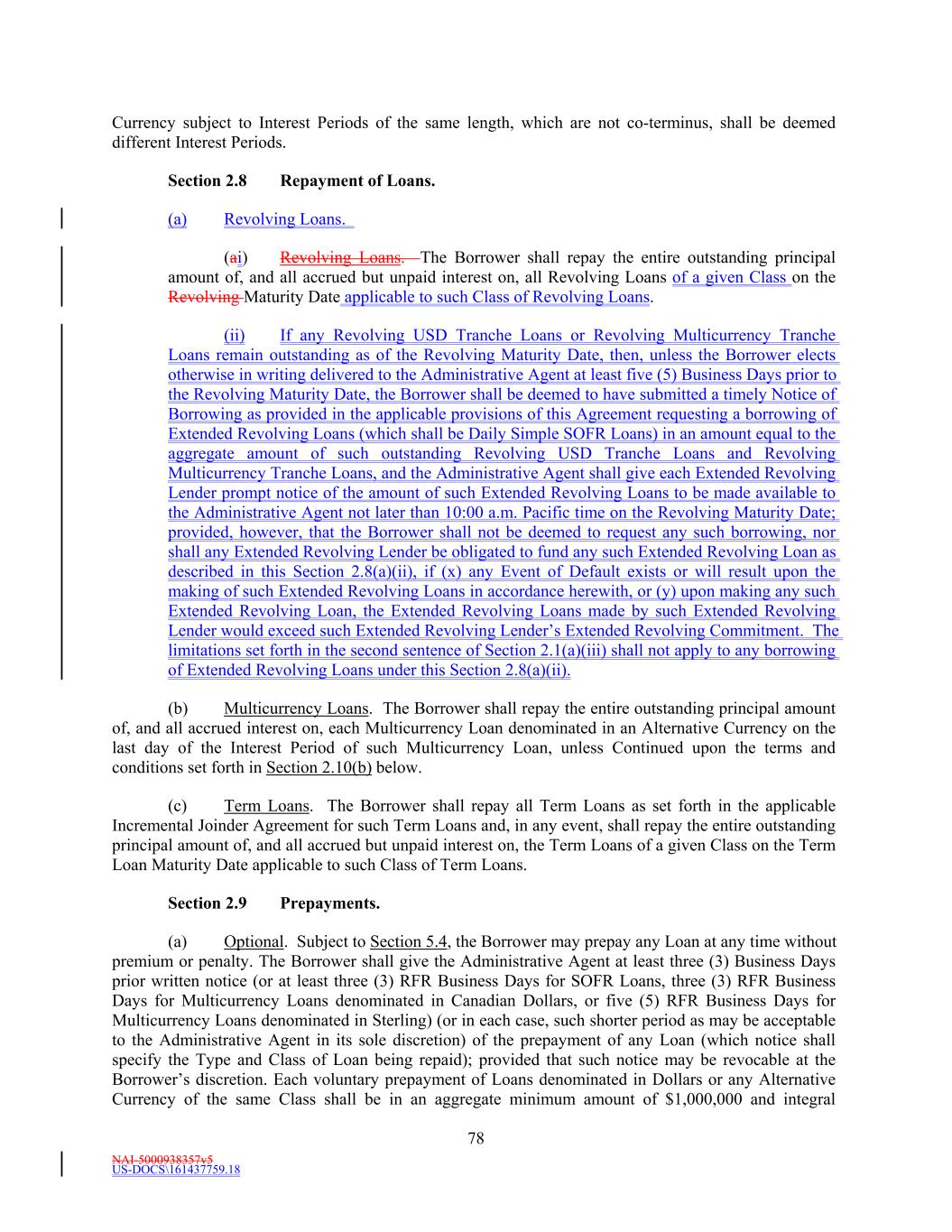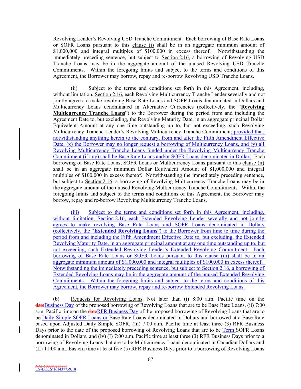 NAI-5000938357v5 US-DOCS\161437759.18 67 Revolving Lender’s Revolving USD Tranche Commitment. Each borrowing of Base Rate Loans or SOFR Loans pursuant to this clause (i) shall be in an aggregate minimum amount of $1,000,000 and integral multiples of $100,000 in excess thereof. Notwithstanding the immediately preceding sentence, but subject to Section 2.16, a borrowing of Revolving USD Tranche Loans may be in the aggregate amount of the unused Revolving USD Tranche Commitments. Within the foregoing limits and subject to the terms and conditions of this Agreement, the Borrower may borrow, repay and re-borrow Revolving USD Tranche Loans. (ii) Subject to the terms and conditions set forth in this Agreement, including, without limitation, Section 2.16, each Revolving Multicurrency Tranche Lender severally and not jointly agrees to make revolving Base Rate Loans and SOFR Loans denominated in Dollars and Multicurrency Loans denominated in Alternative Currencies (collectively, the “Revolving Multicurrency Tranche Loans”) to the Borrower during the period from and including the Agreement Date to, but excluding, the Revolving Maturity Date, in an aggregate principal Dollar Equivalent Amount at any one time outstanding up to, but not exceeding, such Revolving Multicurrency Tranche Lender’s Revolving Multicurrency Tranche Commitment; provided that, notwithstanding anything herein to the contrary, from and after the Fifth Amendment Effective Date, (x) the Borrower may no longer request a borrowing of Multicurrency Loans, and (y) all Revolving Multicurrency Tranche Loans funded under the Revolving Multicurrency Tranche Commitment (if any) shall be Base Rate Loans and/or SOFR Loans denominated in Dollars. Each borrowing of Base Rate Loans, SOFR Loans or Multicurrency Loans pursuant to this clause (ii) shall be in an aggregate minimum Dollar Equivalent Amount of $1,000,000 and integral multiples of $100,000 in excess thereof. Notwithstanding the immediately preceding sentence, but subject to Section 2.16, a borrowing of Revolving Multicurrency Tranche Loans may be in the aggregate amount of the unused Revolving Multicurrency Tranche Commitments. Within the foregoing limits and subject to the terms and conditions of this Agreement, the Borrower may borrow, repay and re-borrow Revolving Multicurrency Tranche Loans. (iii) Subject to the terms and conditions set forth in this Agreement, including, without limitation, Section 2.16, each Extended Revolving Lender severally and not jointly agrees to make revolving Base Rate Loans and SOFR Loans denominated in Dollars (collectively, the “Extended Revolving Loans”) to the Borrower from time to time during the period from and including the Fifth Amendment Effective Date to, but excluding, the Extended Revolving Maturity Date, in an aggregate principal amount at any one time outstanding up to, but not exceeding, such Extended Revolving Lender’s Extended Revolving Commitment. Each borrowing of Base Rate Loans or SOFR Loans pursuant to this clause (iii) shall be in an aggregate minimum amount of $1,000,000 and integral multiples of $100,000 in excess thereof. Notwithstanding the immediately preceding sentence, but subject to Section 2.16, a borrowing of Extended Revolving Loans may be in the aggregate amount of the unused Extended Revolving Commitments. Within the foregoing limits and subject to the terms and conditions of this Agreement, the Borrower may borrow, repay and re-borrow Extended Revolving Loans. (b) Requests for Revolving Loans. Not later than (i) 8:00 a.m. Pacific time on the dateBusiness Day of the proposed borrowing of Revolving Loans that are to be Base Rate Loans, (ii) 7:00 a.m. Pacific time on the dateRFR Business Day of the proposed borrowing of Revolving Loans that are to be Daily Simple SOFR Loans or Base Rate Loans denominated in Dollars and borrowed at a Base Rate based upon Adjusted Daily Simple SOFR, (iii) 7:00 a.m. Pacific time at least three (3) RFR Business Days prior to the date of the proposed borrowing of Revolving Loans that are to be Term SOFR Loans denominated in Dollars, and (iv) (I) 7:00 a.m. Pacific time at least three (3) RFR Business Days prior to a borrowing of Revolving Loans that are to be Multicurrency Loans denominated in Canadian Dollars and (II) 11:00 a.m. Eastern time at least five (5) RFR Business Days prior to a borrowing of Revolving Loans