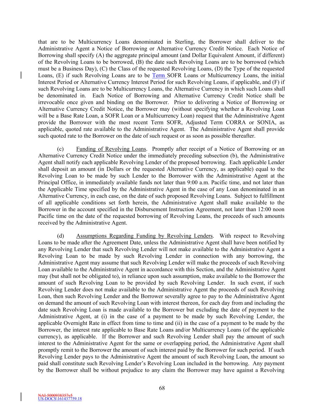 NAI-5000938357v5 US-DOCS\161437759.18 68 that are to be Multicurrency Loans denominated in Sterling, the Borrower shall deliver to the Administrative Agent a Notice of Borrowing or Alternative Currency Credit Notice. Each Notice of Borrowing shall specify (A) the aggregate principal amount (and Dollar Equivalent Amount, if different) of the Revolving Loans to be borrowed, (B) the date such Revolving Loans are to be borrowed (which must be a Business Day), (C) the Class of the requested Revolving Loans, (D) the Type of the requested Loans, (E) if such Revolving Loans are to be Term SOFR Loans or Multicurrency Loans, the initial Interest Period or Alternative Currency Interest Period for such Revolving Loans, if applicable, and (F) if such Revolving Loans are to be Multicurrency Loans, the Alternative Currency in which such Loans shall be denominated in. Each Notice of Borrowing and Alternative Currency Credit Notice shall be irrevocable once given and binding on the Borrower. Prior to delivering a Notice of Borrowing or Alternative Currency Credit Notice, the Borrower may (without specifying whether a Revolving Loan will be a Base Rate Loan, a SOFR Loan or a Multicurrency Loan) request that the Administrative Agent provide the Borrower with the most recent Term SOFR, Adjusted Term CORRA or SONIA, as applicable, quoted rate available to the Administrative Agent. The Administrative Agent shall provide such quoted rate to the Borrower on the date of such request or as soon as possible thereafter. (c) Funding of Revolving Loans. Promptly after receipt of a Notice of Borrowing or an Alternative Currency Credit Notice under the immediately preceding subsection (b), the Administrative Agent shall notify each applicable Revolving Lender of the proposed borrowing. Each applicable Lender shall deposit an amount (in Dollars or the requested Alternative Currency, as applicable) equal to the Revolving Loan to be made by such Lender to the Borrower with the Administrative Agent at the Principal Office, in immediately available funds not later than 9:00 a.m. Pacific time, and not later than the Applicable Time specified by the Administrative Agent in the case of any Loan denominated in an Alternative Currency, in each case, on the date of such proposed Revolving Loans. Subject to fulfillment of all applicable conditions set forth herein, the Administrative Agent shall make available to the Borrower in the account specified in the Disbursement Instruction Agreement, not later than 12:00 noon Pacific time on the date of the requested borrowing of Revolving Loans, the proceeds of such amounts received by the Administrative Agent. (d) Assumptions Regarding Funding by Revolving Lenders. With respect to Revolving Loans to be made after the Agreement Date, unless the Administrative Agent shall have been notified by any Revolving Lender that such Revolving Lender will not make available to the Administrative Agent a Revolving Loan to be made by such Revolving Lender in connection with any borrowing, the Administrative Agent may assume that such Revolving Lender will make the proceeds of such Revolving Loan available to the Administrative Agent in accordance with this Section, and the Administrative Agent may (but shall not be obligated to), in reliance upon such assumption, make available to the Borrower the amount of such Revolving Loan to be provided by such Revolving Lender. In such event, if such Revolving Lender does not make available to the Administrative Agent the proceeds of such Revolving Loan, then such Revolving Lender and the Borrower severally agree to pay to the Administrative Agent on demand the amount of such Revolving Loan with interest thereon, for each day from and including the date such Revolving Loan is made available to the Borrower but excluding the date of payment to the Administrative Agent, at (i) in the case of a payment to be made by such Revolving Lender, the applicable Overnight Rate in effect from time to time and (ii) in the case of a payment to be made by the Borrower, the interest rate applicable to Base Rate Loans and/or Multicurrency Loans (of the applicable currency), as applicable. If the Borrower and such Revolving Lender shall pay the amount of such interest to the Administrative Agent for the same or overlapping period, the Administrative Agent shall promptly remit to the Borrower the amount of such interest paid by the Borrower for such period. If such Revolving Lender pays to the Administrative Agent the amount of such Revolving Loan, the amount so paid shall constitute such Revolving Lender’s Revolving Loan included in the borrowing. Any payment by the Borrower shall be without prejudice to any claim the Borrower may have against a Revolving