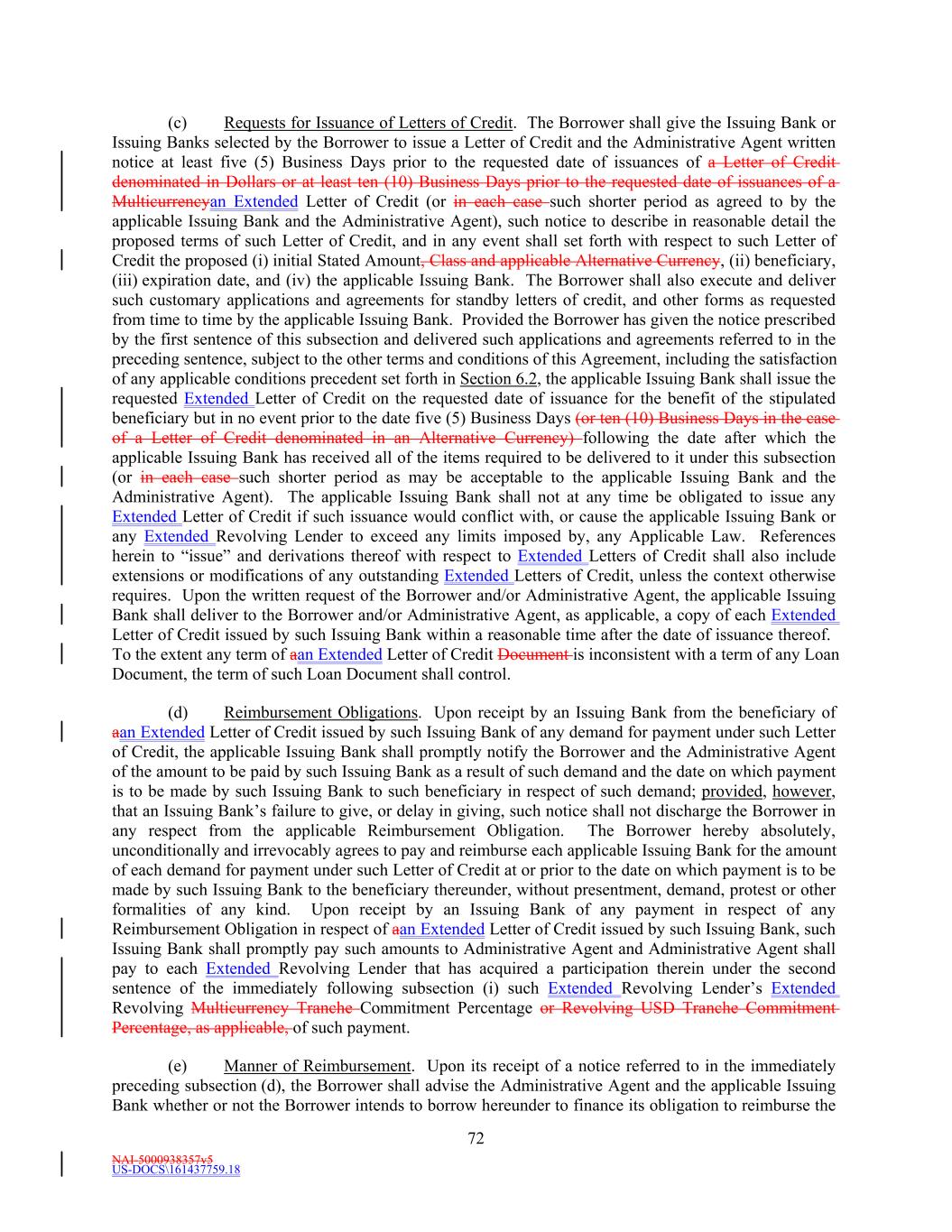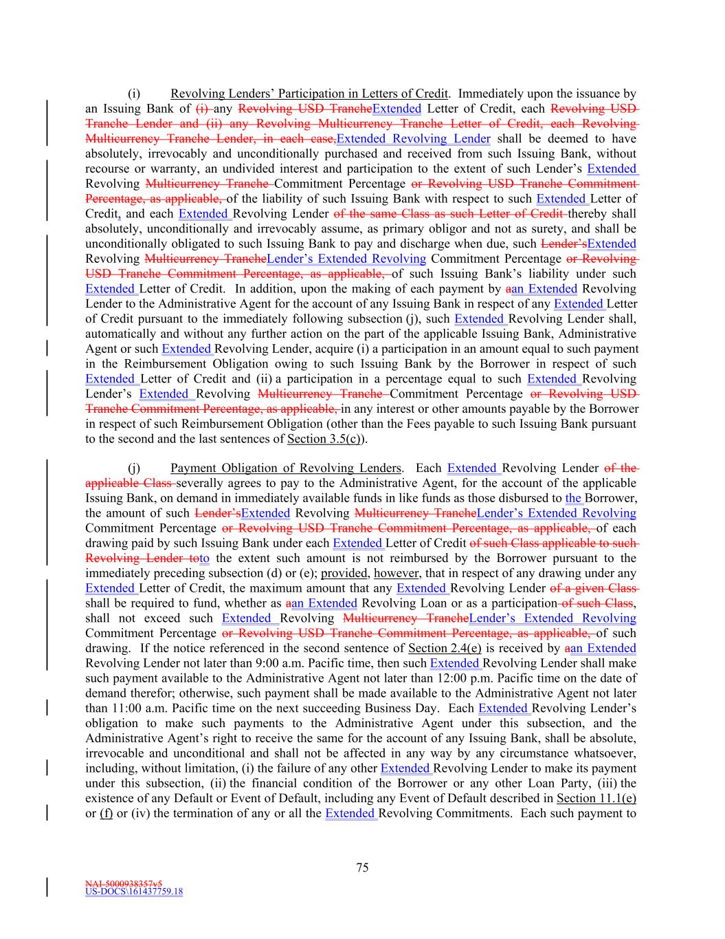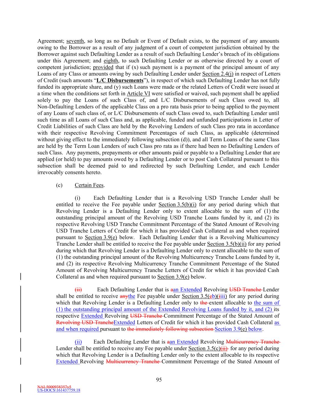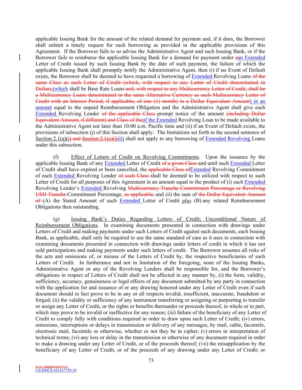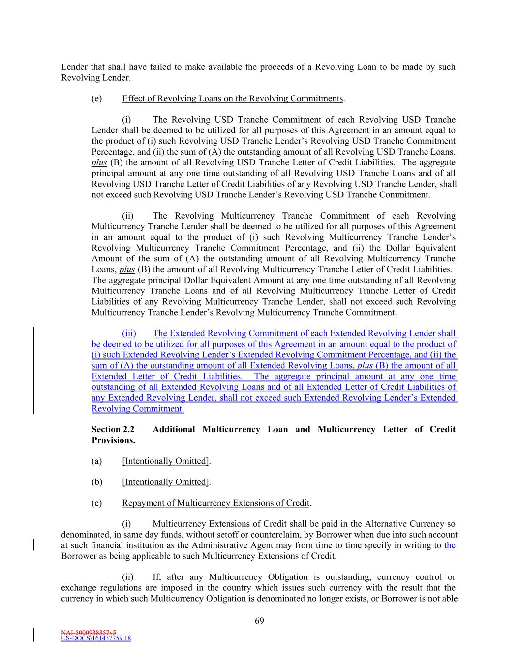 NAI-5000938357v5 US-DOCS\161437759.18 69 Lender that shall have failed to make available the proceeds of a Revolving Loan to be made by such Revolving Lender. (e) Effect of Revolving Loans on the Revolving Commitments. (i) The Revolving USD Tranche Commitment of each Revolving USD Tranche Lender shall be deemed to be utilized for all purposes of this Agreement in an amount equal to the product of (i) such Revolving USD Tranche Lender’s Revolving USD Tranche Commitment Percentage, and (ii) the sum of (A) the outstanding amount of all Revolving USD Tranche Loans, plus (B) the amount of all Revolving USD Tranche Letter of Credit Liabilities. The aggregate principal amount at any one time outstanding of all Revolving USD Tranche Loans and of all Revolving USD Tranche Letter of Credit Liabilities of any Revolving USD Tranche Lender, shall not exceed such Revolving USD Tranche Lender’s Revolving USD Tranche Commitment. (ii) The Revolving Multicurrency Tranche Commitment of each Revolving Multicurrency Tranche Lender shall be deemed to be utilized for all purposes of this Agreement in an amount equal to the product of (i) such Revolving Multicurrency Tranche Lender’s Revolving Multicurrency Tranche Commitment Percentage, and (ii) the Dollar Equivalent Amount of the sum of (A) the outstanding amount of all Revolving Multicurrency Tranche Loans, plus (B) the amount of all Revolving Multicurrency Tranche Letter of Credit Liabilities. The aggregate principal Dollar Equivalent Amount at any one time outstanding of all Revolving Multicurrency Tranche Loans and of all Revolving Multicurrency Tranche Letter of Credit Liabilities of any Revolving Multicurrency Tranche Lender, shall not exceed such Revolving Multicurrency Tranche Lender’s Revolving Multicurrency Tranche Commitment. (iii) The Extended Revolving Commitment of each Extended Revolving Lender shall be deemed to be utilized for all purposes of this Agreement in an amount equal to the product of (i) such Extended Revolving Lender’s Extended Revolving Commitment Percentage, and (ii) the sum of (A) the outstanding amount of all Extended Revolving Loans, plus (B) the amount of all Extended Letter of Credit Liabilities. The aggregate principal amount at any one time outstanding of all Extended Revolving Loans and of all Extended Letter of Credit Liabilities of any Extended Revolving Lender, shall not exceed such Extended Revolving Lender’s Extended Revolving Commitment. Section 2.2 Additional Multicurrency Loan and Multicurrency Letter of Credit Provisions. (a) [Intentionally Omitted]. (b) [Intentionally Omitted]. (c) Repayment of Multicurrency Extensions of Credit. (i) Multicurrency Extensions of Credit shall be paid in the Alternative Currency so denominated, in same day funds, without setoff or counterclaim, by Borrower when due into such account at such financial institution as the Administrative Agent may from time to time specify in writing to the Borrower as being applicable to such Multicurrency Extensions of Credit. (ii) If, after any Multicurrency Obligation is outstanding, currency control or exchange regulations are imposed in the country which issues such currency with the result that the currency in which such Multicurrency Obligation is denominated no longer exists, or Borrower is not able