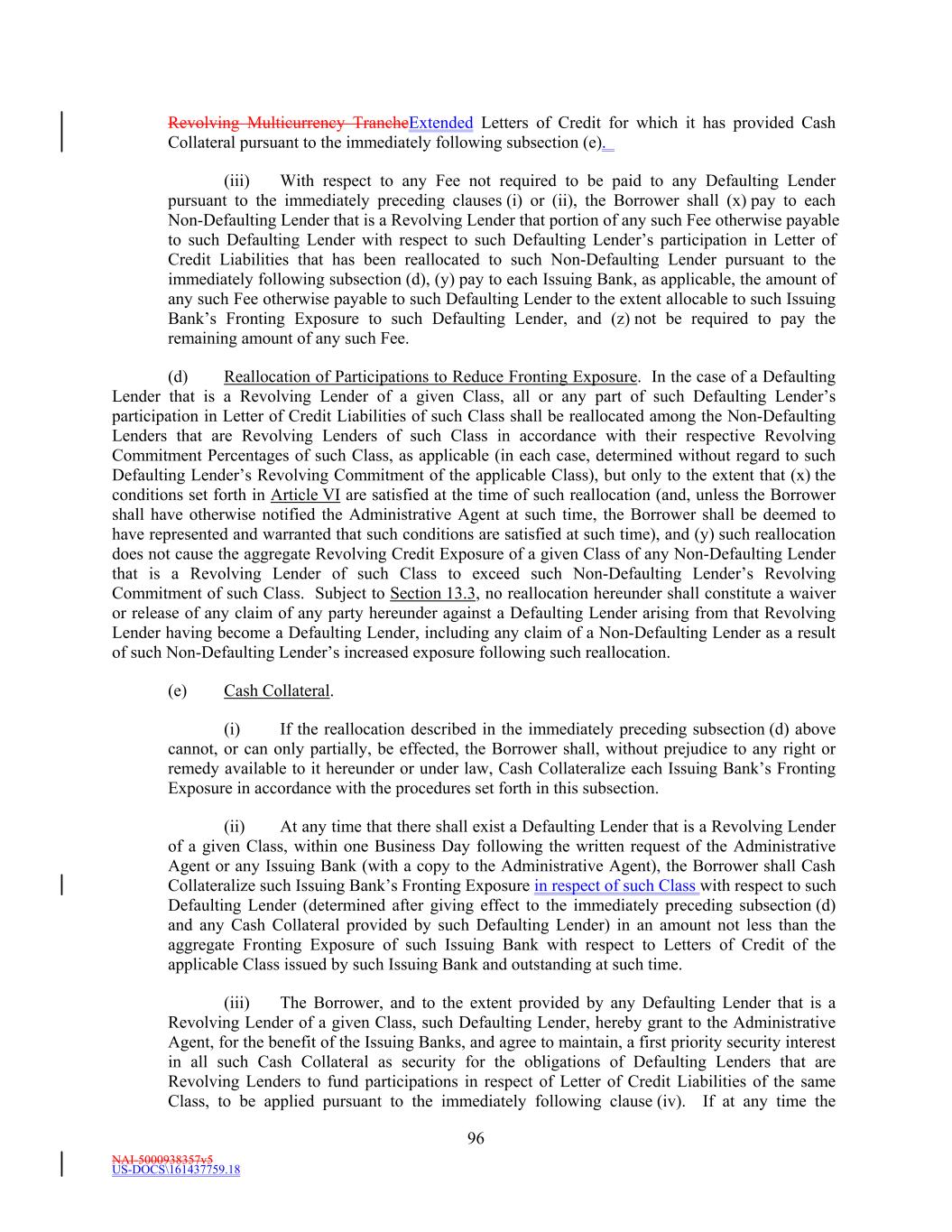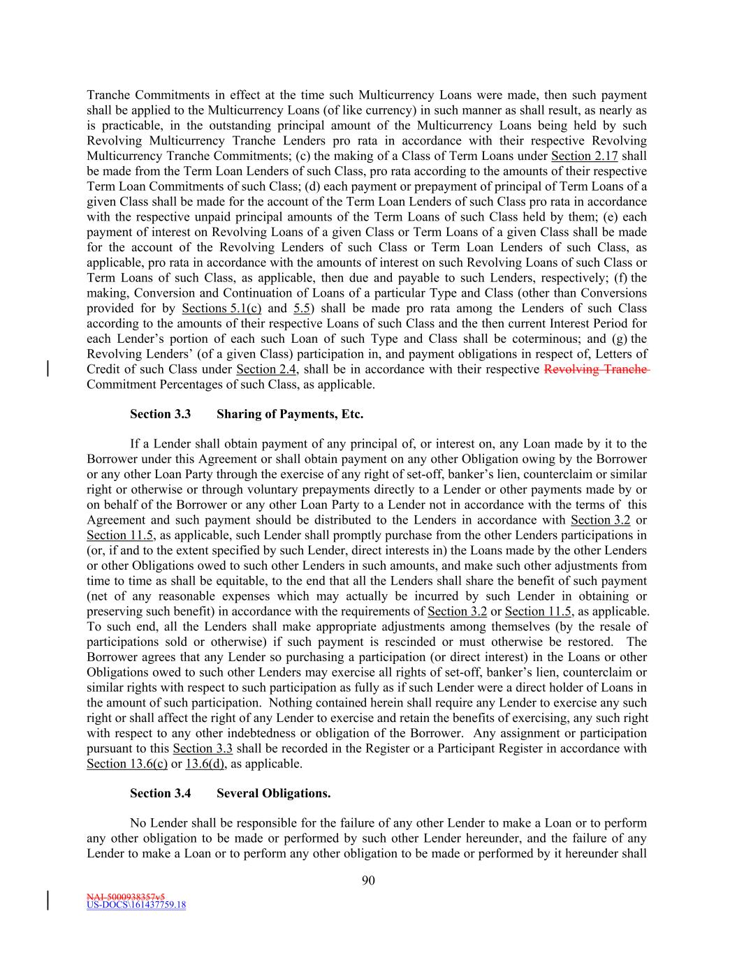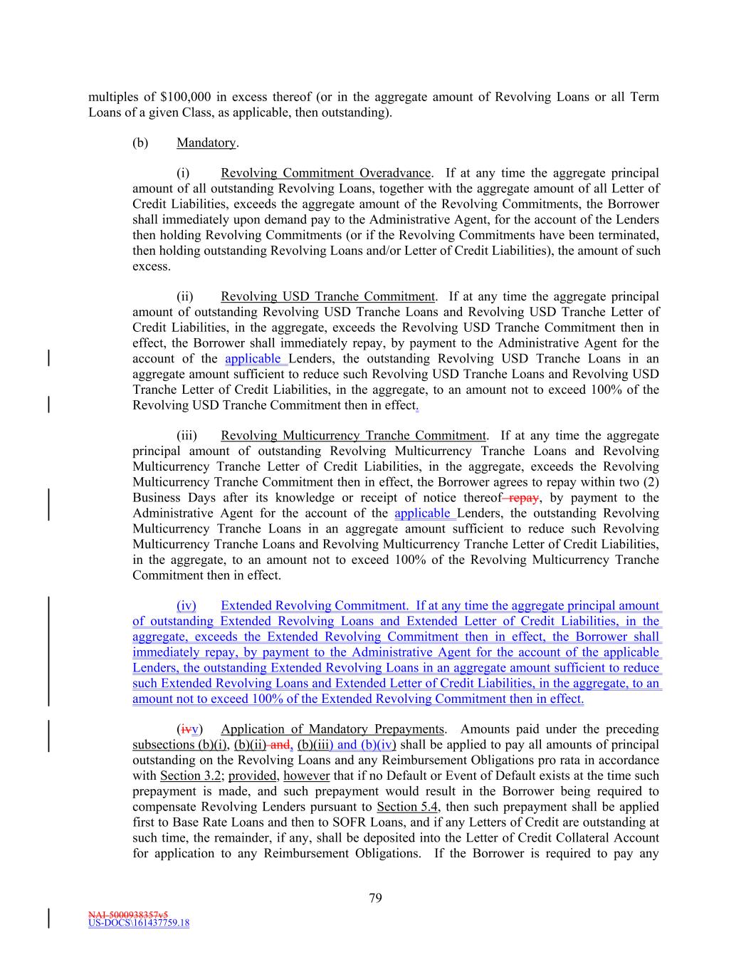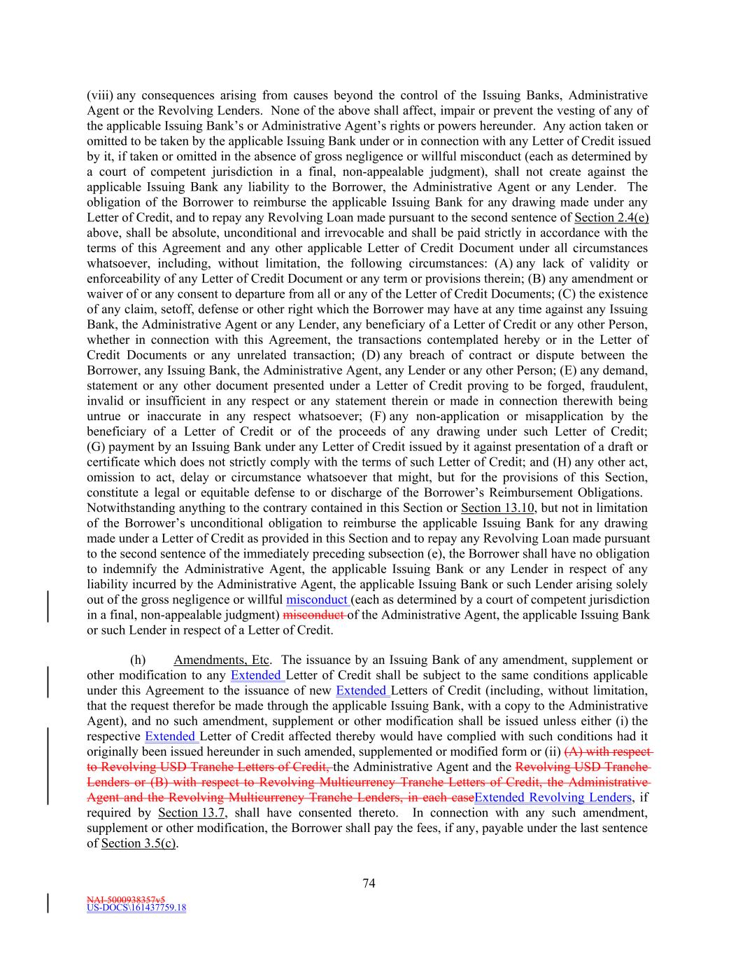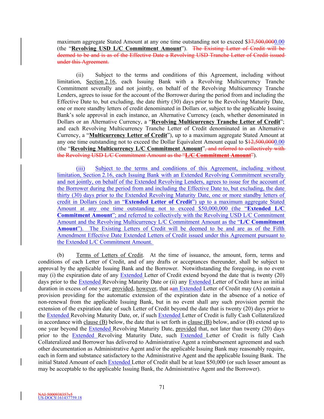 NAI-5000938357v5 US-DOCS\161437759.18 69 Lender that shall have failed to make available the proceeds of a Revolving Loan to be made by such Revolving Lender. (e) Effect of Revolving Loans on the Revolving Commitments. (i) The Revolving USD Tranche Commitment of each Revolving USD Tranche Lender shall be deemed to be utilized for all purposes of this Agreement in an amount equal to the product of (i) such Revolving USD Tranche Lender’s Revolving USD Tranche Commitment Percentage, and (ii) the sum of (A) the outstanding amount of all Revolving USD Tranche Loans, plus (B) the amount of all Revolving USD Tranche Letter of Credit Liabilities. The aggregate principal amount at any one time outstanding of all Revolving USD Tranche Loans and of all Revolving USD Tranche Letter of Credit Liabilities of any Revolving USD Tranche Lender, shall not exceed such Revolving USD Tranche Lender’s Revolving USD Tranche Commitment. (ii) The Revolving Multicurrency Tranche Commitment of each Revolving Multicurrency Tranche Lender shall be deemed to be utilized for all purposes of this Agreement in an amount equal to the product of (i) such Revolving Multicurrency Tranche Lender’s Revolving Multicurrency Tranche Commitment Percentage, and (ii) the Dollar Equivalent Amount of the sum of (A) the outstanding amount of all Revolving Multicurrency Tranche Loans, plus (B) the amount of all Revolving Multicurrency Tranche Letter of Credit Liabilities. The aggregate principal Dollar Equivalent Amount at any one time outstanding of all Revolving Multicurrency Tranche Loans and of all Revolving Multicurrency Tranche Letter of Credit Liabilities of any Revolving Multicurrency Tranche Lender, shall not exceed such Revolving Multicurrency Tranche Lender’s Revolving Multicurrency Tranche Commitment. (iii) The Extended Revolving Commitment of each Extended Revolving Lender shall be deemed to be utilized for all purposes of this Agreement in an amount equal to the product of (i) such Extended Revolving Lender’s Extended Revolving Commitment Percentage, and (ii) the sum of (A) the outstanding amount of all Extended Revolving Loans, plus (B) the amount of all Extended Letter of Credit Liabilities. The aggregate principal amount at any one time outstanding of all Extended Revolving Loans and of all Extended Letter of Credit Liabilities of any Extended Revolving Lender, shall not exceed such Extended Revolving Lender’s Extended Revolving Commitment. Section 2.2 Additional Multicurrency Loan and Multicurrency Letter of Credit Provisions. (a) [Intentionally Omitted]. (b) [Intentionally Omitted]. (c) Repayment of Multicurrency Extensions of Credit. (i) Multicurrency Extensions of Credit shall be paid in the Alternative Currency so denominated, in same day funds, without setoff or counterclaim, by Borrower when due into such account at such financial institution as the Administrative Agent may from time to time specify in writing to the Borrower as being applicable to such Multicurrency Extensions of Credit. (ii) If, after any Multicurrency Obligation is outstanding, currency control or exchange regulations are imposed in the country which issues such currency with the result that the currency in which such Multicurrency Obligation is denominated no longer exists, or Borrower is not able