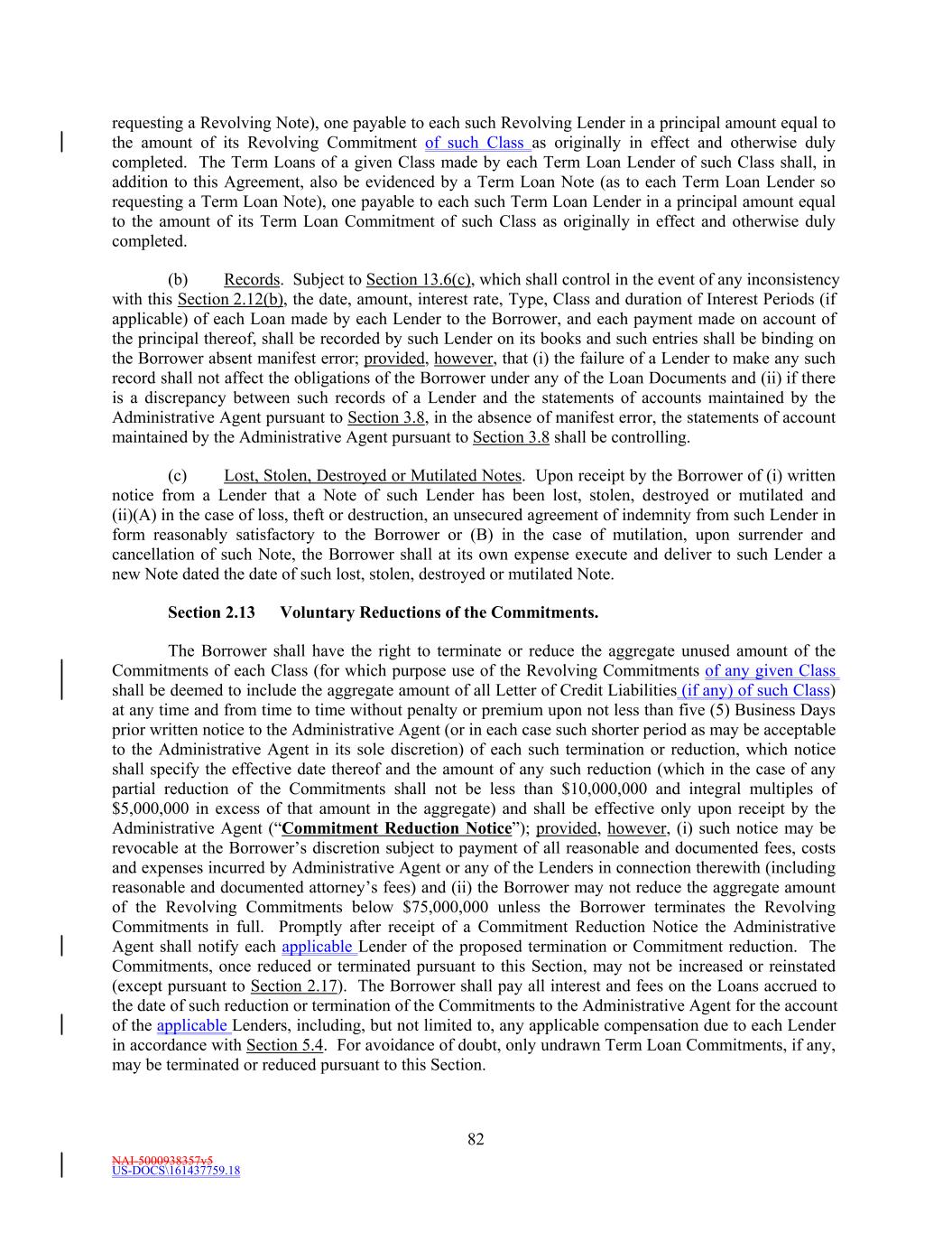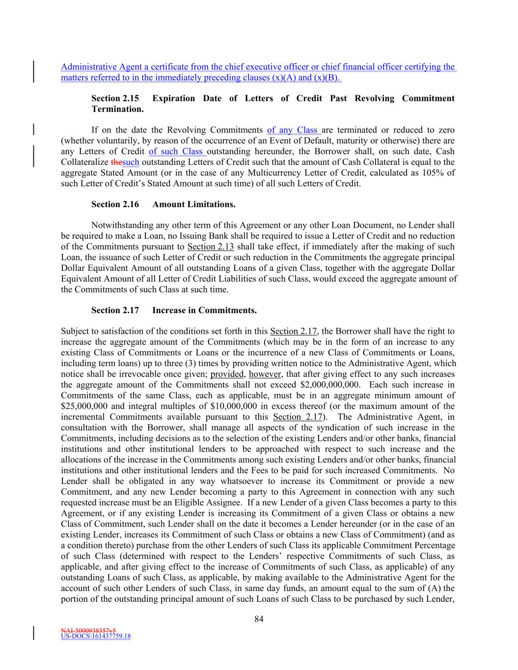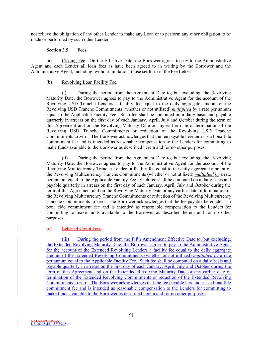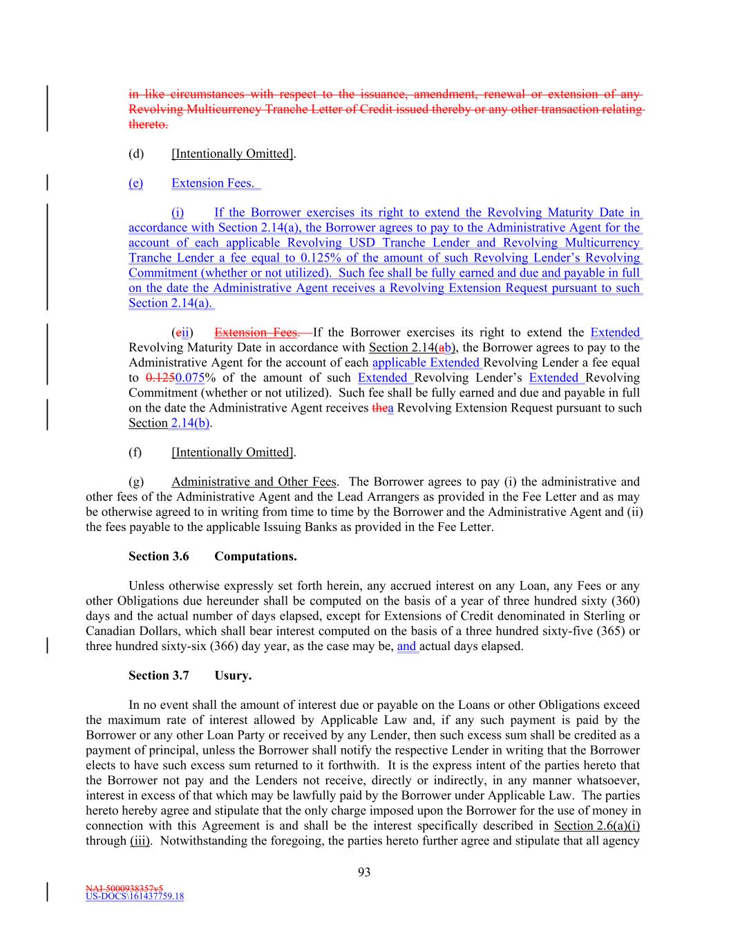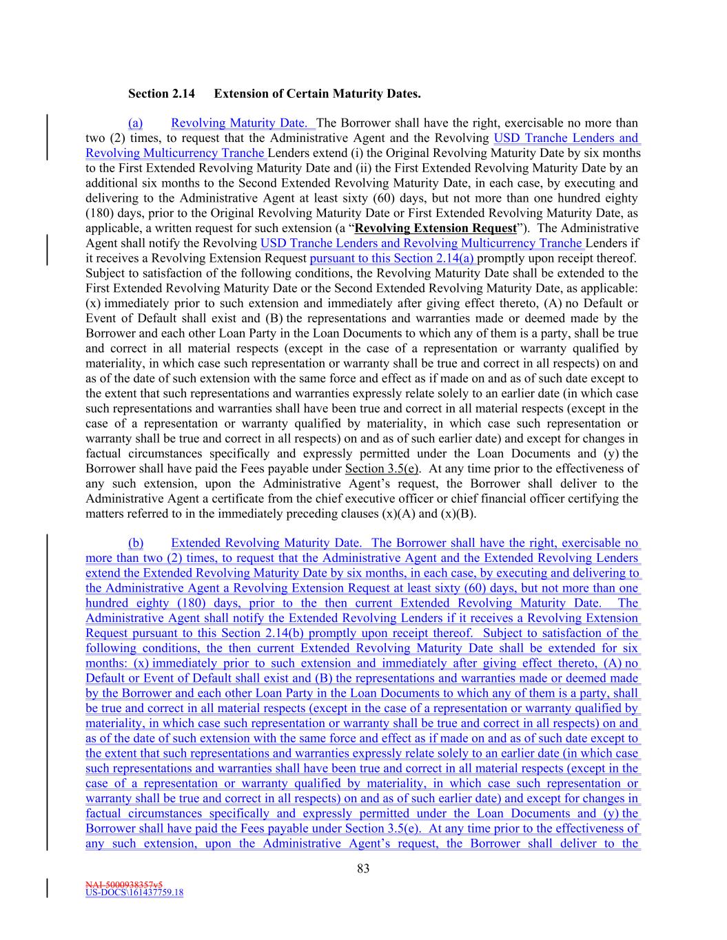 NAI-5000938357v5 US-DOCS\161437759.18 69 Lender that shall have failed to make available the proceeds of a Revolving Loan to be made by such Revolving Lender. (e) Effect of Revolving Loans on the Revolving Commitments. (i) The Revolving USD Tranche Commitment of each Revolving USD Tranche Lender shall be deemed to be utilized for all purposes of this Agreement in an amount equal to the product of (i) such Revolving USD Tranche Lender’s Revolving USD Tranche Commitment Percentage, and (ii) the sum of (A) the outstanding amount of all Revolving USD Tranche Loans, plus (B) the amount of all Revolving USD Tranche Letter of Credit Liabilities. The aggregate principal amount at any one time outstanding of all Revolving USD Tranche Loans and of all Revolving USD Tranche Letter of Credit Liabilities of any Revolving USD Tranche Lender, shall not exceed such Revolving USD Tranche Lender’s Revolving USD Tranche Commitment. (ii) The Revolving Multicurrency Tranche Commitment of each Revolving Multicurrency Tranche Lender shall be deemed to be utilized for all purposes of this Agreement in an amount equal to the product of (i) such Revolving Multicurrency Tranche Lender’s Revolving Multicurrency Tranche Commitment Percentage, and (ii) the Dollar Equivalent Amount of the sum of (A) the outstanding amount of all Revolving Multicurrency Tranche Loans, plus (B) the amount of all Revolving Multicurrency Tranche Letter of Credit Liabilities. The aggregate principal Dollar Equivalent Amount at any one time outstanding of all Revolving Multicurrency Tranche Loans and of all Revolving Multicurrency Tranche Letter of Credit Liabilities of any Revolving Multicurrency Tranche Lender, shall not exceed such Revolving Multicurrency Tranche Lender’s Revolving Multicurrency Tranche Commitment. (iii) The Extended Revolving Commitment of each Extended Revolving Lender shall be deemed to be utilized for all purposes of this Agreement in an amount equal to the product of (i) such Extended Revolving Lender’s Extended Revolving Commitment Percentage, and (ii) the sum of (A) the outstanding amount of all Extended Revolving Loans, plus (B) the amount of all Extended Letter of Credit Liabilities. The aggregate principal amount at any one time outstanding of all Extended Revolving Loans and of all Extended Letter of Credit Liabilities of any Extended Revolving Lender, shall not exceed such Extended Revolving Lender’s Extended Revolving Commitment. Section 2.2 Additional Multicurrency Loan and Multicurrency Letter of Credit Provisions. (a) [Intentionally Omitted]. (b) [Intentionally Omitted]. (c) Repayment of Multicurrency Extensions of Credit. (i) Multicurrency Extensions of Credit shall be paid in the Alternative Currency so denominated, in same day funds, without setoff or counterclaim, by Borrower when due into such account at such financial institution as the Administrative Agent may from time to time specify in writing to the Borrower as being applicable to such Multicurrency Extensions of Credit. (ii) If, after any Multicurrency Obligation is outstanding, currency control or exchange regulations are imposed in the country which issues such currency with the result that the currency in which such Multicurrency Obligation is denominated no longer exists, or Borrower is not able