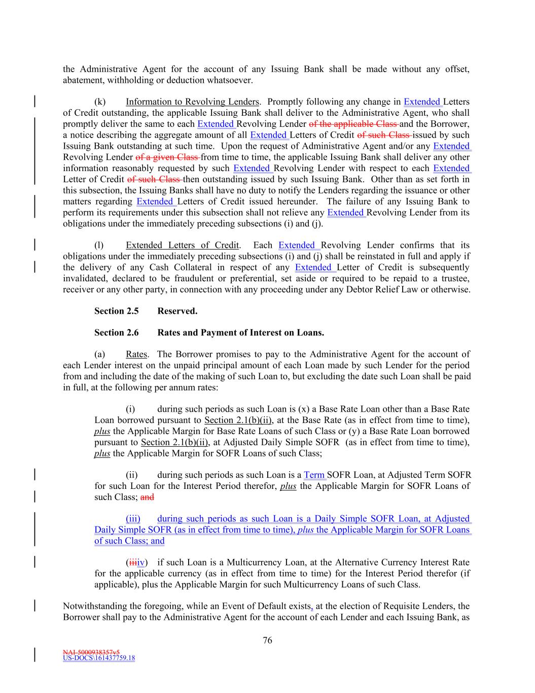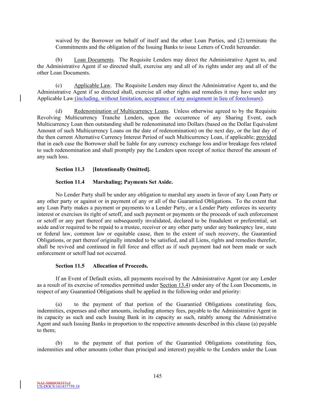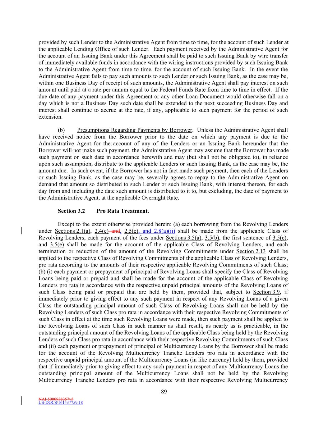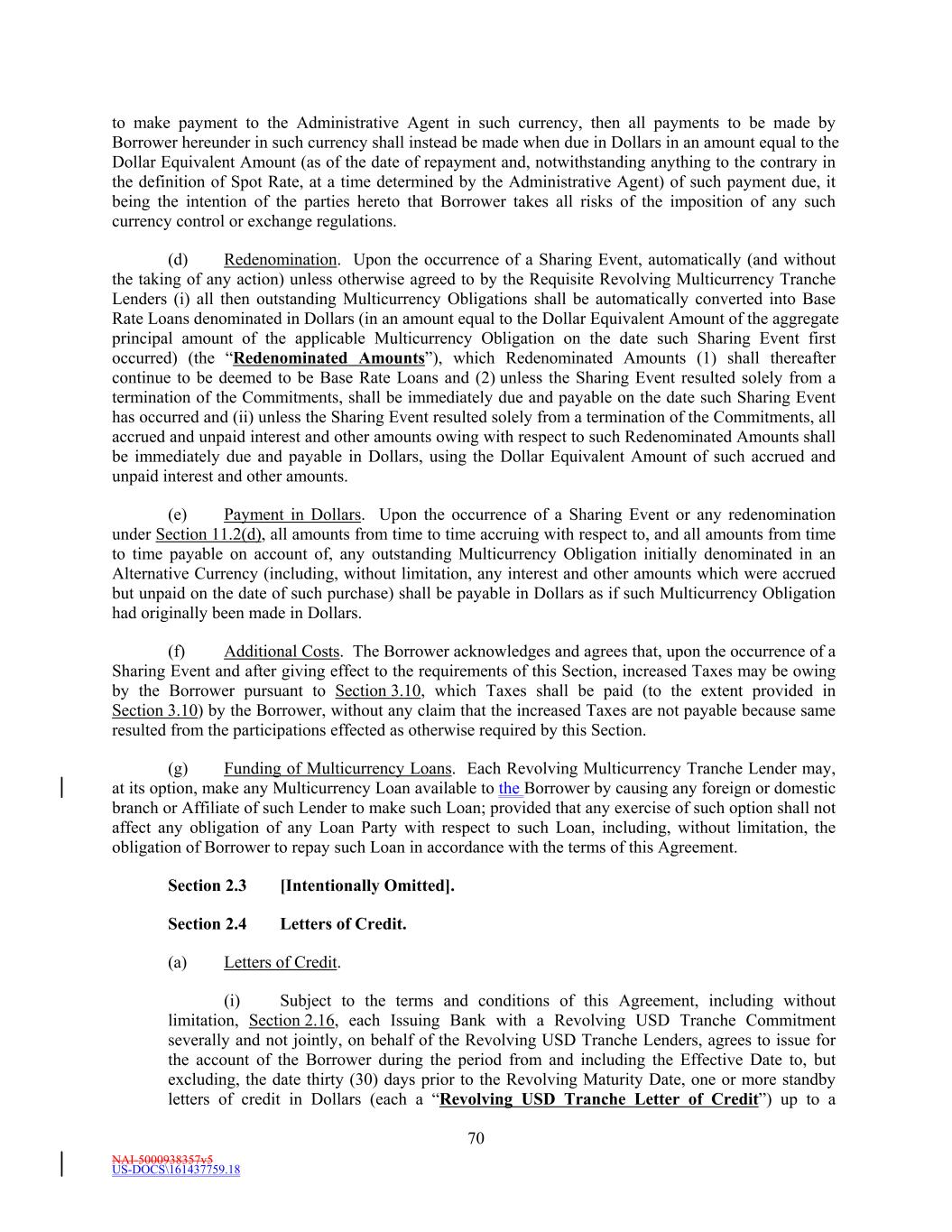 NAI-5000938357v5 US-DOCS\161437759.18 70 to make payment to the Administrative Agent in such currency, then all payments to be made by Borrower hereunder in such currency shall instead be made when due in Dollars in an amount equal to the Dollar Equivalent Amount (as of the date of repayment and, notwithstanding anything to the contrary in the definition of Spot Rate, at a time determined by the Administrative Agent) of such payment due, it being the intention of the parties hereto that Borrower takes all risks of the imposition of any such currency control or exchange regulations. (d) Redenomination. Upon the occurrence of a Sharing Event, automatically (and without the taking of any action) unless otherwise agreed to by the Requisite Revolving Multicurrency Tranche Lenders (i) all then outstanding Multicurrency Obligations shall be automatically converted into Base Rate Loans denominated in Dollars (in an amount equal to the Dollar Equivalent Amount of the aggregate principal amount of the applicable Multicurrency Obligation on the date such Sharing Event first occurred) (the “Redenominated Amounts”), which Redenominated Amounts (1) shall thereafter continue to be deemed to be Base Rate Loans and (2) unless the Sharing Event resulted solely from a termination of the Commitments, shall be immediately due and payable on the date such Sharing Event has occurred and (ii) unless the Sharing Event resulted solely from a termination of the Commitments, all accrued and unpaid interest and other amounts owing with respect to such Redenominated Amounts shall be immediately due and payable in Dollars, using the Dollar Equivalent Amount of such accrued and unpaid interest and other amounts. (e) Payment in Dollars. Upon the occurrence of a Sharing Event or any redenomination under Section 11.2(d), all amounts from time to time accruing with respect to, and all amounts from time to time payable on account of, any outstanding Multicurrency Obligation initially denominated in an Alternative Currency (including, without limitation, any interest and other amounts which were accrued but unpaid on the date of such purchase) shall be payable in Dollars as if such Multicurrency Obligation had originally been made in Dollars. (f) Additional Costs. The Borrower acknowledges and agrees that, upon the occurrence of a Sharing Event and after giving effect to the requirements of this Section, increased Taxes may be owing by the Borrower pursuant to Section 3.10, which Taxes shall be paid (to the extent provided in Section 3.10) by the Borrower, without any claim that the increased Taxes are not payable because same resulted from the participations effected as otherwise required by this Section. (g) Funding of Multicurrency Loans. Each Revolving Multicurrency Tranche Lender may, at its option, make any Multicurrency Loan available to the Borrower by causing any foreign or domestic branch or Affiliate of such Lender to make such Loan; provided that any exercise of such option shall not affect any obligation of any Loan Party with respect to such Loan, including, without limitation, the obligation of Borrower to repay such Loan in accordance with the terms of this Agreement. Section 2.3 [Intentionally Omitted]. Section 2.4 Letters of Credit. (a) Letters of Credit. (i) Subject to the terms and conditions of this Agreement, including without limitation, Section 2.16, each Issuing Bank with a Revolving USD Tranche Commitment severally and not jointly, on behalf of the Revolving USD Tranche Lenders, agrees to issue for the account of the Borrower during the period from and including the Effective Date to, but excluding, the date thirty (30) days prior to the Revolving Maturity Date, one or more standby letters of credit in Dollars (each a “Revolving USD Tranche Letter of Credit”) up to a
