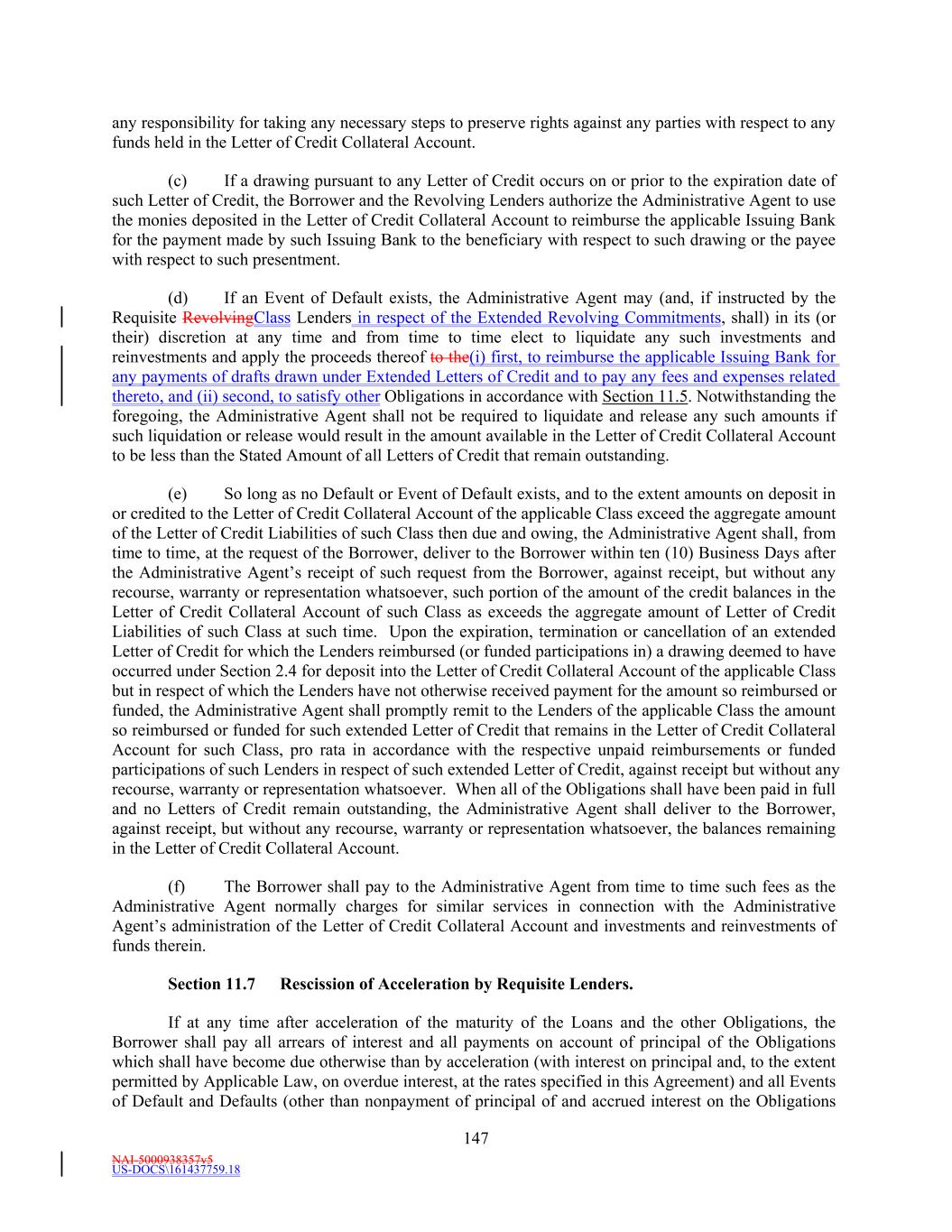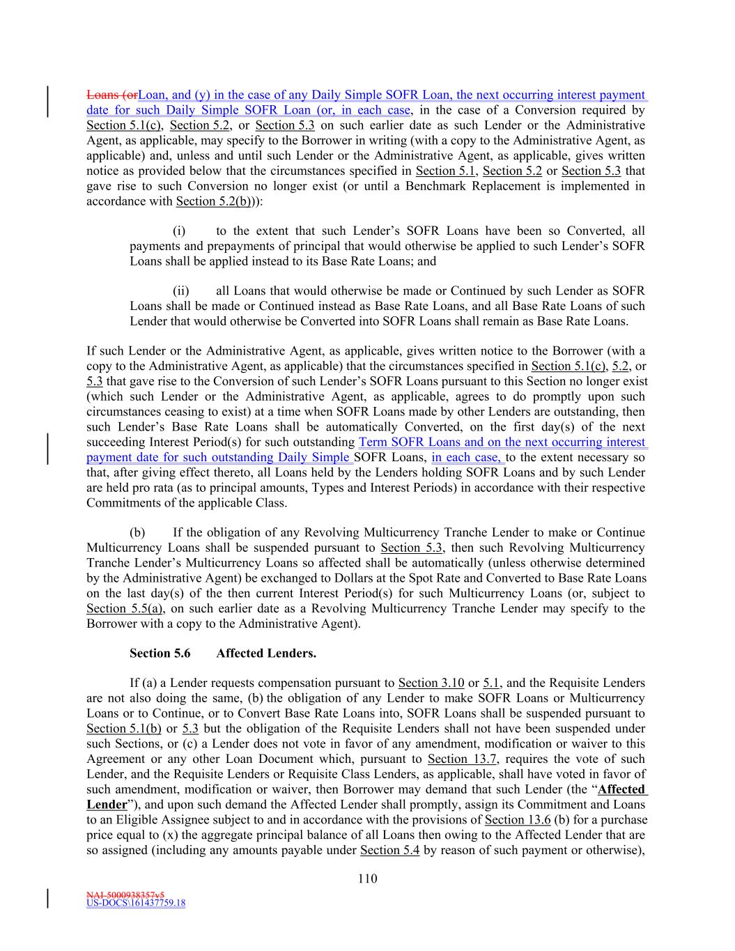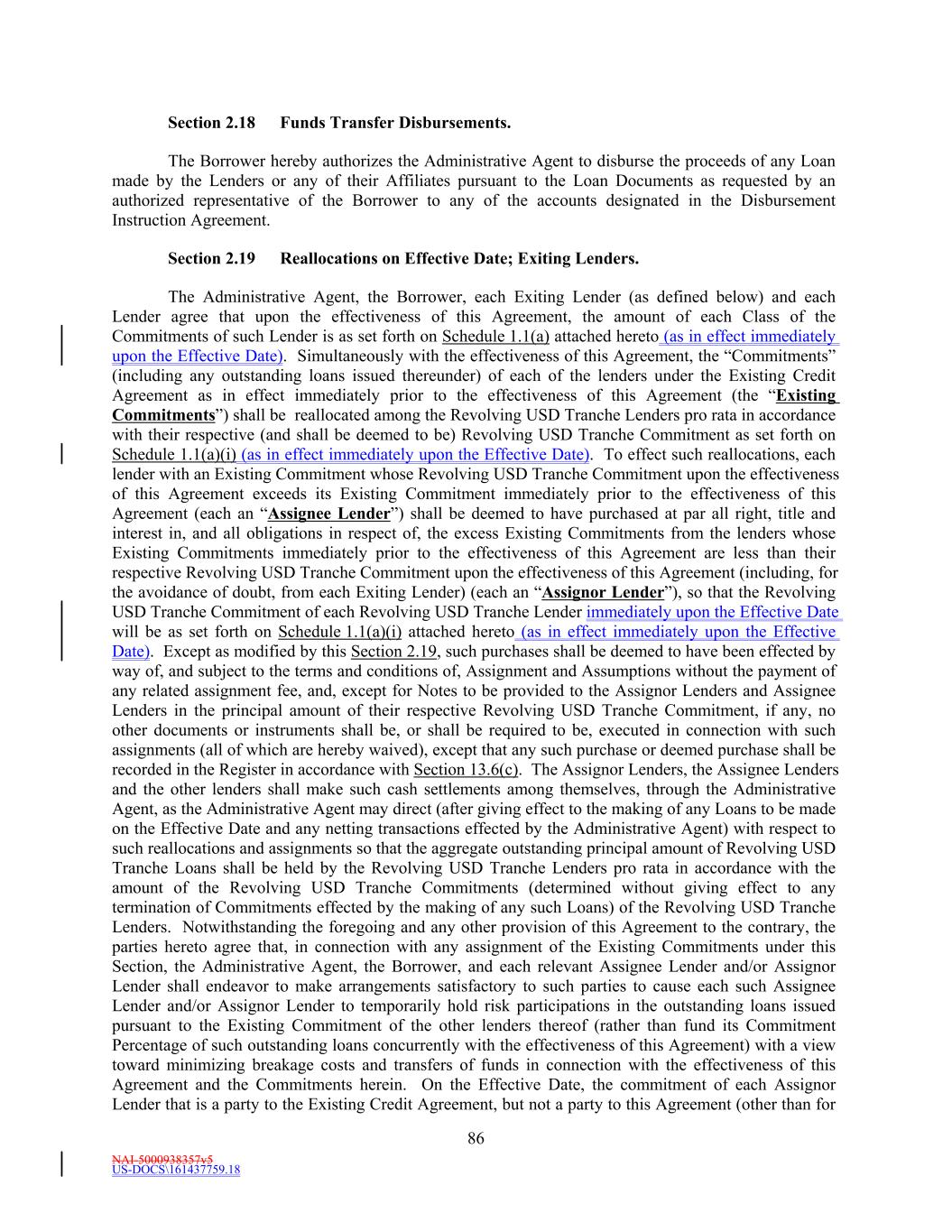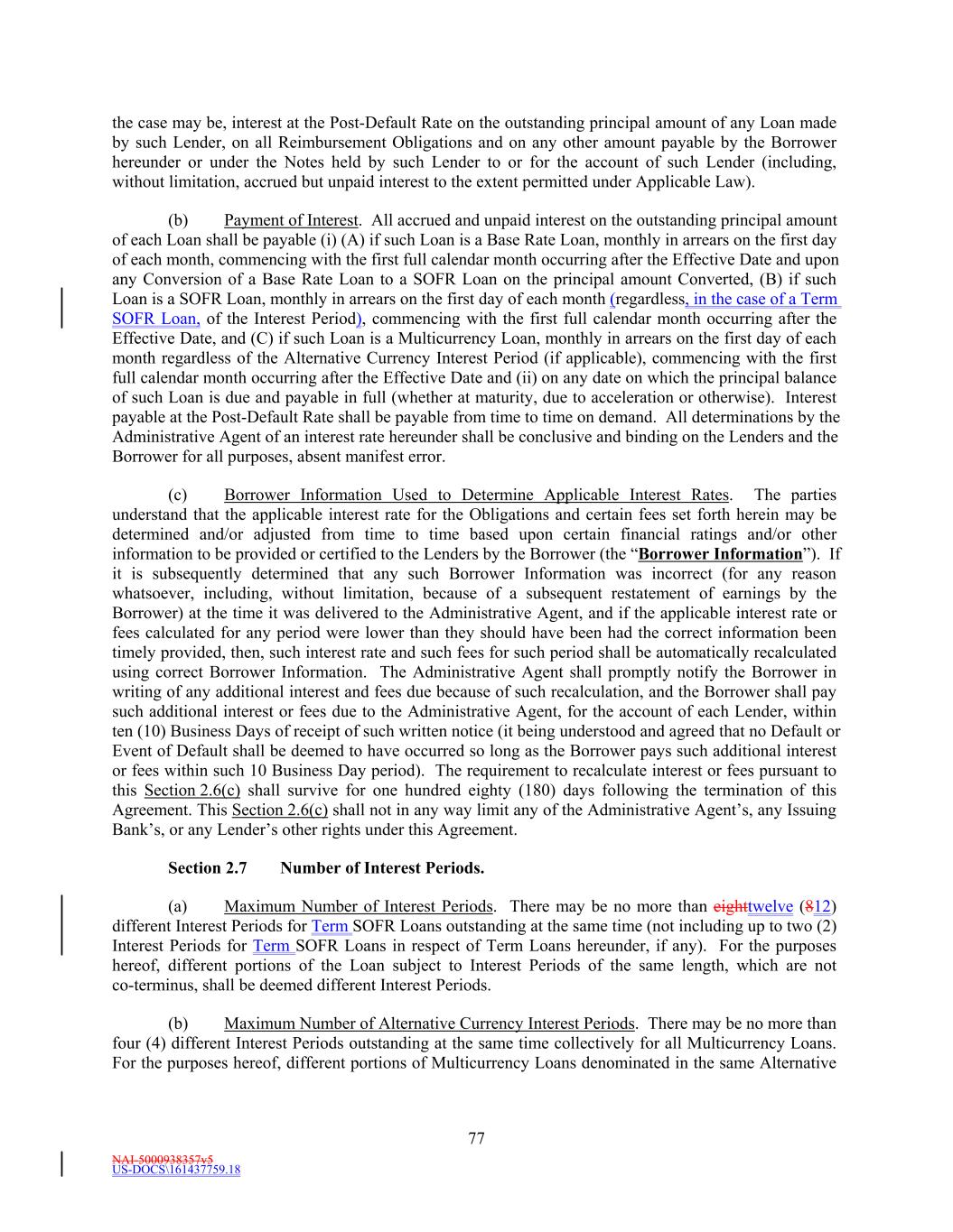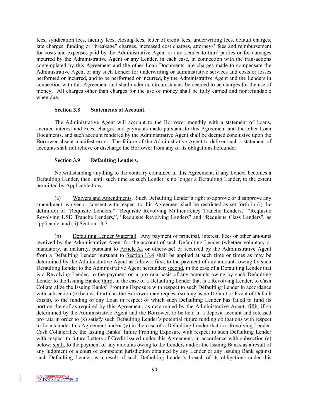 NAI-5000938357v5 US-DOCS\161437759.18 70 to make payment to the Administrative Agent in such currency, then all payments to be made by Borrower hereunder in such currency shall instead be made when due in Dollars in an amount equal to the Dollar Equivalent Amount (as of the date of repayment and, notwithstanding anything to the contrary in the definition of Spot Rate, at a time determined by the Administrative Agent) of such payment due, it being the intention of the parties hereto that Borrower takes all risks of the imposition of any such currency control or exchange regulations. (d) Redenomination. Upon the occurrence of a Sharing Event, automatically (and without the taking of any action) unless otherwise agreed to by the Requisite Revolving Multicurrency Tranche Lenders (i) all then outstanding Multicurrency Obligations shall be automatically converted into Base Rate Loans denominated in Dollars (in an amount equal to the Dollar Equivalent Amount of the aggregate principal amount of the applicable Multicurrency Obligation on the date such Sharing Event first occurred) (the “Redenominated Amounts”), which Redenominated Amounts (1) shall thereafter continue to be deemed to be Base Rate Loans and (2) unless the Sharing Event resulted solely from a termination of the Commitments, shall be immediately due and payable on the date such Sharing Event has occurred and (ii) unless the Sharing Event resulted solely from a termination of the Commitments, all accrued and unpaid interest and other amounts owing with respect to such Redenominated Amounts shall be immediately due and payable in Dollars, using the Dollar Equivalent Amount of such accrued and unpaid interest and other amounts. (e) Payment in Dollars. Upon the occurrence of a Sharing Event or any redenomination under Section 11.2(d), all amounts from time to time accruing with respect to, and all amounts from time to time payable on account of, any outstanding Multicurrency Obligation initially denominated in an Alternative Currency (including, without limitation, any interest and other amounts which were accrued but unpaid on the date of such purchase) shall be payable in Dollars as if such Multicurrency Obligation had originally been made in Dollars. (f) Additional Costs. The Borrower acknowledges and agrees that, upon the occurrence of a Sharing Event and after giving effect to the requirements of this Section, increased Taxes may be owing by the Borrower pursuant to Section 3.10, which Taxes shall be paid (to the extent provided in Section 3.10) by the Borrower, without any claim that the increased Taxes are not payable because same resulted from the participations effected as otherwise required by this Section. (g) Funding of Multicurrency Loans. Each Revolving Multicurrency Tranche Lender may, at its option, make any Multicurrency Loan available to the Borrower by causing any foreign or domestic branch or Affiliate of such Lender to make such Loan; provided that any exercise of such option shall not affect any obligation of any Loan Party with respect to such Loan, including, without limitation, the obligation of Borrower to repay such Loan in accordance with the terms of this Agreement. Section 2.3 [Intentionally Omitted]. Section 2.4 Letters of Credit. (a) Letters of Credit. (i) Subject to the terms and conditions of this Agreement, including without limitation, Section 2.16, each Issuing Bank with a Revolving USD Tranche Commitment severally and not jointly, on behalf of the Revolving USD Tranche Lenders, agrees to issue for the account of the Borrower during the period from and including the Effective Date to, but excluding, the date thirty (30) days prior to the Revolving Maturity Date, one or more standby letters of credit in Dollars (each a “Revolving USD Tranche Letter of Credit”) up to a