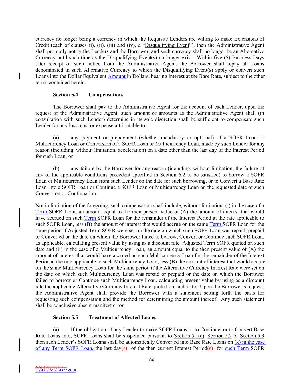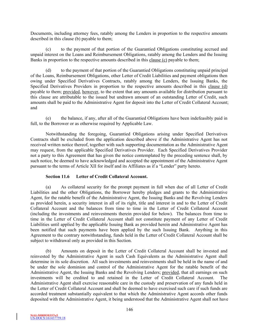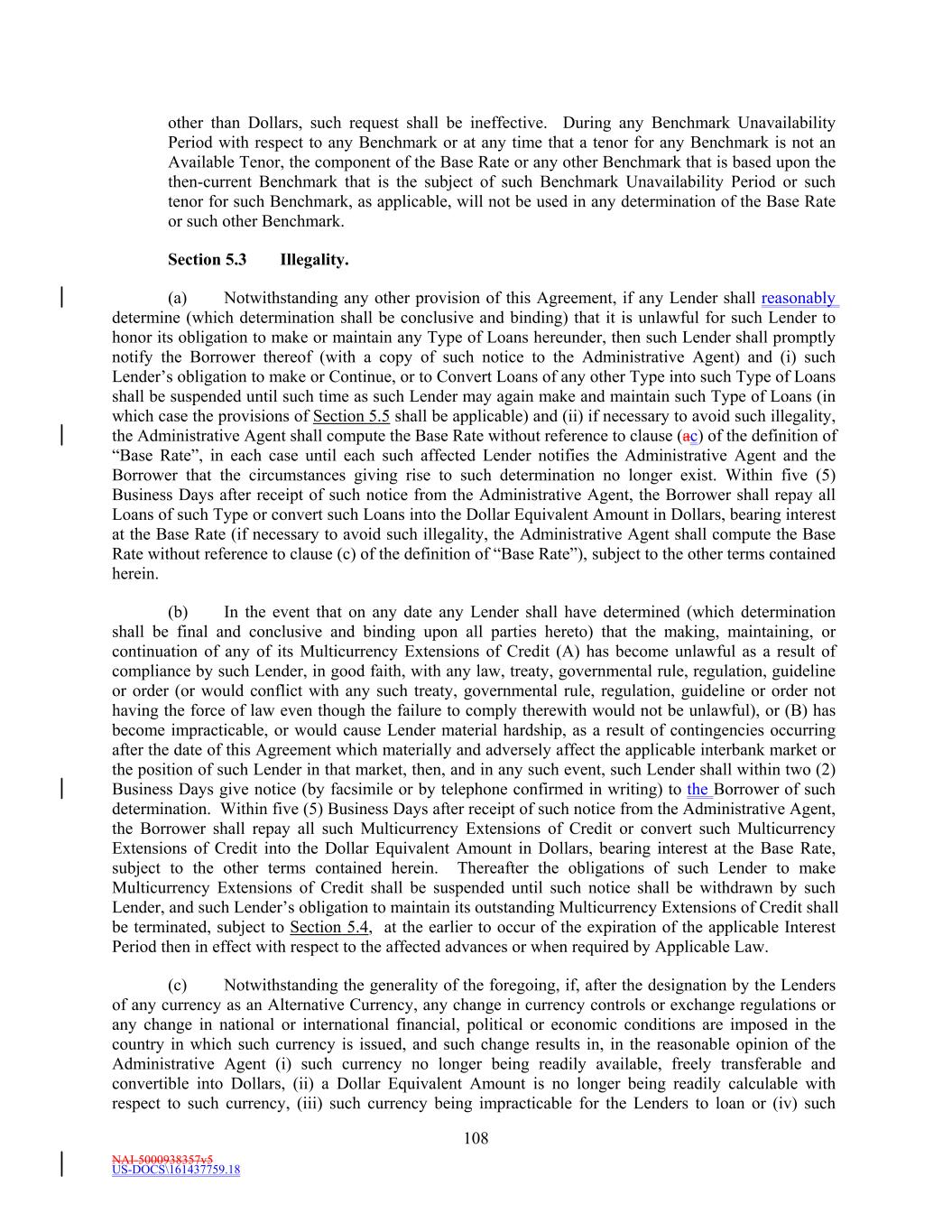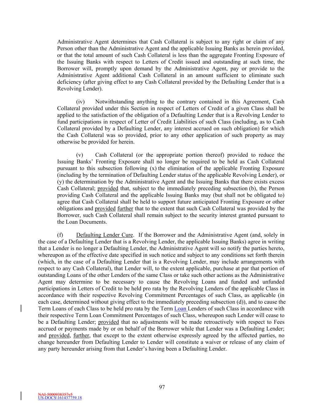 NAI-5000938357v5 US-DOCS\161437759.18 70 to make payment to the Administrative Agent in such currency, then all payments to be made by Borrower hereunder in such currency shall instead be made when due in Dollars in an amount equal to the Dollar Equivalent Amount (as of the date of repayment and, notwithstanding anything to the contrary in the definition of Spot Rate, at a time determined by the Administrative Agent) of such payment due, it being the intention of the parties hereto that Borrower takes all risks of the imposition of any such currency control or exchange regulations. (d) Redenomination. Upon the occurrence of a Sharing Event, automatically (and without the taking of any action) unless otherwise agreed to by the Requisite Revolving Multicurrency Tranche Lenders (i) all then outstanding Multicurrency Obligations shall be automatically converted into Base Rate Loans denominated in Dollars (in an amount equal to the Dollar Equivalent Amount of the aggregate principal amount of the applicable Multicurrency Obligation on the date such Sharing Event first occurred) (the “Redenominated Amounts”), which Redenominated Amounts (1) shall thereafter continue to be deemed to be Base Rate Loans and (2) unless the Sharing Event resulted solely from a termination of the Commitments, shall be immediately due and payable on the date such Sharing Event has occurred and (ii) unless the Sharing Event resulted solely from a termination of the Commitments, all accrued and unpaid interest and other amounts owing with respect to such Redenominated Amounts shall be immediately due and payable in Dollars, using the Dollar Equivalent Amount of such accrued and unpaid interest and other amounts. (e) Payment in Dollars. Upon the occurrence of a Sharing Event or any redenomination under Section 11.2(d), all amounts from time to time accruing with respect to, and all amounts from time to time payable on account of, any outstanding Multicurrency Obligation initially denominated in an Alternative Currency (including, without limitation, any interest and other amounts which were accrued but unpaid on the date of such purchase) shall be payable in Dollars as if such Multicurrency Obligation had originally been made in Dollars. (f) Additional Costs. The Borrower acknowledges and agrees that, upon the occurrence of a Sharing Event and after giving effect to the requirements of this Section, increased Taxes may be owing by the Borrower pursuant to Section 3.10, which Taxes shall be paid (to the extent provided in Section 3.10) by the Borrower, without any claim that the increased Taxes are not payable because same resulted from the participations effected as otherwise required by this Section. (g) Funding of Multicurrency Loans. Each Revolving Multicurrency Tranche Lender may, at its option, make any Multicurrency Loan available to the Borrower by causing any foreign or domestic branch or Affiliate of such Lender to make such Loan; provided that any exercise of such option shall not affect any obligation of any Loan Party with respect to such Loan, including, without limitation, the obligation of Borrower to repay such Loan in accordance with the terms of this Agreement. Section 2.3 [Intentionally Omitted]. Section 2.4 Letters of Credit. (a) Letters of Credit. (i) Subject to the terms and conditions of this Agreement, including without limitation, Section 2.16, each Issuing Bank with a Revolving USD Tranche Commitment severally and not jointly, on behalf of the Revolving USD Tranche Lenders, agrees to issue for the account of the Borrower during the period from and including the Effective Date to, but excluding, the date thirty (30) days prior to the Revolving Maturity Date, one or more standby letters of credit in Dollars (each a “Revolving USD Tranche Letter of Credit”) up to a