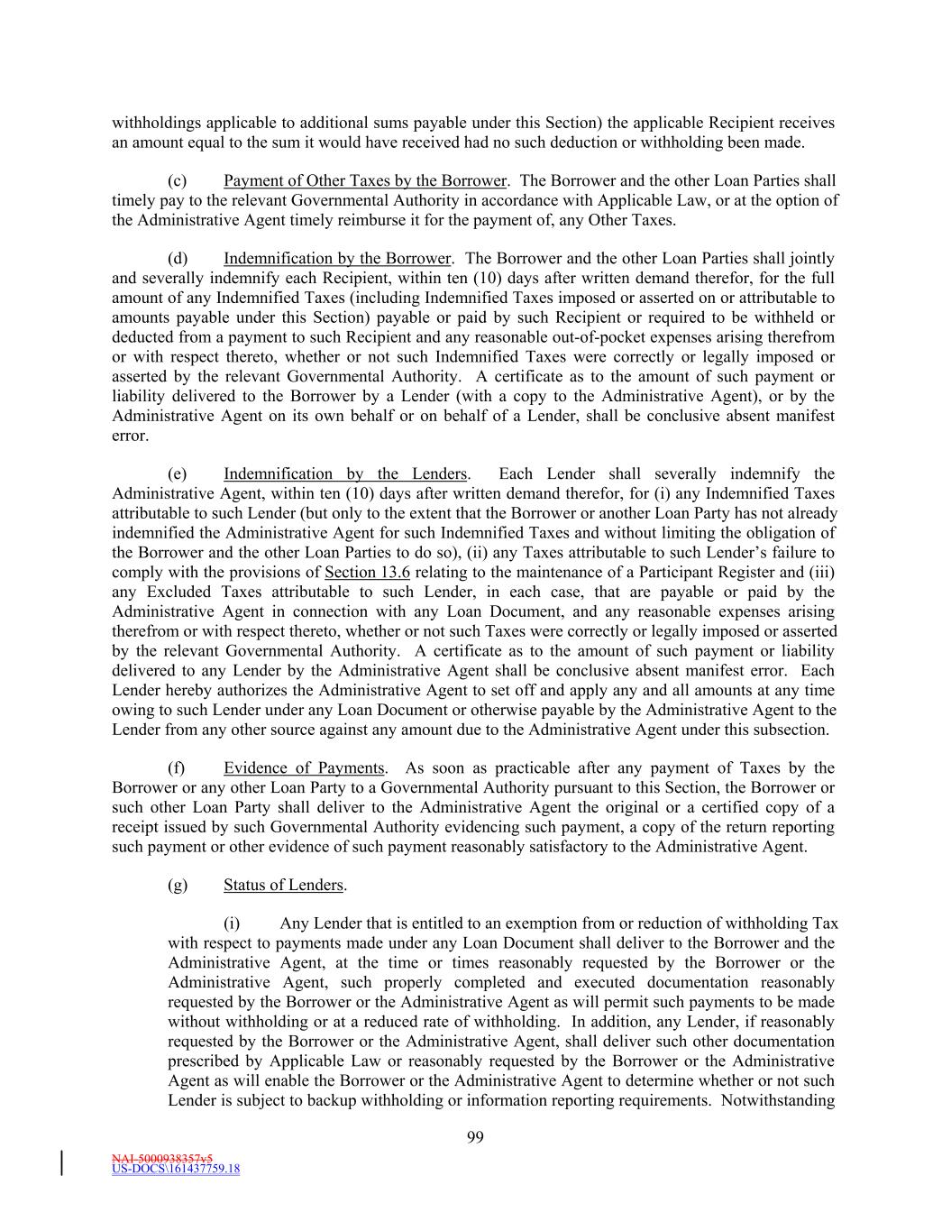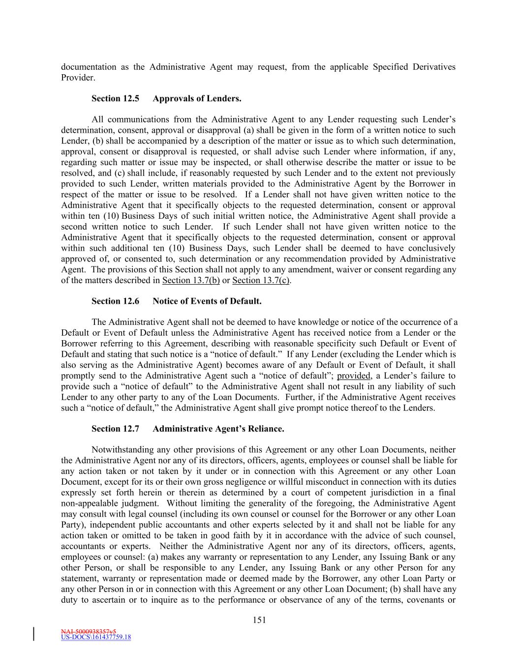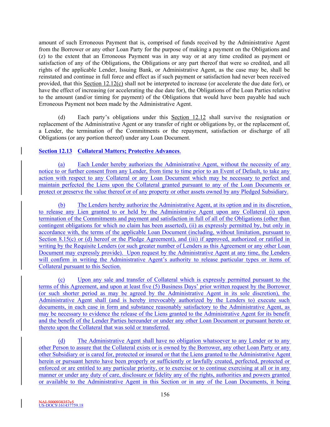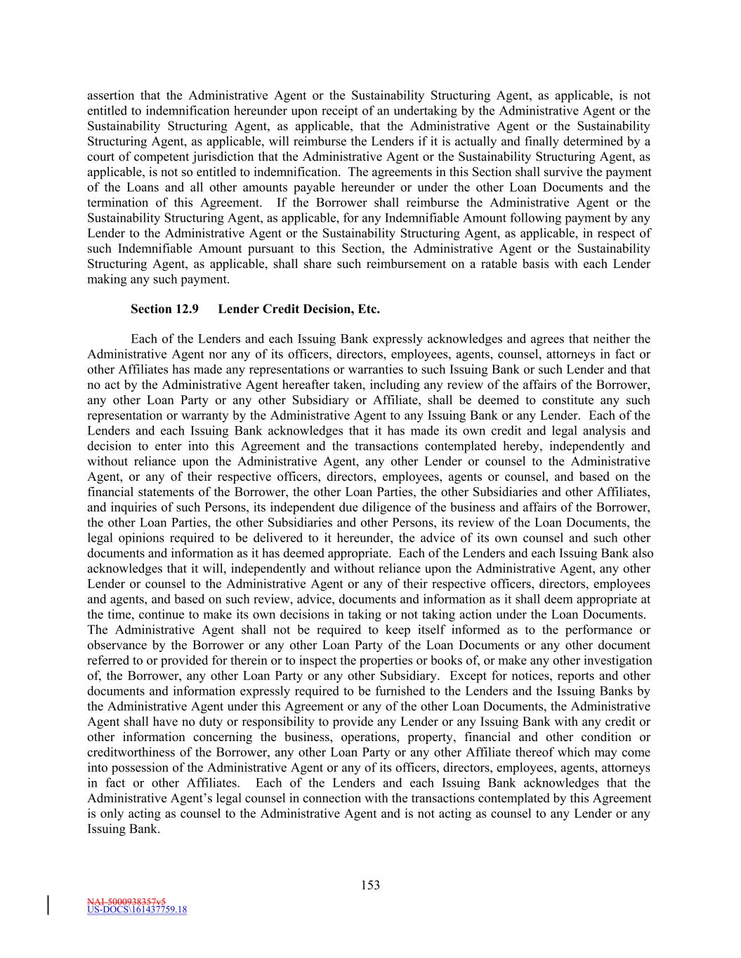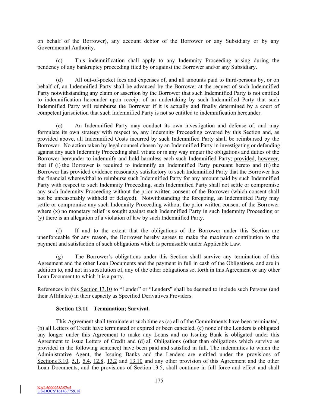 NAI-5000938357v5 US-DOCS\161437759.18 175 on behalf of the Borrower), any account debtor of the Borrower or any Subsidiary or by any Governmental Authority. (c) This indemnification shall apply to any Indemnity Proceeding arising during the pendency of any bankruptcy proceeding filed by or against the Borrower and/or any Subsidiary. (d) All out-of-pocket fees and expenses of, and all amounts paid to third-persons by, or on behalf of, an Indemnified Party shall be advanced by the Borrower at the request of such Indemnified Party notwithstanding any claim or assertion by the Borrower that such Indemnified Party is not entitled to indemnification hereunder upon receipt of an undertaking by such Indemnified Party that such Indemnified Party will reimburse the Borrower if it is actually and finally determined by a court of competent jurisdiction that such Indemnified Party is not so entitled to indemnification hereunder. (e) An Indemnified Party may conduct its own investigation and defense of, and may formulate its own strategy with respect to, any Indemnity Proceeding covered by this Section and, as provided above, all Indemnified Costs incurred by such Indemnified Party shall be reimbursed by the Borrower. No action taken by legal counsel chosen by an Indemnified Party in investigating or defending against any such Indemnity Proceeding shall vitiate or in any way impair the obligations and duties of the Borrower hereunder to indemnify and hold harmless each such Indemnified Party; provided, however, that if (i) the Borrower is required to indemnify an Indemnified Party pursuant hereto and (ii) the Borrower has provided evidence reasonably satisfactory to such Indemnified Party that the Borrower has the financial wherewithal to reimburse such Indemnified Party for any amount paid by such Indemnified Party with respect to such Indemnity Proceeding, such Indemnified Party shall not settle or compromise any such Indemnity Proceeding without the prior written consent of the Borrower (which consent shall not be unreasonably withheld or delayed). Notwithstanding the foregoing, an Indemnified Party may settle or compromise any such Indemnity Proceeding without the prior written consent of the Borrower where (x) no monetary relief is sought against such Indemnified Party in such Indemnity Proceeding or (y) there is an allegation of a violation of law by such Indemnified Party. (f) If and to the extent that the obligations of the Borrower under this Section are unenforceable for any reason, the Borrower hereby agrees to make the maximum contribution to the payment and satisfaction of such obligations which is permissible under Applicable Law. (g) The Borrower’s obligations under this Section shall survive any termination of this Agreement and the other Loan Documents and the payment in full in cash of the Obligations, and are in addition to, and not in substitution of, any of the other obligations set forth in this Agreement or any other Loan Document to which it is a party. References in this Section 13.10 to “Lender” or “Lenders” shall be deemed to include such Persons (and their Affiliates) in their capacity as Specified Derivatives Providers. Section 13.11 Termination; Survival. This Agreement shall terminate at such time as (a) all of the Commitments have been terminated, (b) all Letters of Credit have terminated or expired or been canceled, (c) none of the Lenders is obligated any longer under this Agreement to make any Loans and no Issuing Bank is obligated under this Agreement to issue Letters of Credit and (d) all Obligations (other than obligations which survive as provided in the following sentence) have been paid and satisfied in full. The indemnities to which the Administrative Agent, the Issuing Banks and the Lenders are entitled under the provisions of Sections 3.10, 5.1, 5.4, 12.8, 13.2 and 13.10 and any other provision of this Agreement and the other Loan Documents, and the provisions of Section 13.5, shall continue in full force and effect and shall