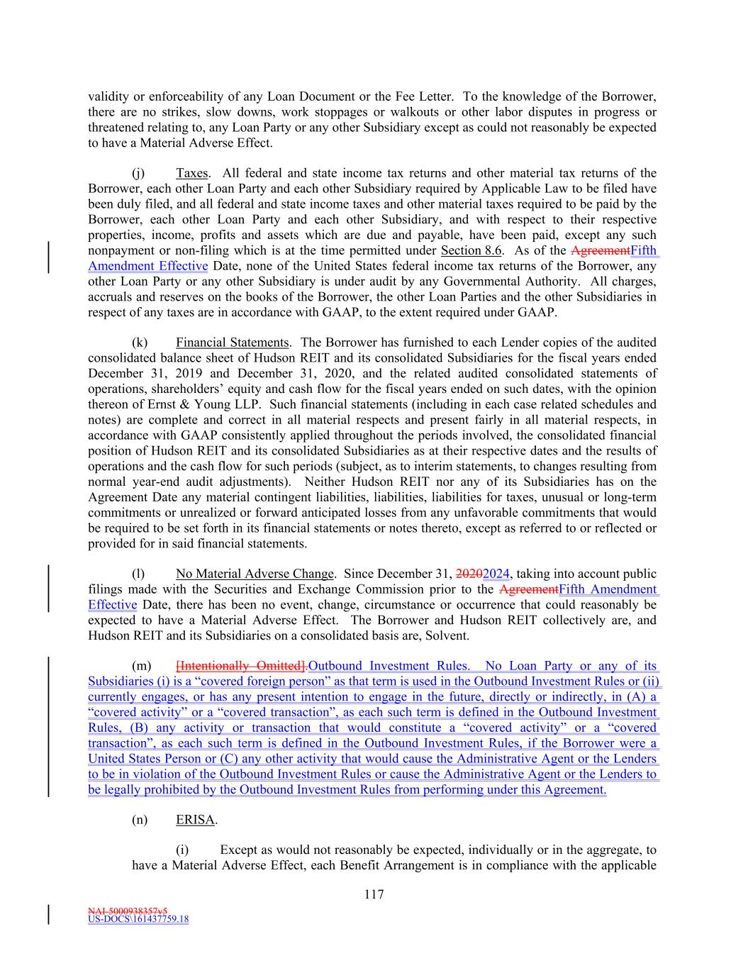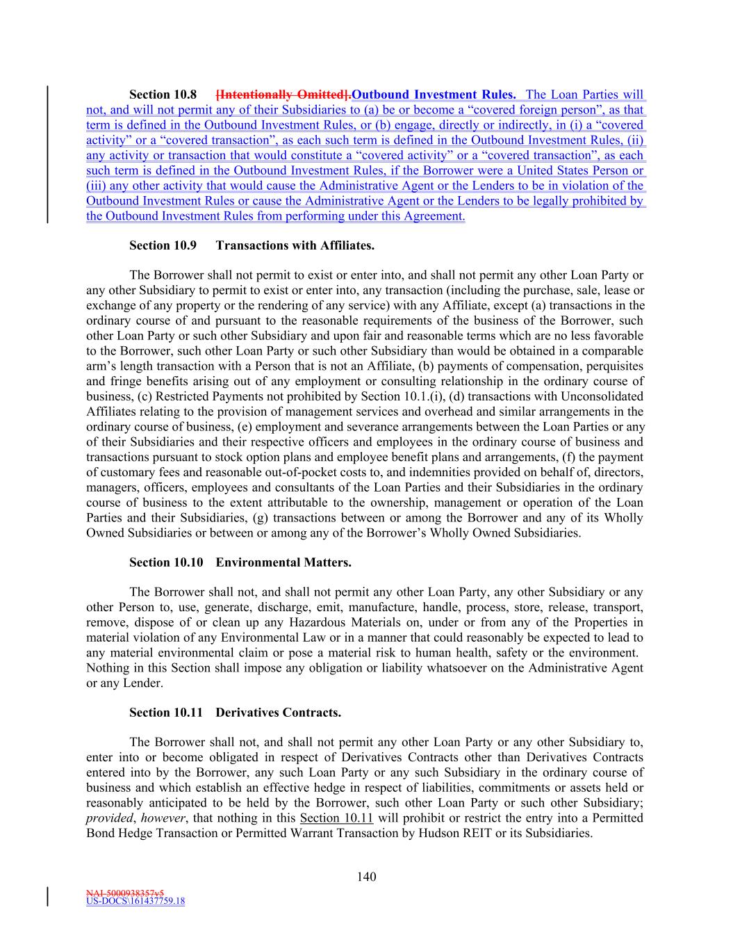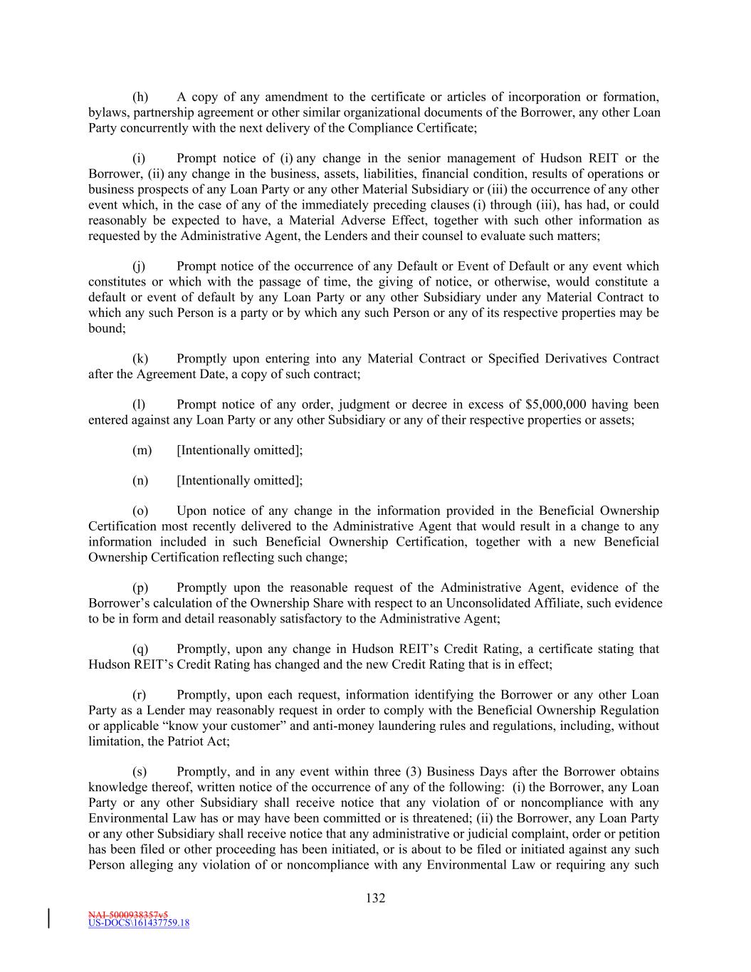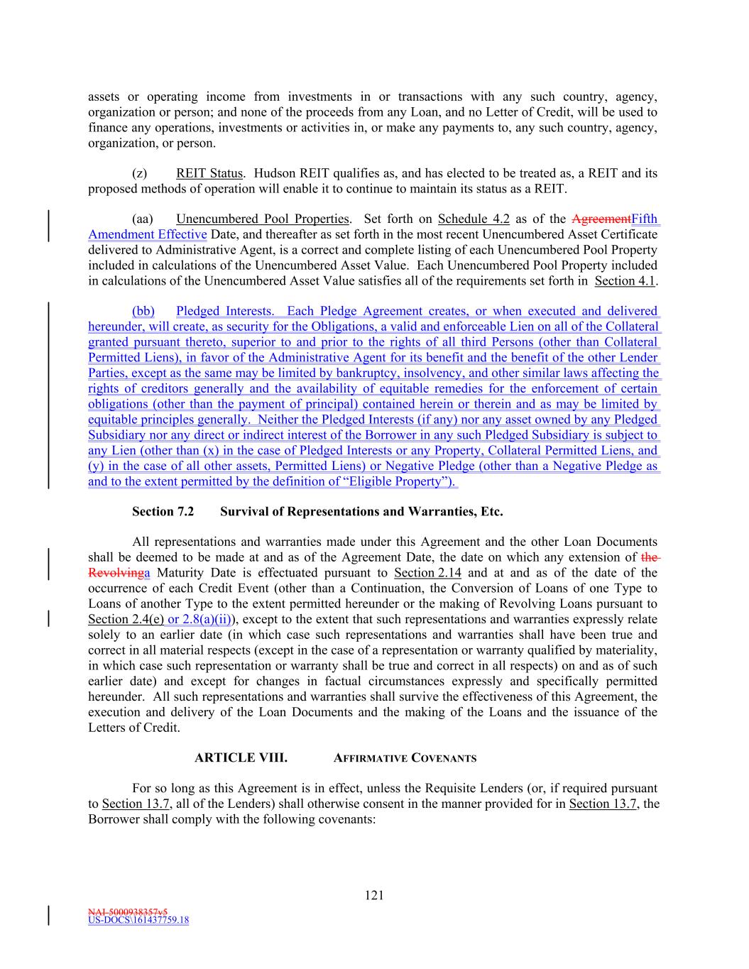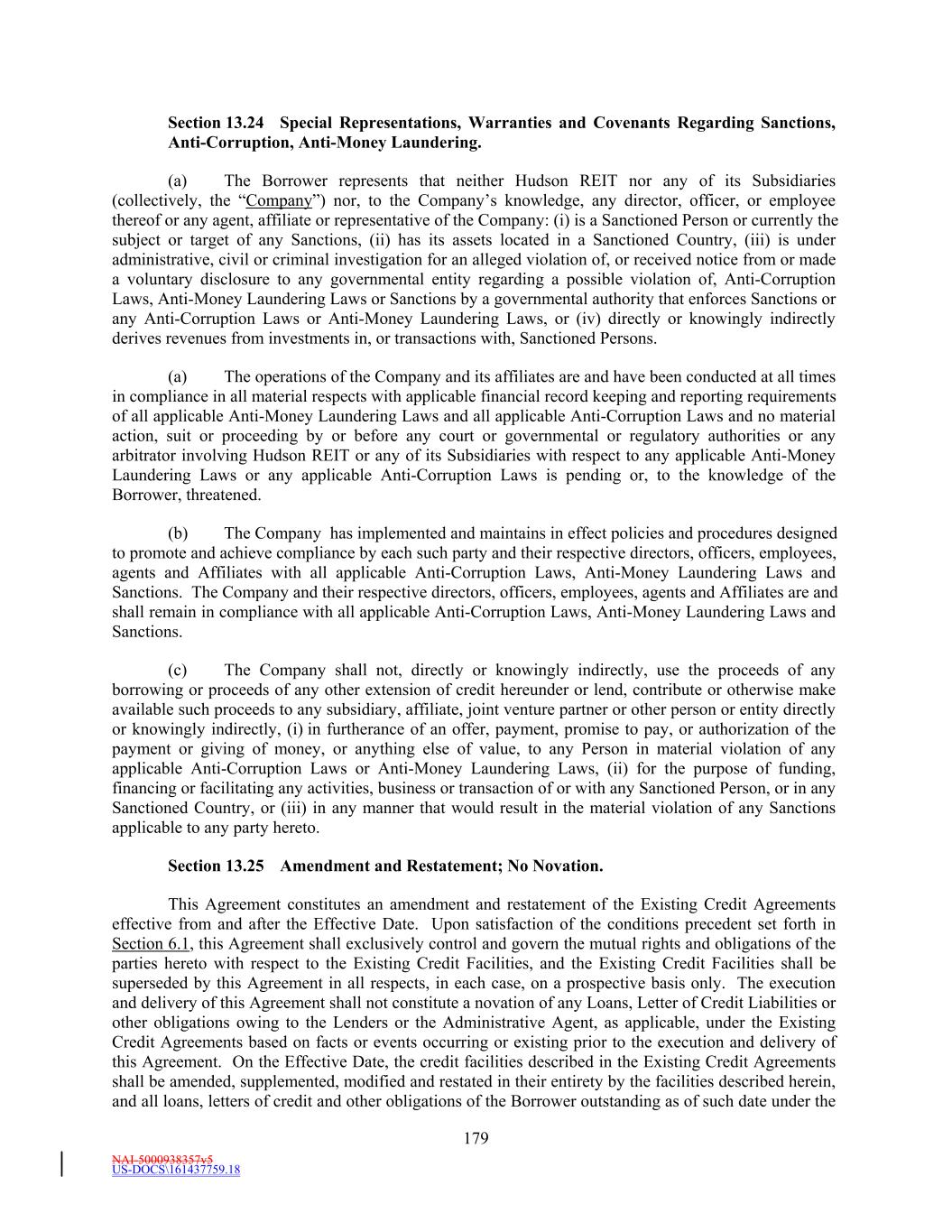 NAI-5000938357v5 US-DOCS\161437759.18 179 Section 13.24 Special Representations, Warranties and Covenants Regarding Sanctions, Anti-Corruption, Anti-Money Laundering. (a) The Borrower represents that neither Hudson REIT nor any of its Subsidiaries (collectively, the “Company”) nor, to the Company’s knowledge, any director, officer, or employee thereof or any agent, affiliate or representative of the Company: (i) is a Sanctioned Person or currently the subject or target of any Sanctions, (ii) has its assets located in a Sanctioned Country, (iii) is under administrative, civil or criminal investigation for an alleged violation of, or received notice from or made a voluntary disclosure to any governmental entity regarding a possible violation of, Anti-Corruption Laws, Anti-Money Laundering Laws or Sanctions by a governmental authority that enforces Sanctions or any Anti-Corruption Laws or Anti-Money Laundering Laws, or (iv) directly or knowingly indirectly derives revenues from investments in, or transactions with, Sanctioned Persons. (a) The operations of the Company and its affiliates are and have been conducted at all times in compliance in all material respects with applicable financial record keeping and reporting requirements of all applicable Anti-Money Laundering Laws and all applicable Anti-Corruption Laws and no material action, suit or proceeding by or before any court or governmental or regulatory authorities or any arbitrator involving Hudson REIT or any of its Subsidiaries with respect to any applicable Anti-Money Laundering Laws or any applicable Anti-Corruption Laws is pending or, to the knowledge of the Borrower, threatened. (b) The Company has implemented and maintains in effect policies and procedures designed to promote and achieve compliance by each such party and their respective directors, officers, employees, agents and Affiliates with all applicable Anti-Corruption Laws, Anti-Money Laundering Laws and Sanctions. The Company and their respective directors, officers, employees, agents and Affiliates are and shall remain in compliance with all applicable Anti-Corruption Laws, Anti-Money Laundering Laws and Sanctions. (c) The Company shall not, directly or knowingly indirectly, use the proceeds of any borrowing or proceeds of any other extension of credit hereunder or lend, contribute or otherwise make available such proceeds to any subsidiary, affiliate, joint venture partner or other person or entity directly or knowingly indirectly, (i) in furtherance of an offer, payment, promise to pay, or authorization of the payment or giving of money, or anything else of value, to any Person in material violation of any applicable Anti-Corruption Laws or Anti-Money Laundering Laws, (ii) for the purpose of funding, financing or facilitating any activities, business or transaction of or with any Sanctioned Person, or in any Sanctioned Country, or (iii) in any manner that would result in the material violation of any Sanctions applicable to any party hereto. Section 13.25 Amendment and Restatement; No Novation. This Agreement constitutes an amendment and restatement of the Existing Credit Agreements effective from and after the Effective Date. Upon satisfaction of the conditions precedent set forth in Section 6.1, this Agreement shall exclusively control and govern the mutual rights and obligations of the parties hereto with respect to the Existing Credit Facilities, and the Existing Credit Facilities shall be superseded by this Agreement in all respects, in each case, on a prospective basis only. The execution and delivery of this Agreement shall not constitute a novation of any Loans, Letter of Credit Liabilities or other obligations owing to the Lenders or the Administrative Agent, as applicable, under the Existing Credit Agreements based on facts or events occurring or existing prior to the execution and delivery of this Agreement. On the Effective Date, the credit facilities described in the Existing Credit Agreements shall be amended, supplemented, modified and restated in their entirety by the facilities described herein, and all loans, letters of credit and other obligations of the Borrower outstanding as of such date under the