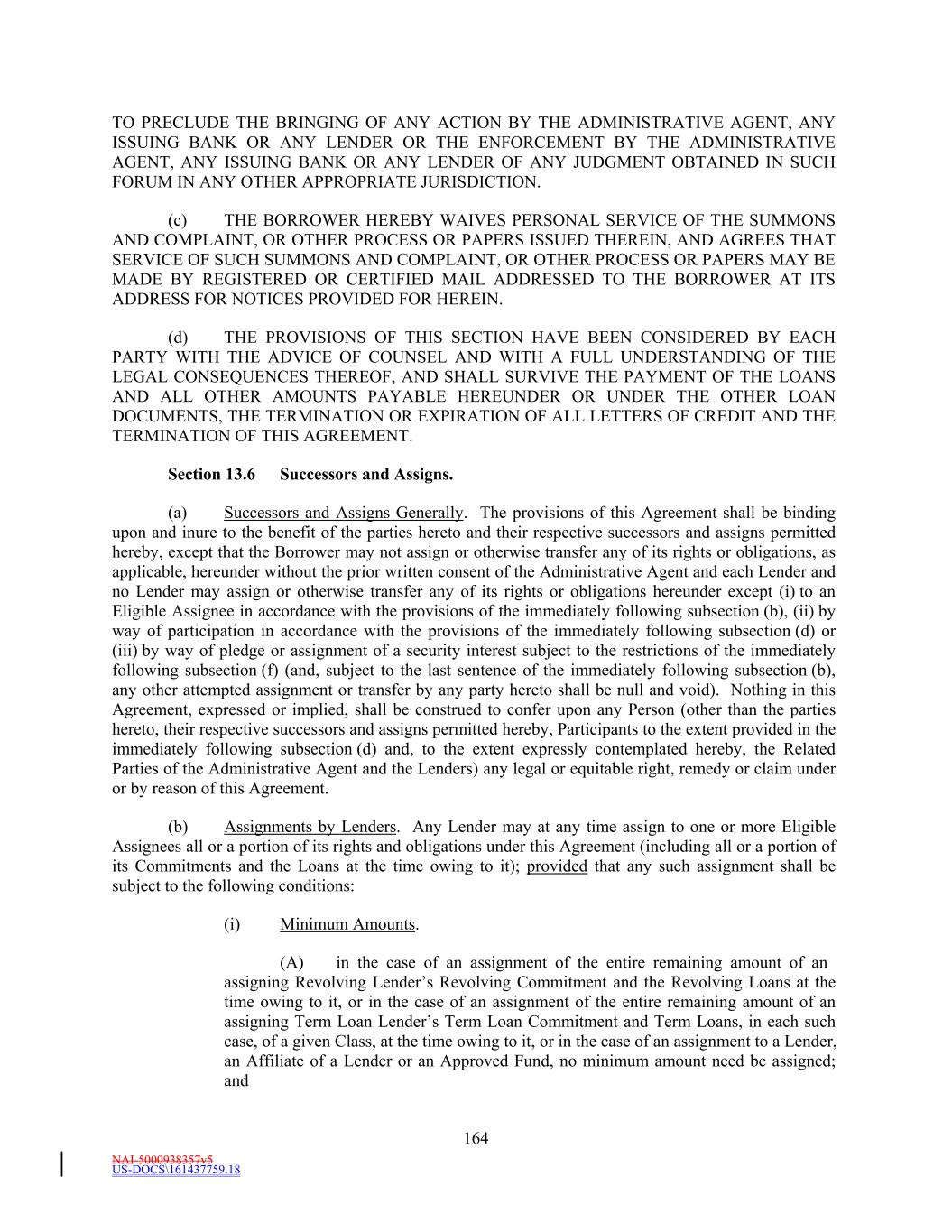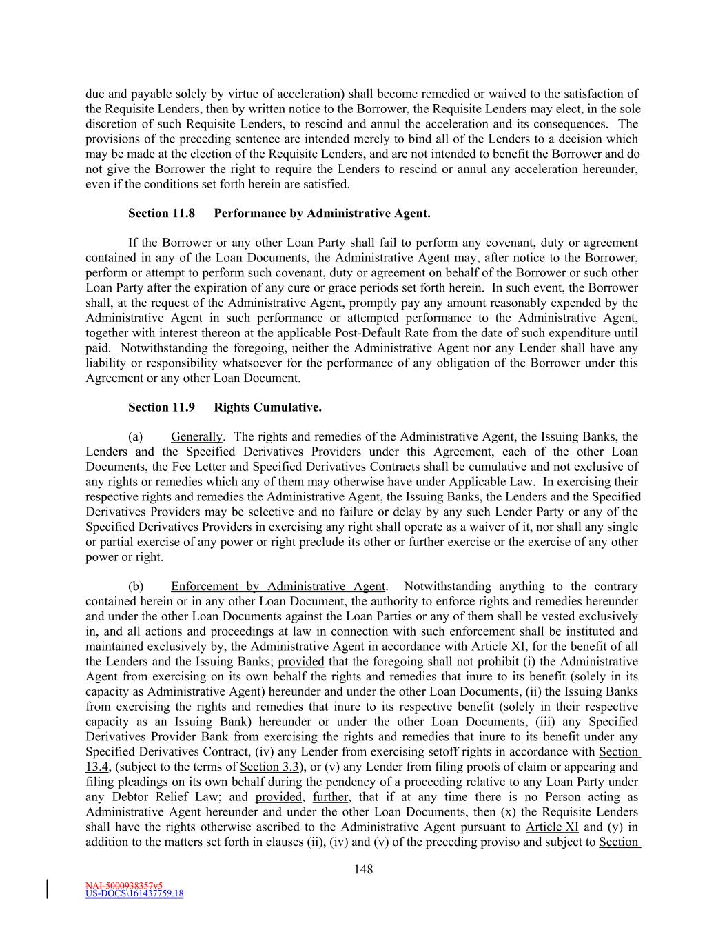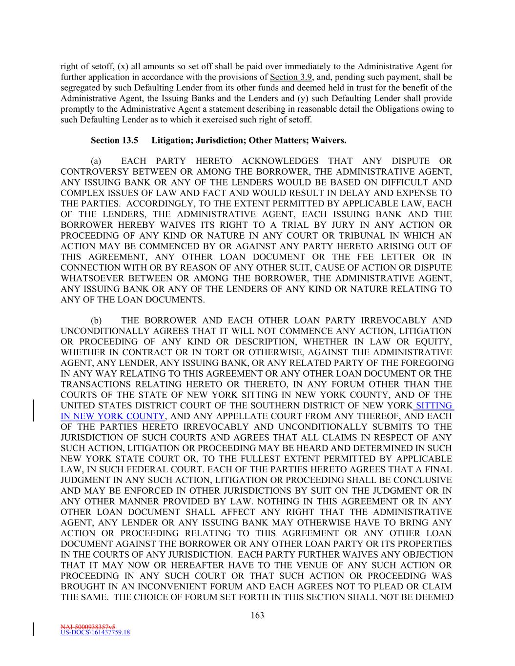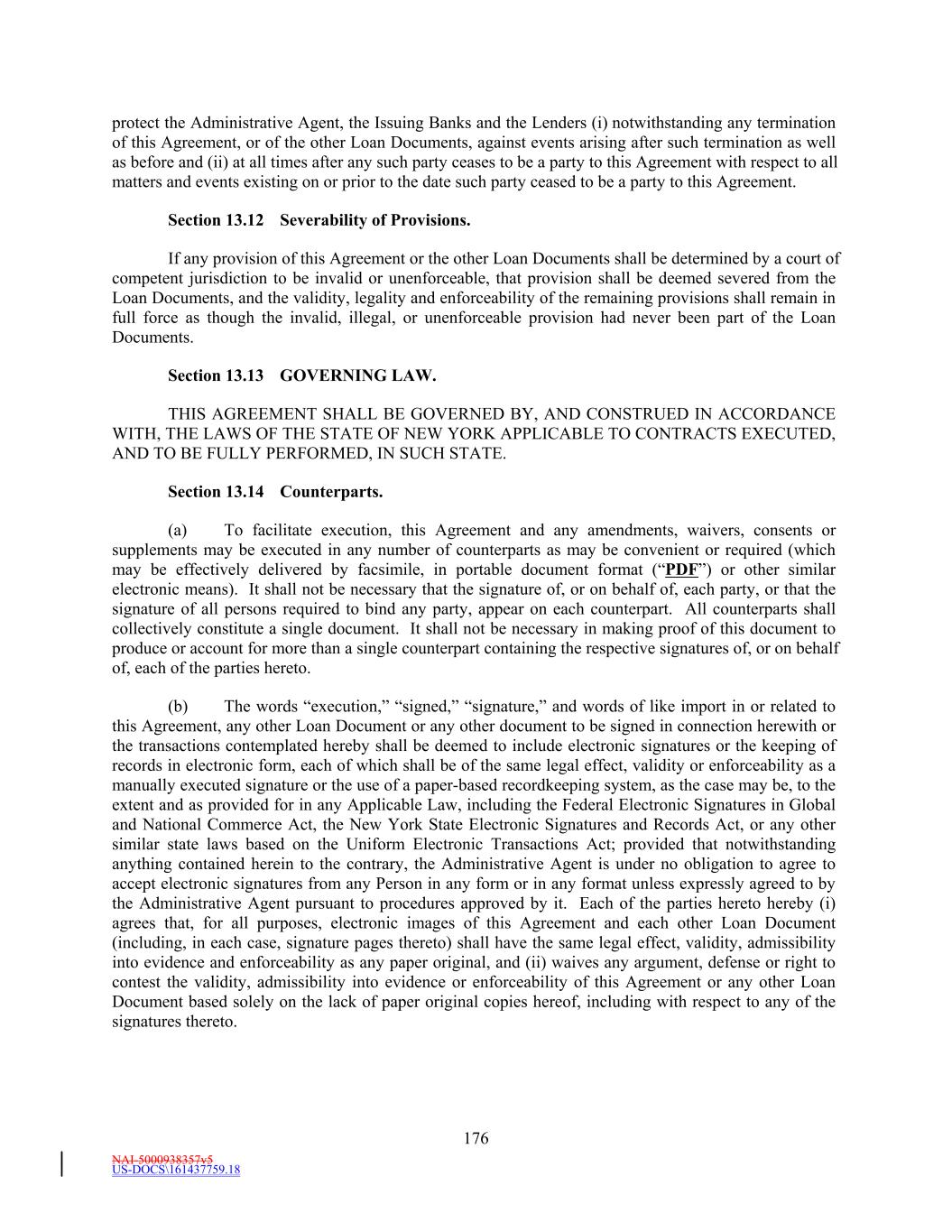 NAI-5000938357v5 US-DOCS\161437759.18 176 protect the Administrative Agent, the Issuing Banks and the Lenders (i) notwithstanding any termination of this Agreement, or of the other Loan Documents, against events arising after such termination as well as before and (ii) at all times after any such party ceases to be a party to this Agreement with respect to all matters and events existing on or prior to the date such party ceased to be a party to this Agreement. Section 13.12 Severability of Provisions. If any provision of this Agreement or the other Loan Documents shall be determined by a court of competent jurisdiction to be invalid or unenforceable, that provision shall be deemed severed from the Loan Documents, and the validity, legality and enforceability of the remaining provisions shall remain in full force as though the invalid, illegal, or unenforceable provision had never been part of the Loan Documents. Section 13.13 GOVERNING LAW. THIS AGREEMENT SHALL BE GOVERNED BY, AND CONSTRUED IN ACCORDANCE WITH, THE LAWS OF THE STATE OF NEW YORK APPLICABLE TO CONTRACTS EXECUTED, AND TO BE FULLY PERFORMED, IN SUCH STATE. Section 13.14 Counterparts. (a) To facilitate execution, this Agreement and any amendments, waivers, consents or supplements may be executed in any number of counterparts as may be convenient or required (which may be effectively delivered by facsimile, in portable document format (“PDF”) or other similar electronic means). It shall not be necessary that the signature of, or on behalf of, each party, or that the signature of all persons required to bind any party, appear on each counterpart. All counterparts shall collectively constitute a single document. It shall not be necessary in making proof of this document to produce or account for more than a single counterpart containing the respective signatures of, or on behalf of, each of the parties hereto. (b) The words “execution,” “signed,” “signature,” and words of like import in or related to this Agreement, any other Loan Document or any other document to be signed in connection herewith or the transactions contemplated hereby shall be deemed to include electronic signatures or the keeping of records in electronic form, each of which shall be of the same legal effect, validity or enforceability as a manually executed signature or the use of a paper-based recordkeeping system, as the case may be, to the extent and as provided for in any Applicable Law, including the Federal Electronic Signatures in Global and National Commerce Act, the New York State Electronic Signatures and Records Act, or any other similar state laws based on the Uniform Electronic Transactions Act; provided that notwithstanding anything contained herein to the contrary, the Administrative Agent is under no obligation to agree to accept electronic signatures from any Person in any form or in any format unless expressly agreed to by the Administrative Agent pursuant to procedures approved by it. Each of the parties hereto hereby (i) agrees that, for all purposes, electronic images of this Agreement and each other Loan Document (including, in each case, signature pages thereto) shall have the same legal effect, validity, admissibility into evidence and enforceability as any paper original, and (ii) waives any argument, defense or right to contest the validity, admissibility into evidence or enforceability of this Agreement or any other Loan Document based solely on the lack of paper original copies hereof, including with respect to any of the signatures thereto.