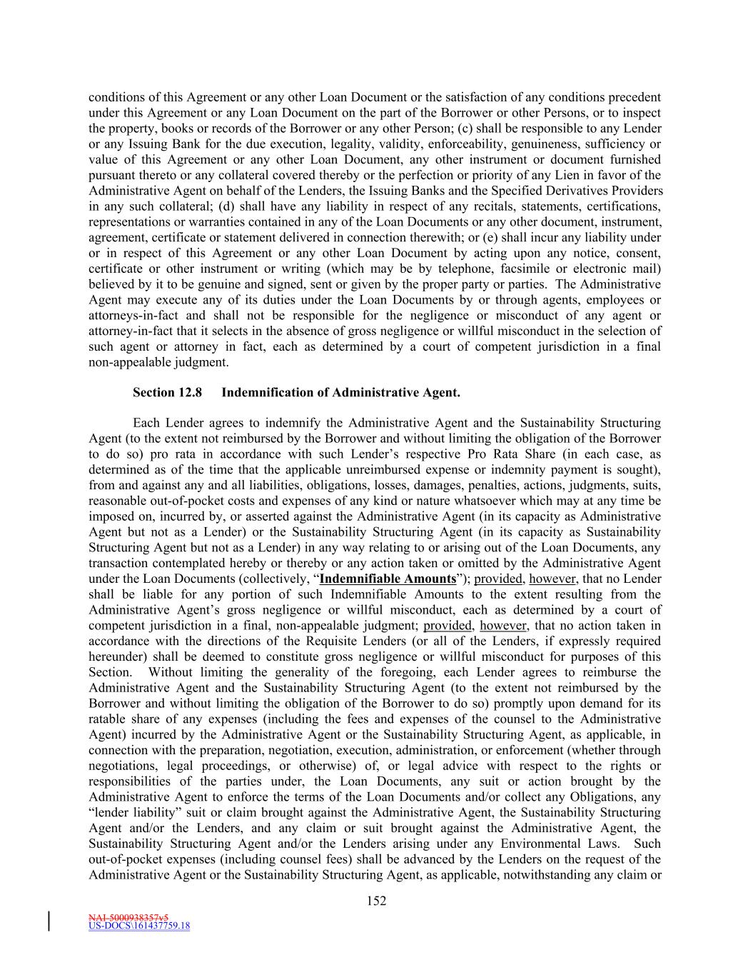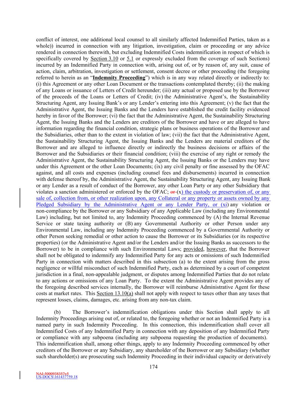 NAI-5000938357v5 US-DOCS\161437759.18 174 conflict of interest, one additional local counsel to all similarly affected Indemnified Parties, taken as a whole)) incurred in connection with any litigation, investigation, claim or proceeding or any advice rendered in connection therewith, but excluding Indemnified Costs indemnification in respect of which is specifically covered by Section 3.10 or 5.1 or expressly excluded from the coverage of such Sections) incurred by an Indemnified Party in connection with, arising out of, or by reason of, any suit, cause of action, claim, arbitration, investigation or settlement, consent decree or other proceeding (the foregoing referred to herein as an “Indemnity Proceeding”) which is in any way related directly or indirectly to: (i) this Agreement or any other Loan Document or the transactions contemplated thereby; (ii) the making of any Loans or issuance of Letters of Credit hereunder; (iii) any actual or proposed use by the Borrower of the proceeds of the Loans or Letters of Credit; (iv) the Administrative Agent’s, the Sustainability Structuring Agent, any Issuing Bank’s or any Lender’s entering into this Agreement; (v) the fact that the Administrative Agent, the Issuing Banks and the Lenders have established the credit facility evidenced hereby in favor of the Borrower; (vi) the fact that the Administrative Agent, the Sustainability Structuring Agent, the Issuing Banks and the Lenders are creditors of the Borrower and have or are alleged to have information regarding the financial condition, strategic plans or business operations of the Borrower and the Subsidiaries, other than to the extent in violation of law; (vii) the fact that the Administrative Agent, the Sustainability Structuring Agent, the Issuing Banks and the Lenders are material creditors of the Borrower and are alleged to influence directly or indirectly the business decisions or affairs of the Borrower and the Subsidiaries or their financial condition; (viii) the exercise of any right or remedy the Administrative Agent, the Sustainability Structuring Agent, the Issuing Banks or the Lenders may have under this Agreement or the other Loan Documents; (ix) any civil penalty or fine assessed by the OFAC against, and all costs and expenses (including counsel fees and disbursements) incurred in connection with defense thereof by, the Administrative Agent, the Sustainability Structuring Agent, any Issuing Bank or any Lender as a result of conduct of the Borrower, any other Loan Party or any other Subsidiary that violates a sanction administered or enforced by the OFAC; or (x) the custody or preservation of, or any sale of, collection from, or other realization upon, any Collateral or any property or assets owned by any Pledged Subsidiary by the Administrative Agent or any Lender Party, or (xi) any violation or non-compliance by the Borrower or any Subsidiary of any Applicable Law (including any Environmental Law) including, but not limited to, any Indemnity Proceeding commenced by (A) the Internal Revenue Service or state taxing authority or (B) any Governmental Authority or other Person under any Environmental Law, including any Indemnity Proceeding commenced by a Governmental Authority or other Person seeking remedial or other action to cause the Borrower or its Subsidiaries (or its respective properties) (or the Administrative Agent and/or the Lenders and/or the Issuing Banks as successors to the Borrower) to be in compliance with such Environmental Laws; provided, however, that the Borrower shall not be obligated to indemnify any Indemnified Party for any acts or omissions of such Indemnified Party in connection with matters described in this subsection (a) to the extent arising from the gross negligence or willful misconduct of such Indemnified Party, each as determined by a court of competent jurisdiction in a final, non-appealable judgment, or disputes among Indemnified Parties that do not relate to any actions or omissions of any Loan Party. To the extent the Administrative Agent provides any of the foregoing described services internally, the Borrower will reimburse Administrative Agent for these costs at market rates. This Section 13.10(a) shall not apply with respect to taxes other than any taxes that represent losses, claims, damages, etc. arising from any non-tax claim. (b) The Borrower’s indemnification obligations under this Section shall apply to all Indemnity Proceedings arising out of, or related to, the foregoing whether or not an Indemnified Party is a named party in such Indemnity Proceeding. In this connection, this indemnification shall cover all Indemnified Costs of any Indemnified Party in connection with any deposition of any Indemnified Party or compliance with any subpoena (including any subpoena requesting the production of documents). This indemnification shall, among other things, apply to any Indemnity Proceeding commenced by other creditors of the Borrower or any Subsidiary, any shareholder of the Borrower or any Subsidiary (whether such shareholder(s) are prosecuting such Indemnity Proceeding in their individual capacity or derivatively