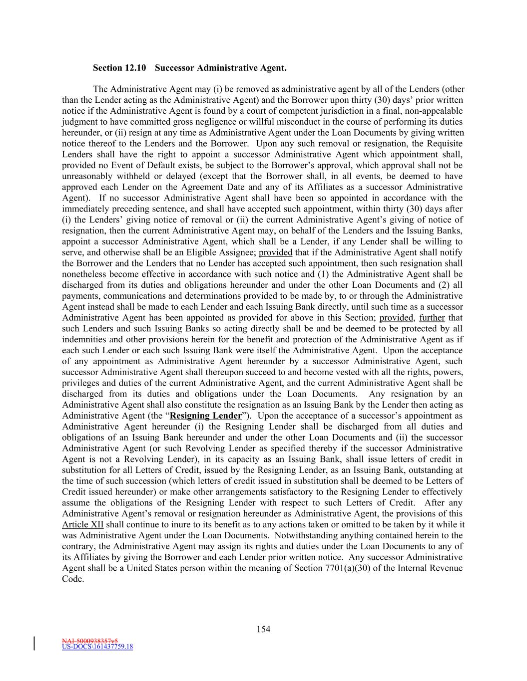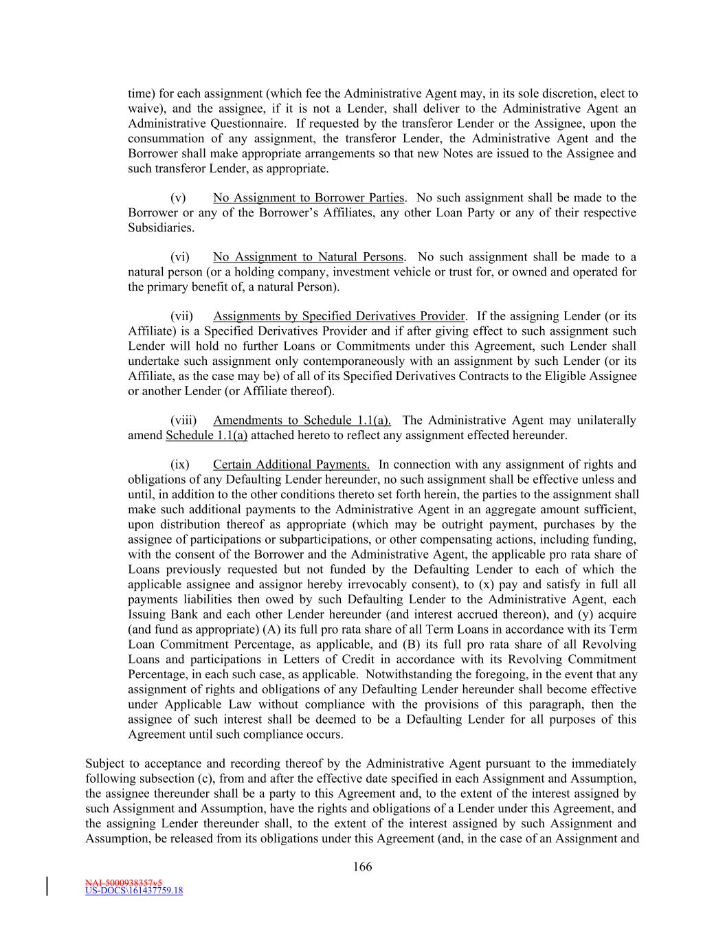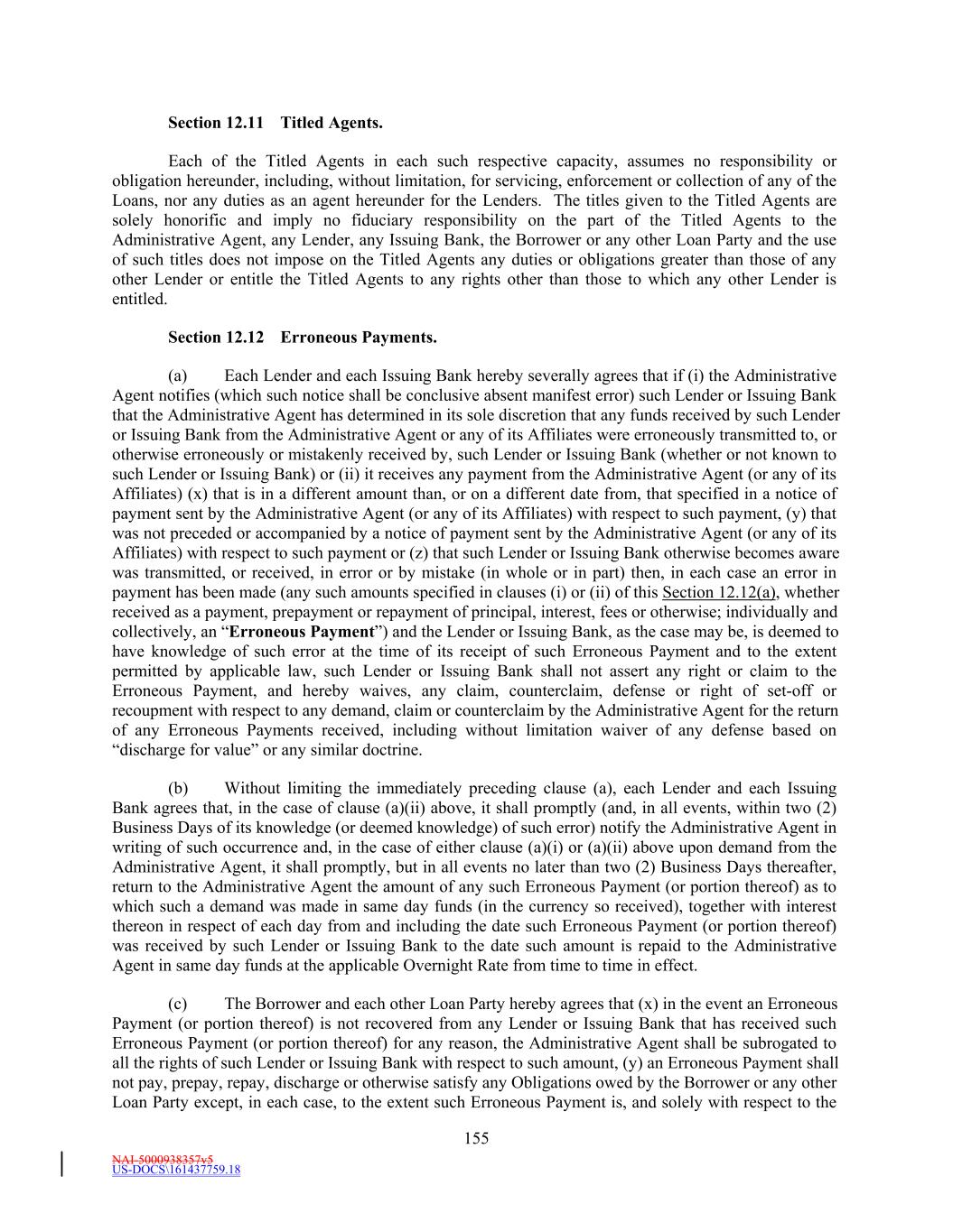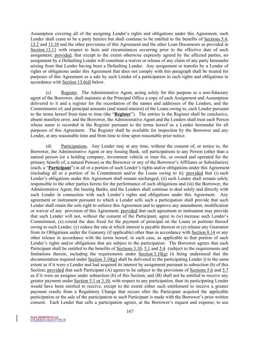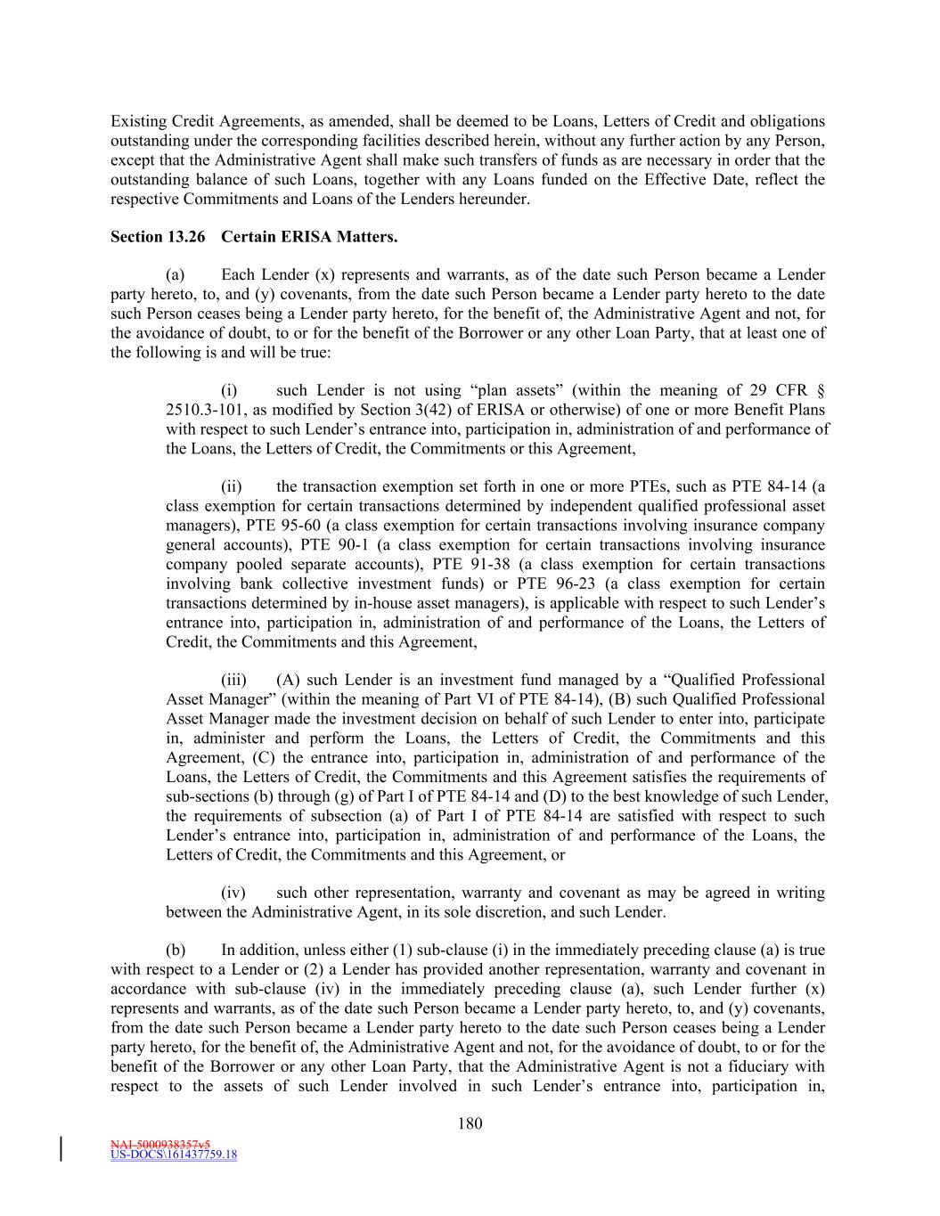 NAI-5000938357v5 US-DOCS\161437759.18 180 Existing Credit Agreements, as amended, shall be deemed to be Loans, Letters of Credit and obligations outstanding under the corresponding facilities described herein, without any further action by any Person, except that the Administrative Agent shall make such transfers of funds as are necessary in order that the outstanding balance of such Loans, together with any Loans funded on the Effective Date, reflect the respective Commitments and Loans of the Lenders hereunder. Section 13.26 Certain ERISA Matters. (a) Each Lender (x) represents and warrants, as of the date such Person became a Lender party hereto, to, and (y) covenants, from the date such Person became a Lender party hereto to the date such Person ceases being a Lender party hereto, for the benefit of, the Administrative Agent and not, for the avoidance of doubt, to or for the benefit of the Borrower or any other Loan Party, that at least one of the following is and will be true: (i) such Lender is not using “plan assets” (within the meaning of 29 CFR § 2510.3-101, as modified by Section 3(42) of ERISA or otherwise) of one or more Benefit Plans with respect to such Lender’s entrance into, participation in, administration of and performance of the Loans, the Letters of Credit, the Commitments or this Agreement, (ii) the transaction exemption set forth in one or more PTEs, such as PTE 84-14 (a class exemption for certain transactions determined by independent qualified professional asset managers), PTE 95-60 (a class exemption for certain transactions involving insurance company general accounts), PTE 90-1 (a class exemption for certain transactions involving insurance company pooled separate accounts), PTE 91-38 (a class exemption for certain transactions involving bank collective investment funds) or PTE 96-23 (a class exemption for certain transactions determined by in-house asset managers), is applicable with respect to such Lender’s entrance into, participation in, administration of and performance of the Loans, the Letters of Credit, the Commitments and this Agreement, (iii) (A) such Lender is an investment fund managed by a “Qualified Professional Asset Manager” (within the meaning of Part VI of PTE 84-14), (B) such Qualified Professional Asset Manager made the investment decision on behalf of such Lender to enter into, participate in, administer and perform the Loans, the Letters of Credit, the Commitments and this Agreement, (C) the entrance into, participation in, administration of and performance of the Loans, the Letters of Credit, the Commitments and this Agreement satisfies the requirements of sub-sections (b) through (g) of Part I of PTE 84-14 and (D) to the best knowledge of such Lender, the requirements of subsection (a) of Part I of PTE 84-14 are satisfied with respect to such Lender’s entrance into, participation in, administration of and performance of the Loans, the Letters of Credit, the Commitments and this Agreement, or (iv) such other representation, warranty and covenant as may be agreed in writing between the Administrative Agent, in its sole discretion, and such Lender. (b) In addition, unless either (1) sub-clause (i) in the immediately preceding clause (a) is true with respect to a Lender or (2) a Lender has provided another representation, warranty and covenant in accordance with sub-clause (iv) in the immediately preceding clause (a), such Lender further (x) represents and warrants, as of the date such Person became a Lender party hereto, to, and (y) covenants, from the date such Person became a Lender party hereto to the date such Person ceases being a Lender party hereto, for the benefit of, the Administrative Agent and not, for the avoidance of doubt, to or for the benefit of the Borrower or any other Loan Party, that the Administrative Agent is not a fiduciary with respect to the assets of such Lender involved in such Lender’s entrance into, participation in,