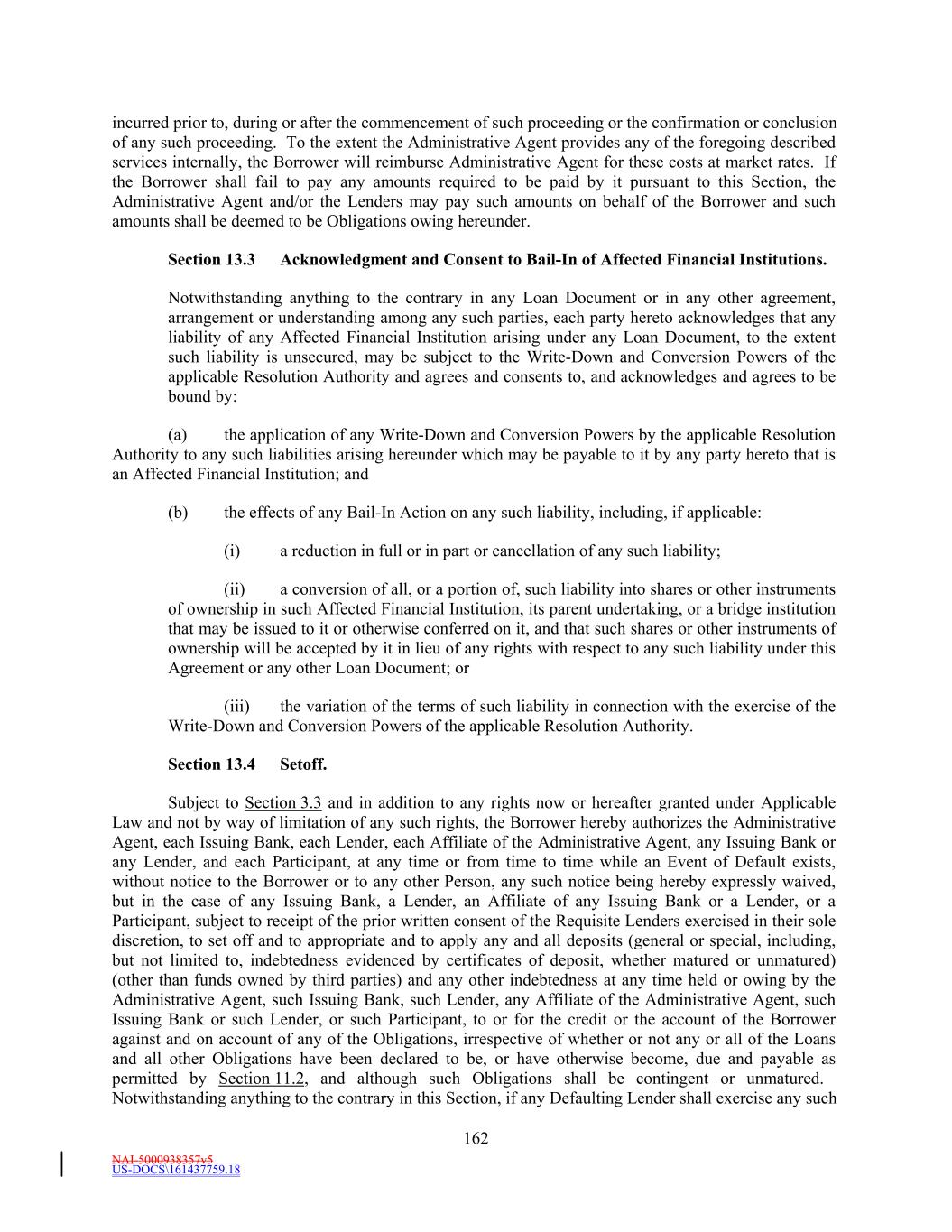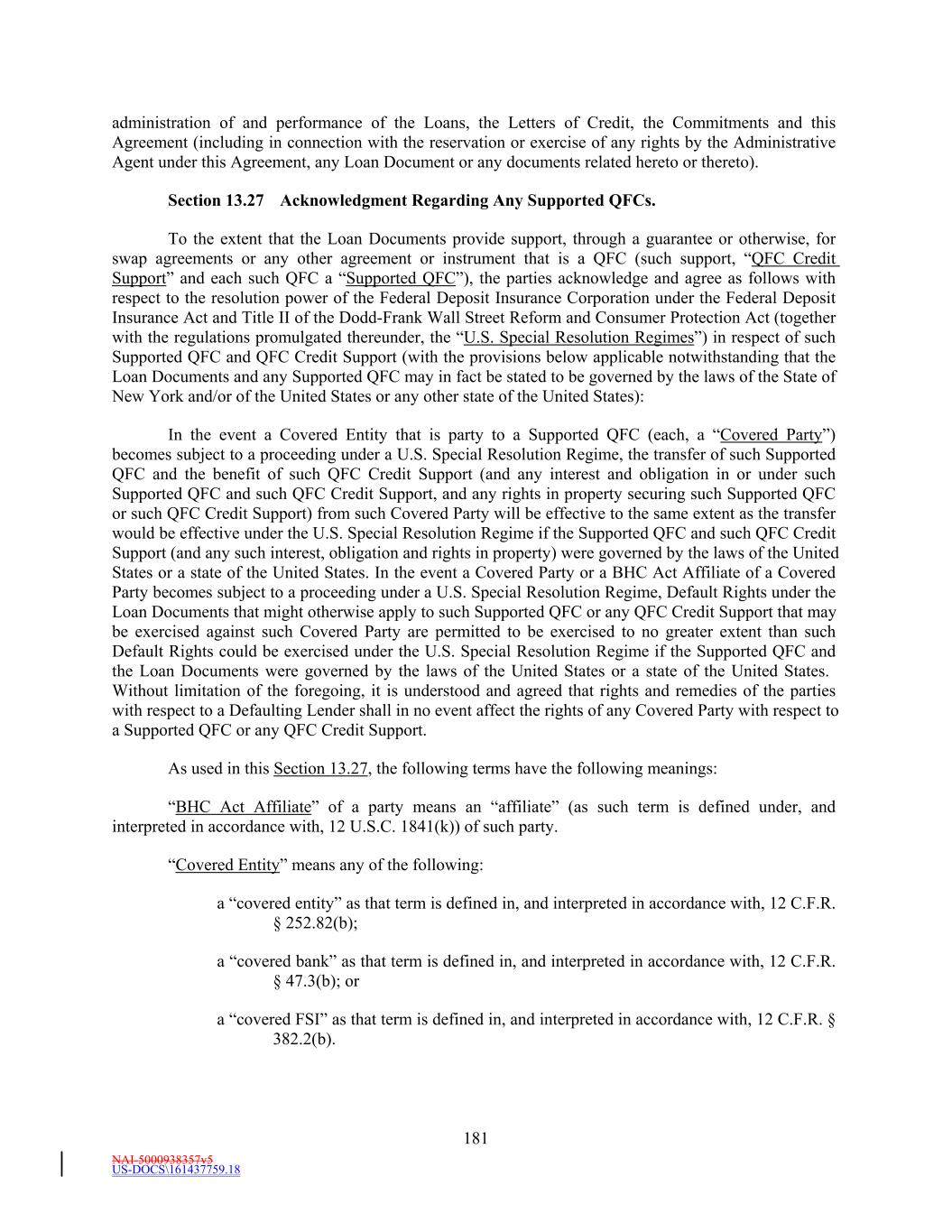NAI-5000938357v5 US-DOCS\161437759.18 181 administration of and performance of the Loans, the Letters of Credit, the Commitments and this Agreement (including in connection with the reservation or exercise of any rights by the Administrative Agent under this Agreement, any Loan Document or any documents related hereto or thereto). Section 13.27 Acknowledgment Regarding Any Supported QFCs. To the extent that the Loan Documents provide support, through a guarantee or otherwise, for swap agreements or any other agreement or instrument that is a QFC (such support, “QFC Credit Support” and each such QFC a “Supported QFC”), the parties acknowledge and agree as follows with respect to the resolution power of the Federal Deposit Insurance Corporation under the Federal Deposit Insurance Act and Title II of the Dodd-Frank Wall Street Reform and Consumer Protection Act (together with the regulations promulgated thereunder, the “U.S. Special Resolution Regimes”) in respect of such Supported QFC and QFC Credit Support (with the provisions below applicable notwithstanding that the Loan Documents and any Supported QFC may in fact be stated to be governed by the laws of the State of New York and/or of the United States or any other state of the United States): In the event a Covered Entity that is party to a Supported QFC (each, a “Covered Party”) becomes subject to a proceeding under a U.S. Special Resolution Regime, the transfer of such Supported QFC and the benefit of such QFC Credit Support (and any interest and obligation in or under such Supported QFC and such QFC Credit Support, and any rights in property securing such Supported QFC or such QFC Credit Support) from such Covered Party will be effective to the same extent as the transfer would be effective under the U.S. Special Resolution Regime if the Supported QFC and such QFC Credit Support (and any such interest, obligation and rights in property) were governed by the laws of the United States or a state of the United States. In the event a Covered Party or a BHC Act Affiliate of a Covered Party becomes subject to a proceeding under a U.S. Special Resolution Regime, Default Rights under the Loan Documents that might otherwise apply to such Supported QFC or any QFC Credit Support that may be exercised against such Covered Party are permitted to be exercised to no greater extent than such Default Rights could be exercised under the U.S. Special Resolution Regime if the Supported QFC and the Loan Documents were governed by the laws of the United States or a state of the United States. Without limitation of the foregoing, it is understood and agreed that rights and remedies of the parties with respect to a Defaulting Lender shall in no event affect the rights of any Covered Party with respect to a Supported QFC or any QFC Credit Support. As used in this Section 13.27, the following terms have the following meanings: “BHC Act Affiliate” of a party means an “affiliate” (as such term is defined under, and interpreted in accordance with, 12 U.S.C. 1841(k)) of such party. “Covered Entity” means any of the following: a “covered entity” as that term is defined in, and interpreted in accordance with, 12 C.F.R. § 252.82(b); a “covered bank” as that term is defined in, and interpreted in accordance with, 12 C.F.R. § 47.3(b); or a “covered FSI” as that term is defined in, and interpreted in accordance with, 12 C.F.R. § 382.2(b).