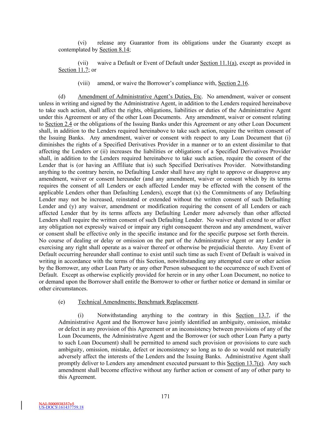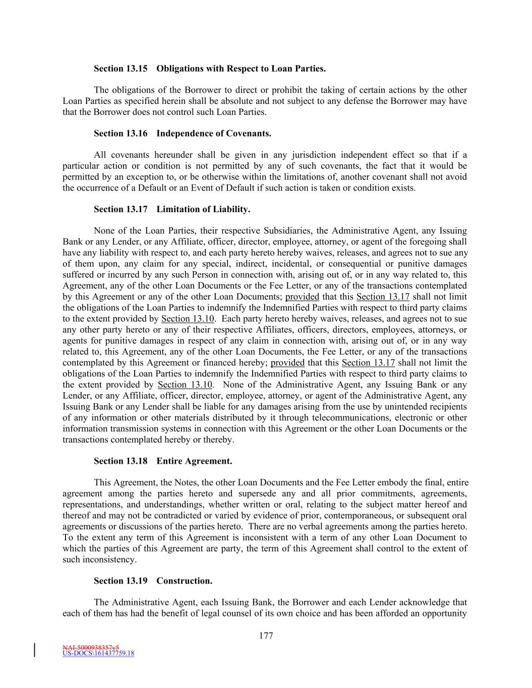 NAI-5000938357v5 US-DOCS\161437759.18 177 Section 13.15 Obligations with Respect to Loan Parties. The obligations of the Borrower to direct or prohibit the taking of certain actions by the other Loan Parties as specified herein shall be absolute and not subject to any defense the Borrower may have that the Borrower does not control such Loan Parties. Section 13.16 Independence of Covenants. All covenants hereunder shall be given in any jurisdiction independent effect so that if a particular action or condition is not permitted by any of such covenants, the fact that it would be permitted by an exception to, or be otherwise within the limitations of, another covenant shall not avoid the occurrence of a Default or an Event of Default if such action is taken or condition exists. Section 13.17 Limitation of Liability. None of the Loan Parties, their respective Subsidiaries, the Administrative Agent, any Issuing Bank or any Lender, or any Affiliate, officer, director, employee, attorney, or agent of the foregoing shall have any liability with respect to, and each party hereto hereby waives, releases, and agrees not to sue any of them upon, any claim for any special, indirect, incidental, or consequential or punitive damages suffered or incurred by any such Person in connection with, arising out of, or in any way related to, this Agreement, any of the other Loan Documents or the Fee Letter, or any of the transactions contemplated by this Agreement or any of the other Loan Documents; provided that this Section 13.17 shall not limit the obligations of the Loan Parties to indemnify the Indemnified Parties with respect to third party claims to the extent provided by Section 13.10. Each party hereto hereby waives, releases, and agrees not to sue any other party hereto or any of their respective Affiliates, officers, directors, employees, attorneys, or agents for punitive damages in respect of any claim in connection with, arising out of, or in any way related to, this Agreement, any of the other Loan Documents, the Fee Letter, or any of the transactions contemplated by this Agreement or financed hereby; provided that this Section 13.17 shall not limit the obligations of the Loan Parties to indemnify the Indemnified Parties with respect to third party claims to the extent provided by Section 13.10. None of the Administrative Agent, any Issuing Bank or any Lender, or any Affiliate, officer, director, employee, attorney, or agent of the Administrative Agent, any Issuing Bank or any Lender shall be liable for any damages arising from the use by unintended recipients of any information or other materials distributed by it through telecommunications, electronic or other information transmission systems in connection with this Agreement or the other Loan Documents or the transactions contemplated hereby or thereby. Section 13.18 Entire Agreement. This Agreement, the Notes, the other Loan Documents and the Fee Letter embody the final, entire agreement among the parties hereto and supersede any and all prior commitments, agreements, representations, and understandings, whether written or oral, relating to the subject matter hereof and thereof and may not be contradicted or varied by evidence of prior, contemporaneous, or subsequent oral agreements or discussions of the parties hereto. There are no verbal agreements among the parties hereto. To the extent any term of this Agreement is inconsistent with a term of any other Loan Document to which the parties of this Agreement are party, the term of this Agreement shall control to the extent of such inconsistency. Section 13.19 Construction. The Administrative Agent, each Issuing Bank, the Borrower and each Lender acknowledge that each of them has had the benefit of legal counsel of its own choice and has been afforded an opportunity